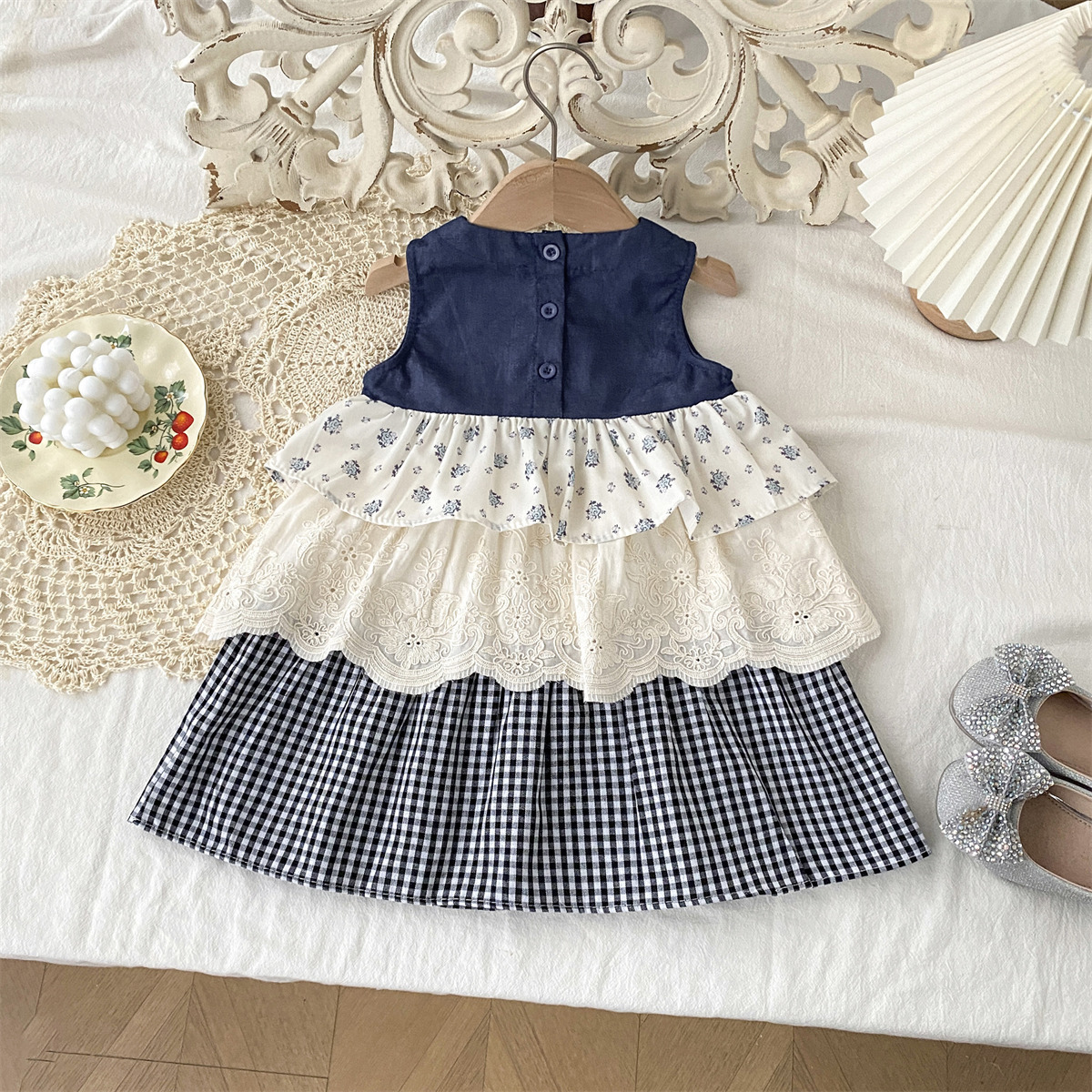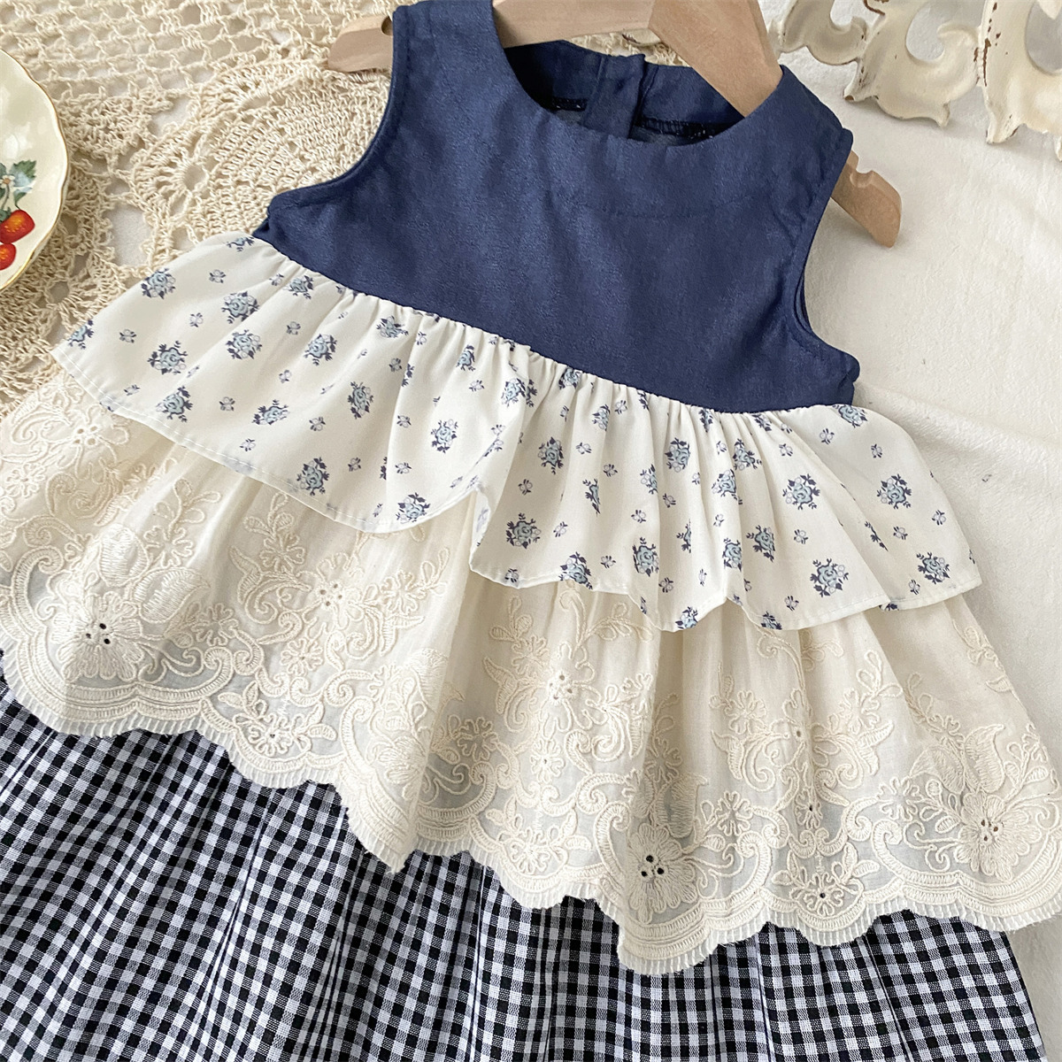 아기 소녀를위한 새로운 모리 스타일 민소매 베스 세트 원피스 꽃 무늬 스티칭 데님 스커트 오버랩 케이크 스커트