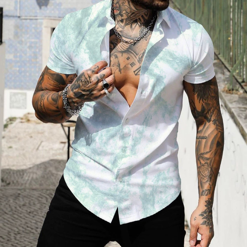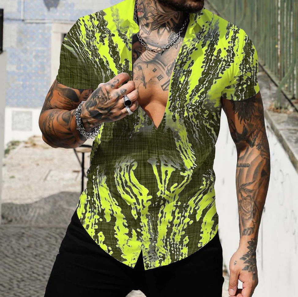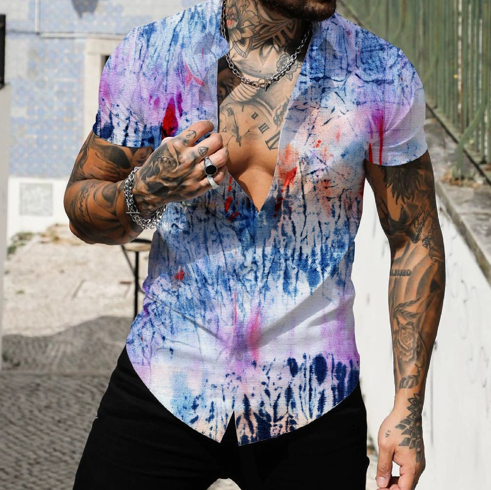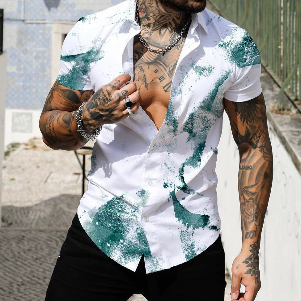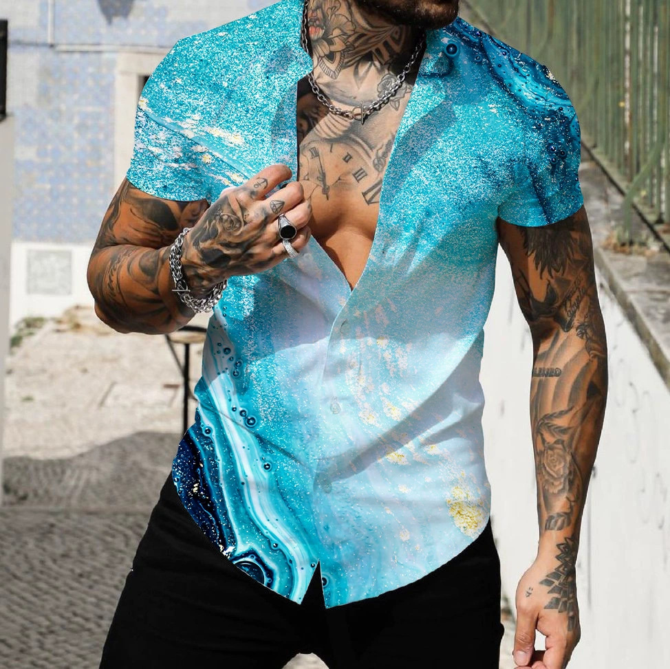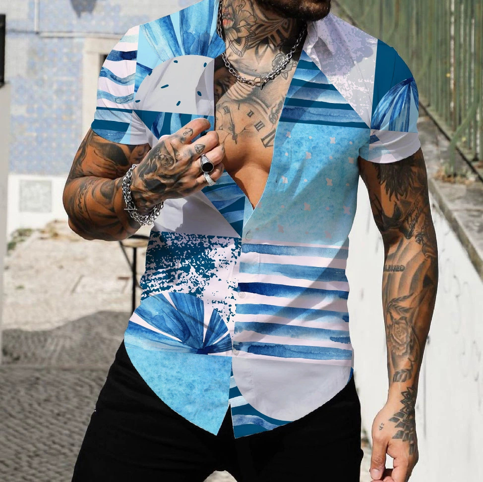2025 해변 서핑 남자 셔츠 유럽과 미국 대외 무역 3D 디지털 기하학 하와이 인쇄 근육 짧은 소매