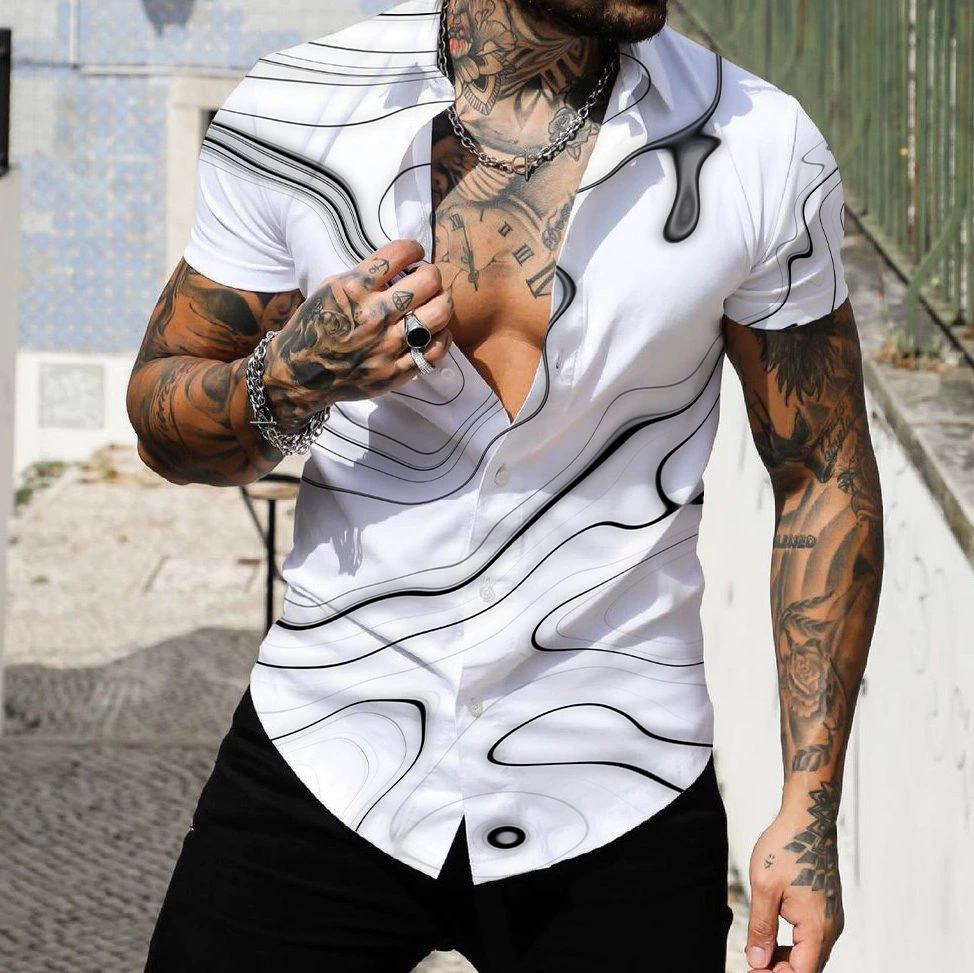 2025 해변 서핑 남자 셔츠 유럽과 미국 대외 무역 3D 디지털 기하학 하와이 인쇄 근육 짧은 소매스토어 가기