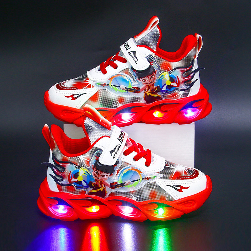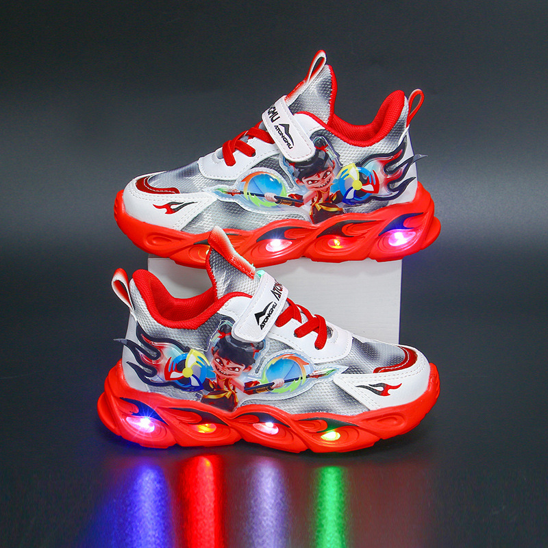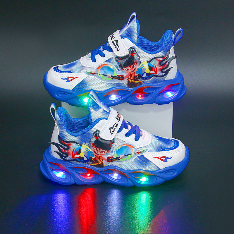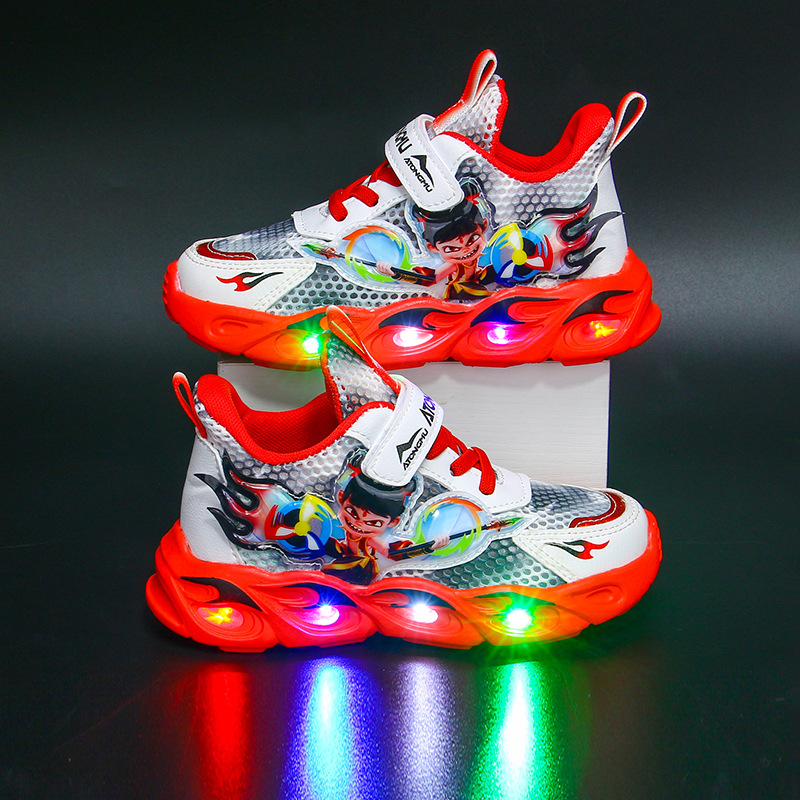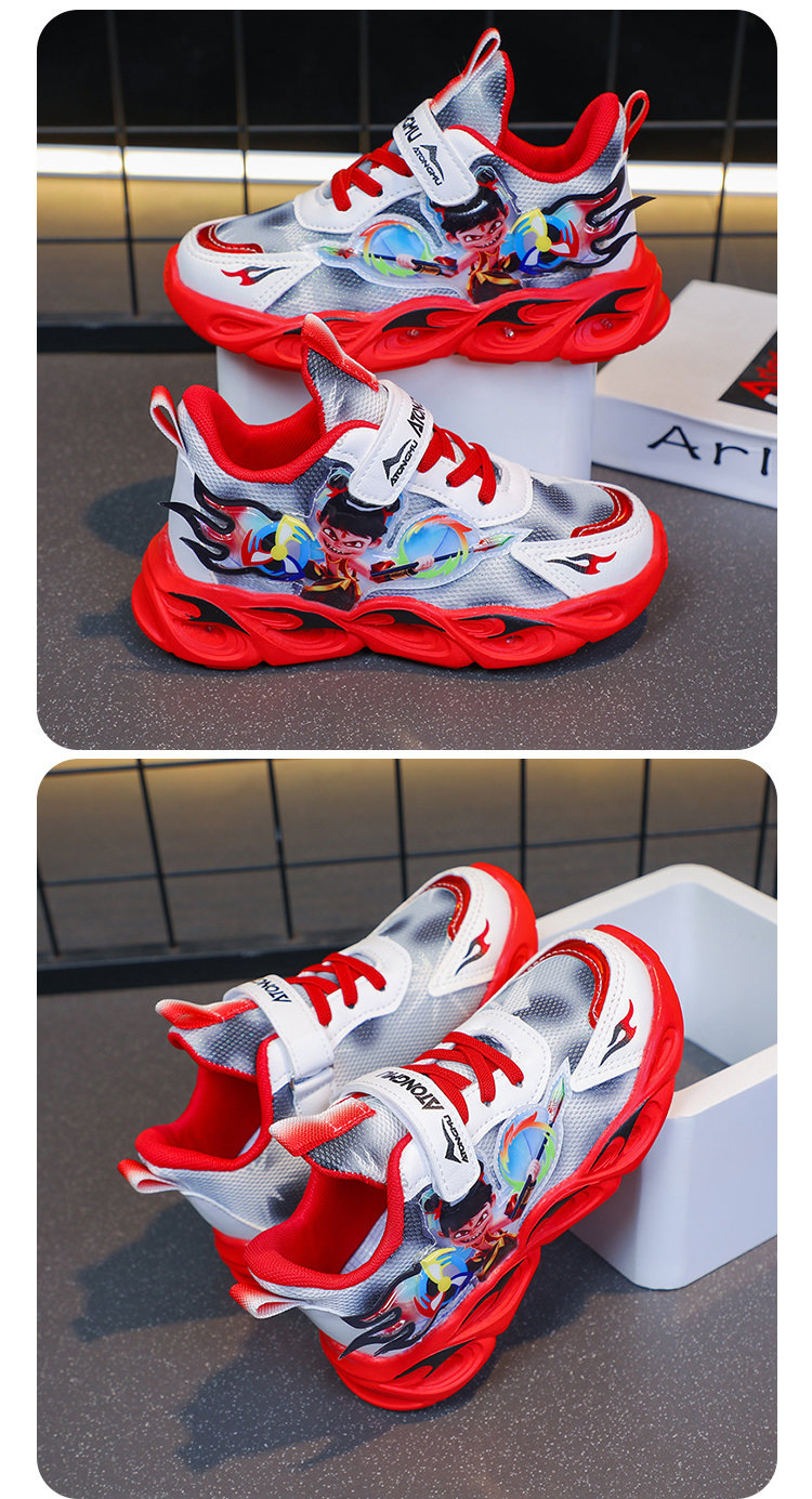 도매 Nezha 조명 어린이 운동화 봄 가을 2022 새로운 메쉬 가죽 표면 소년 미끄럼 방지 부드러운 바닥 운동화