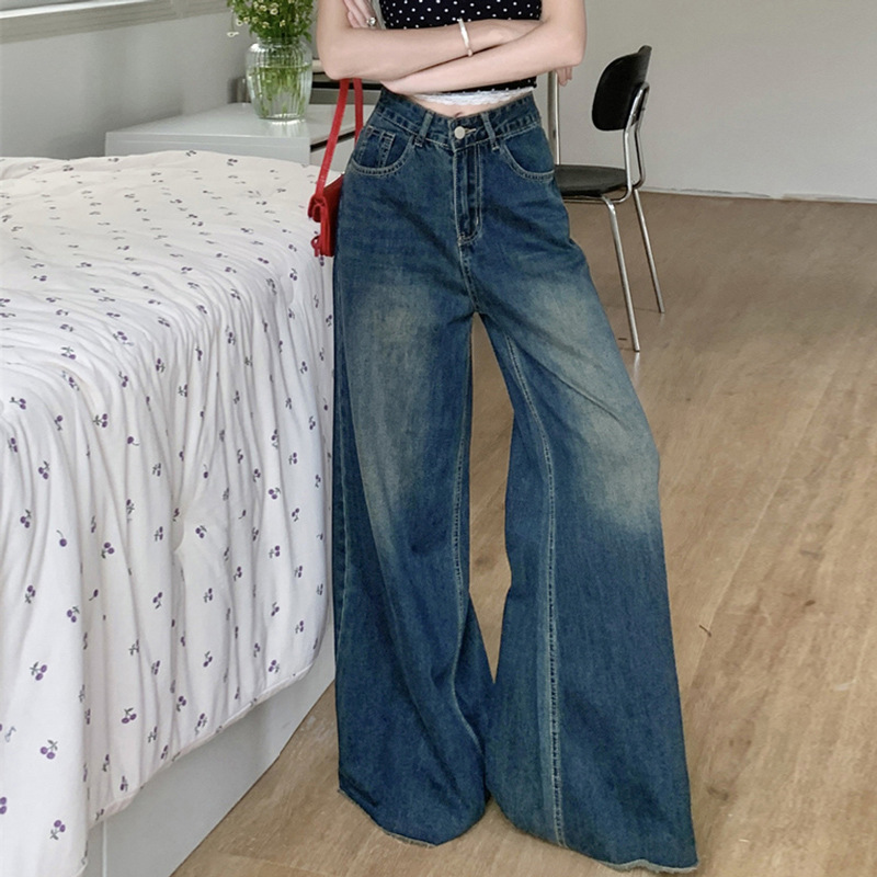 모피 가장자리 디자인-센스 배 모양의 넓은 다리 청바지 여성의 작은 허리 느슨한 플러스 사이즈 스트레이트 바지스토어 가기