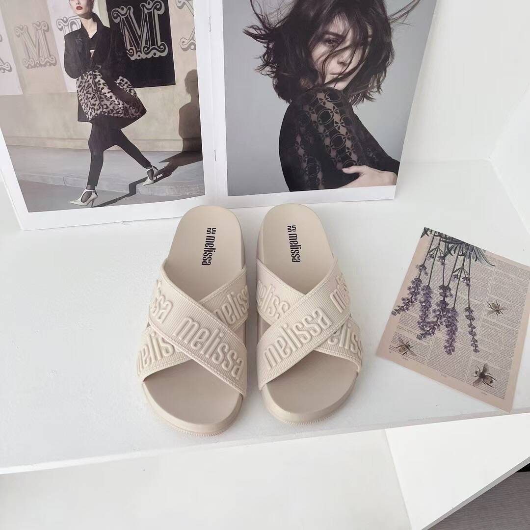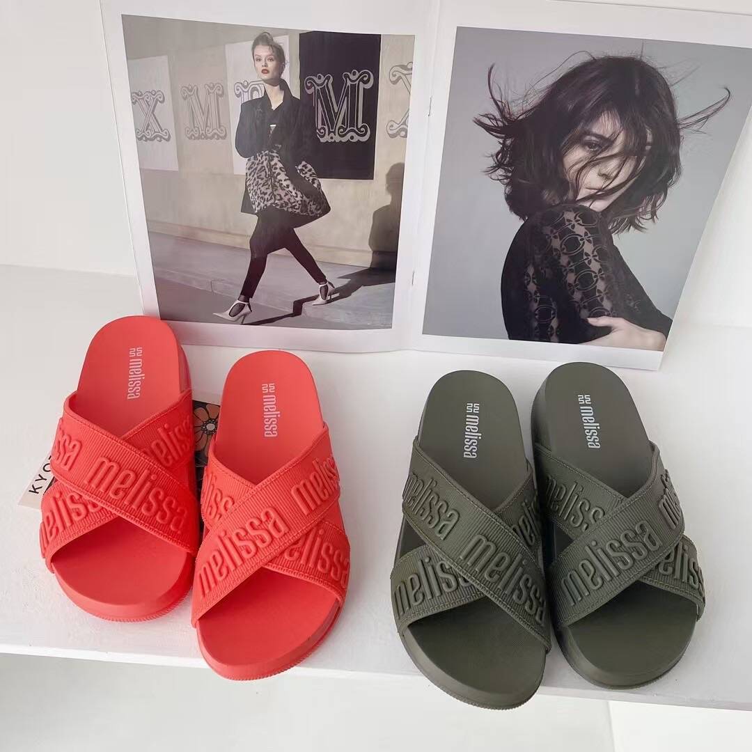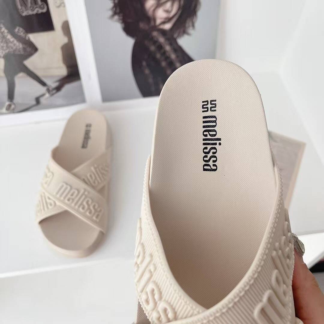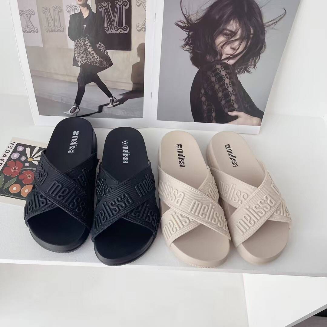 멜리사 여성 신발 2025 새로운 슬리퍼 샌들 여름 미끄럼 방지 문자 크로스 스트랩 두꺼운 밑창 슬리퍼 비치 신발스토어 가기