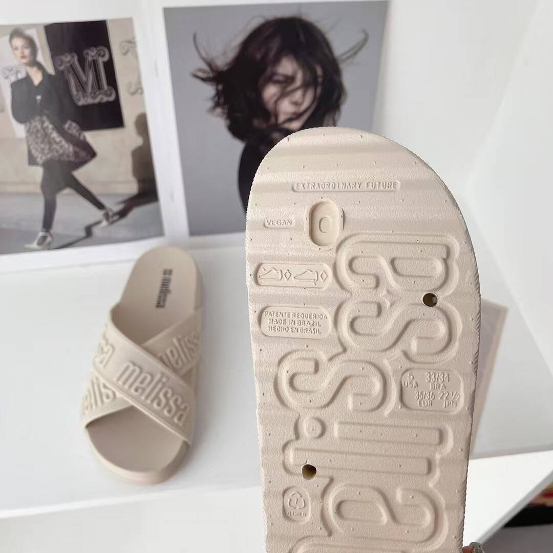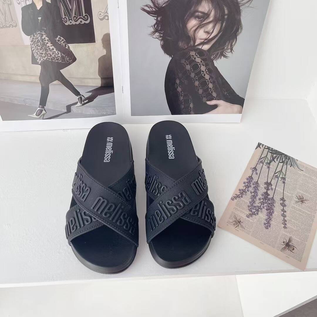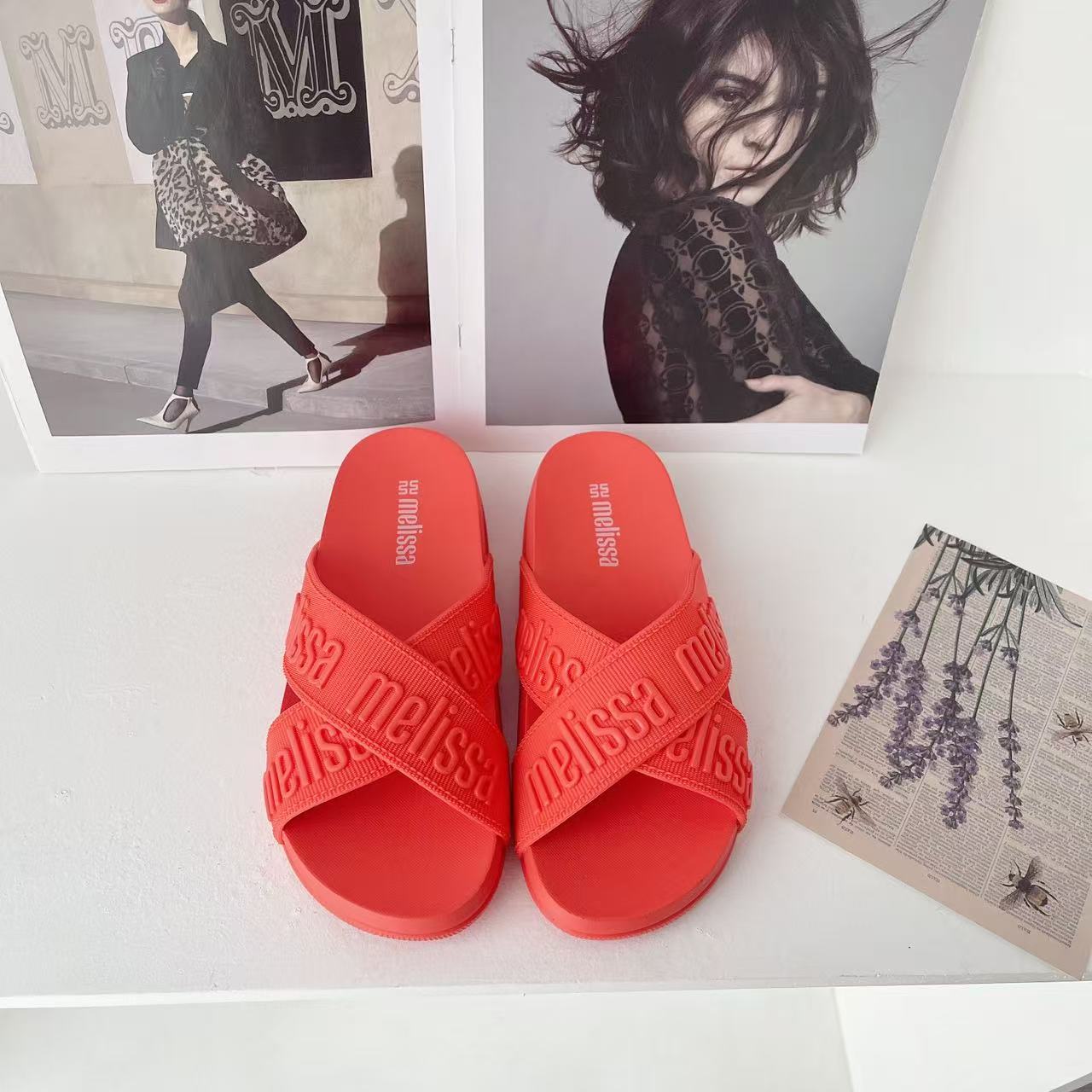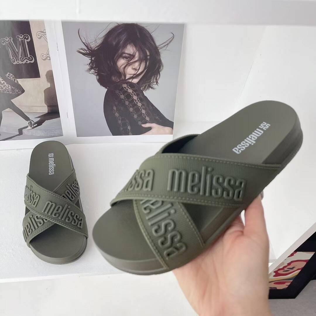 멜리사 여성 신발 2025 새로운 슬리퍼 샌들 여름 미끄럼 방지 문자 크로스 스트랩 두꺼운 밑창 슬리퍼 비치 신발스토어 가기
