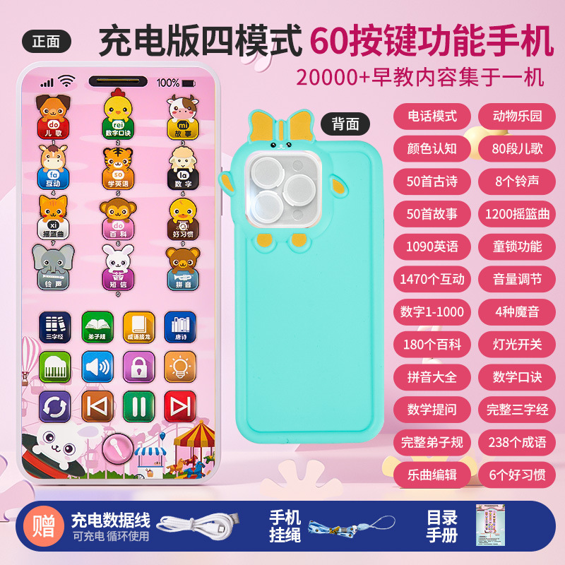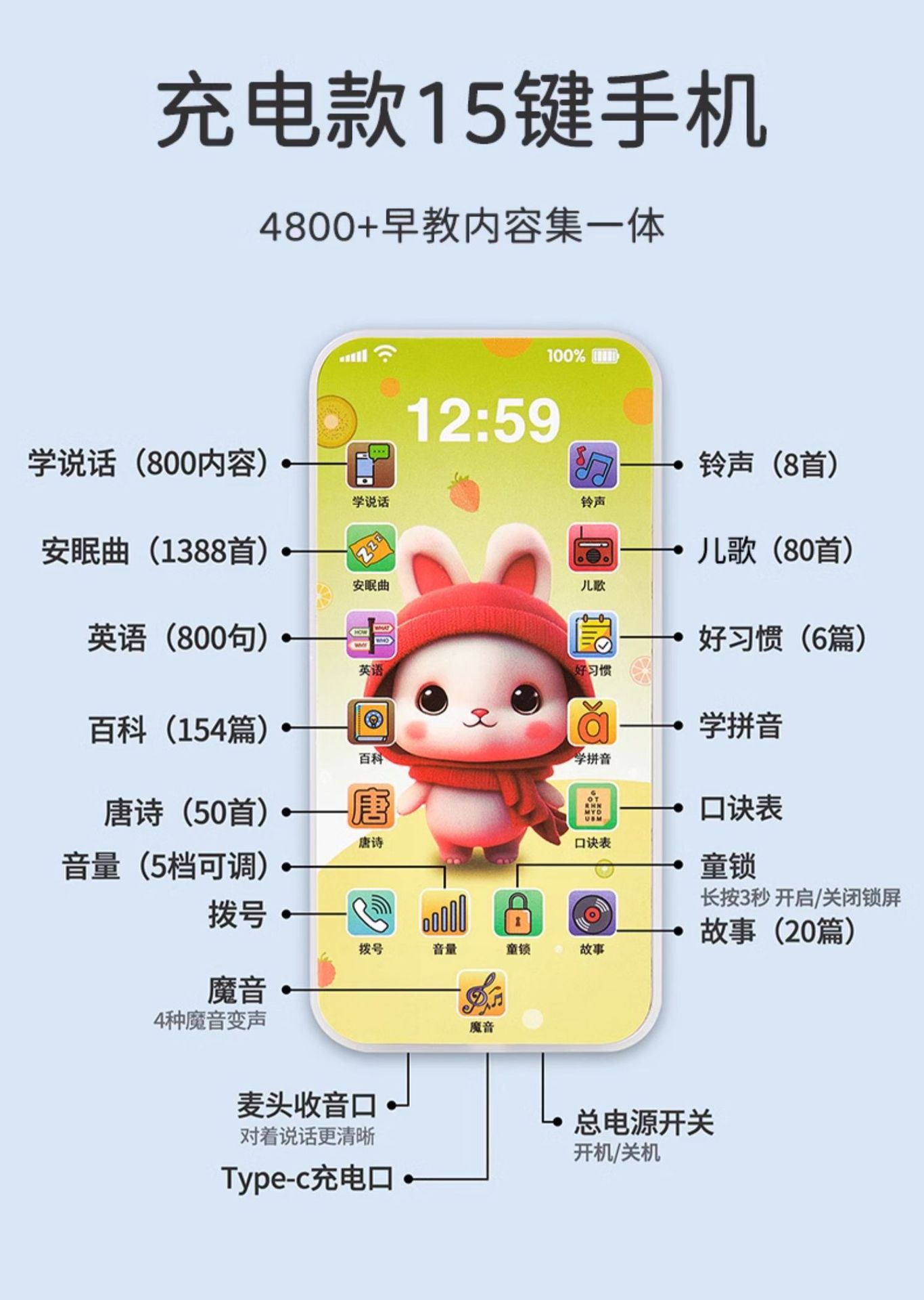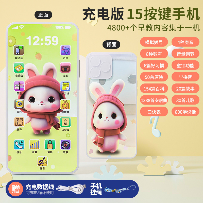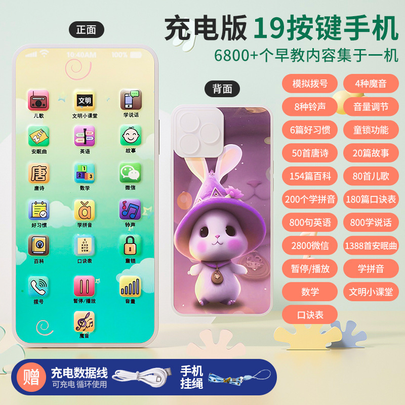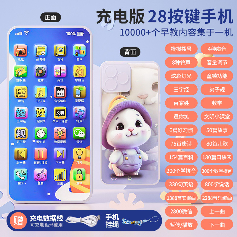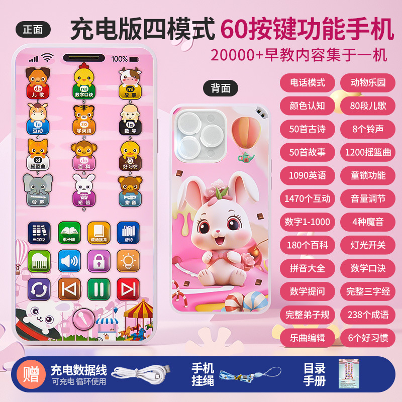 • 60개의 기능 키 변환(귀여운 토끼 모델) · 20000개 이상의 조기 교육 콘텐츠 - 조명 및 음악 포함(내장 마이크 + 충전 케이블 + 끈 + 정교한 선물 상자)