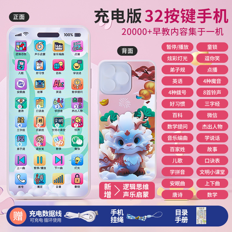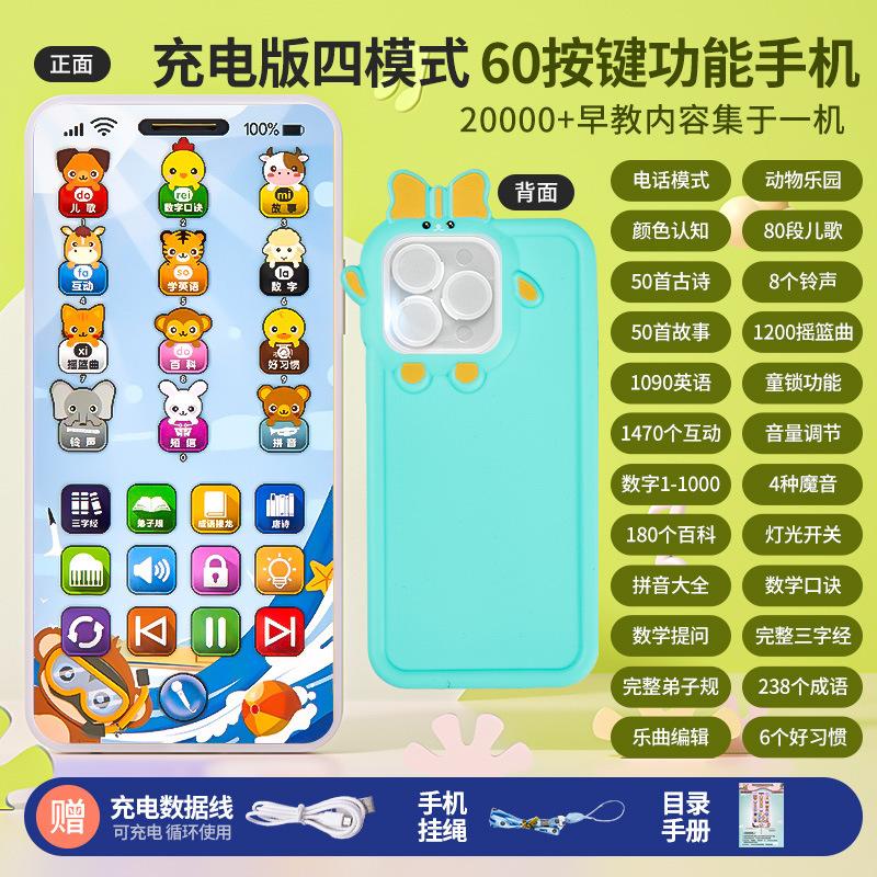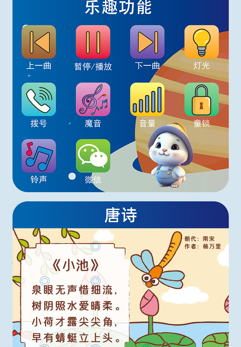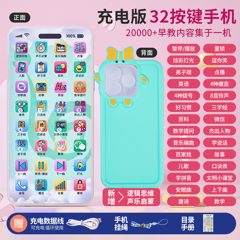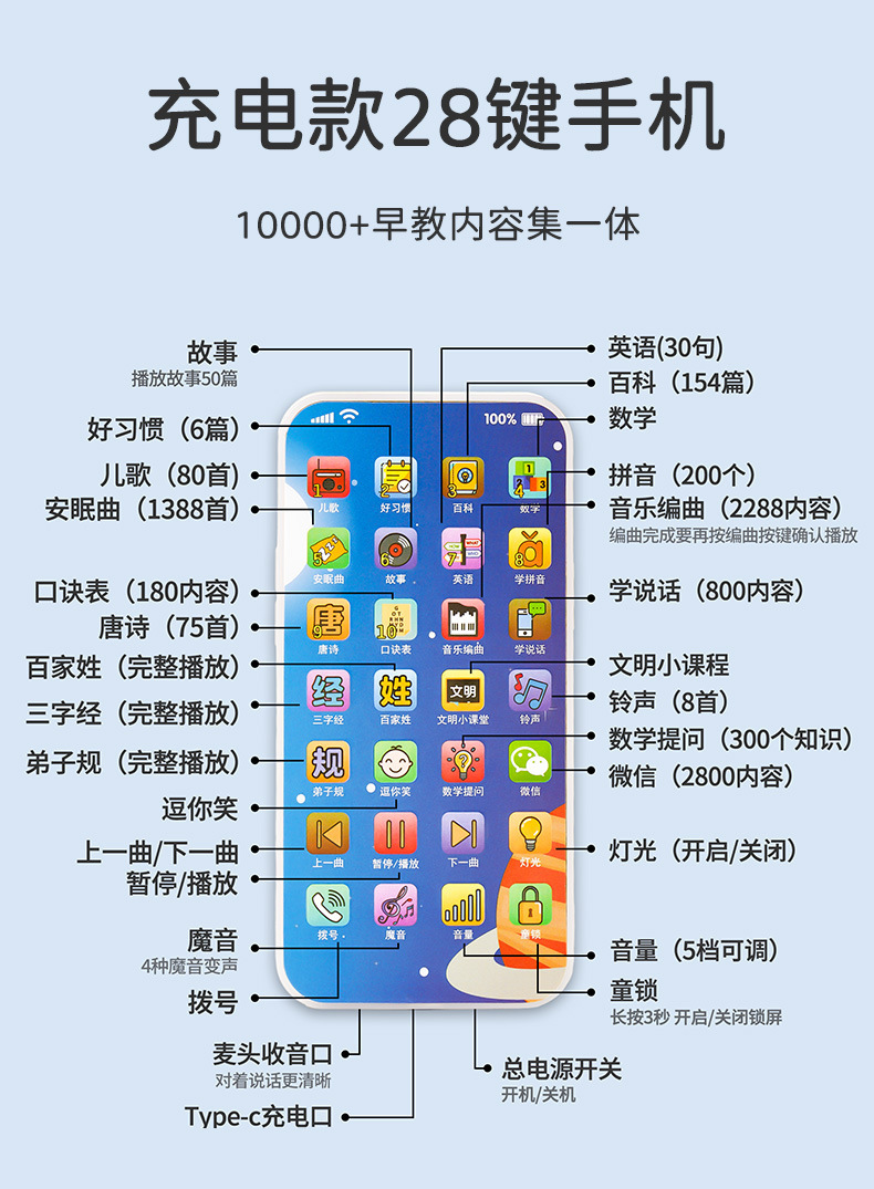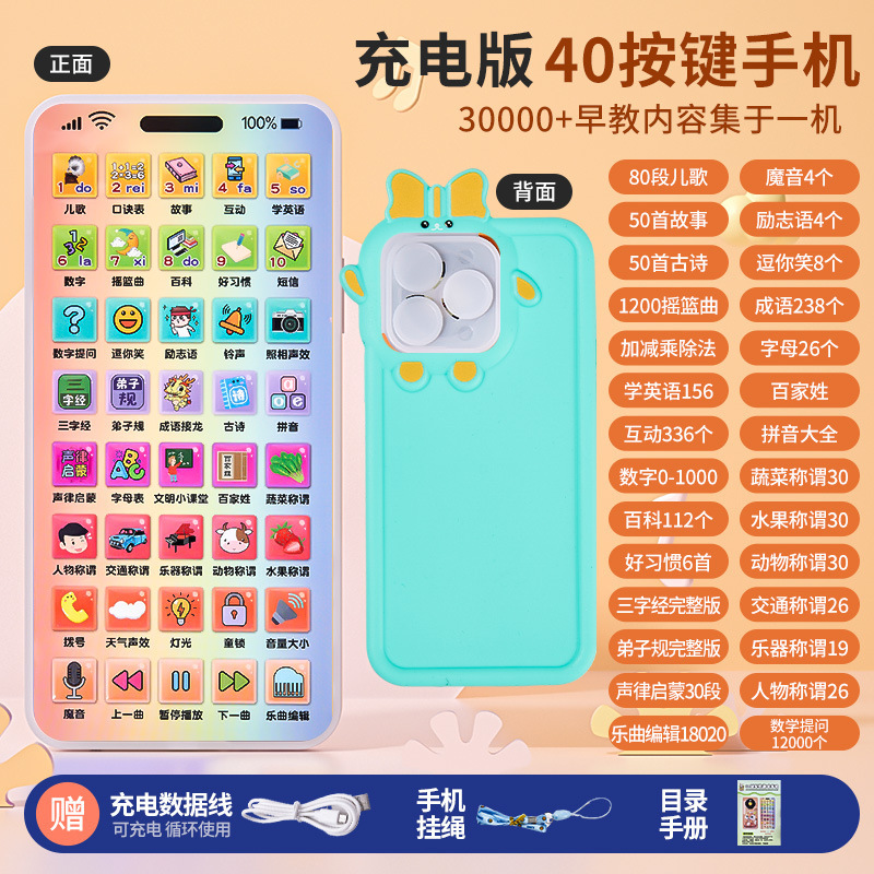 • 60개의 기능 키 변환(귀여운 토끼 모델) · 20000개 이상의 조기 교육 콘텐츠 - 조명 및 음악 포함(내장 마이크 + 충전 케이블 + 끈 + 정교한 선물 상자)