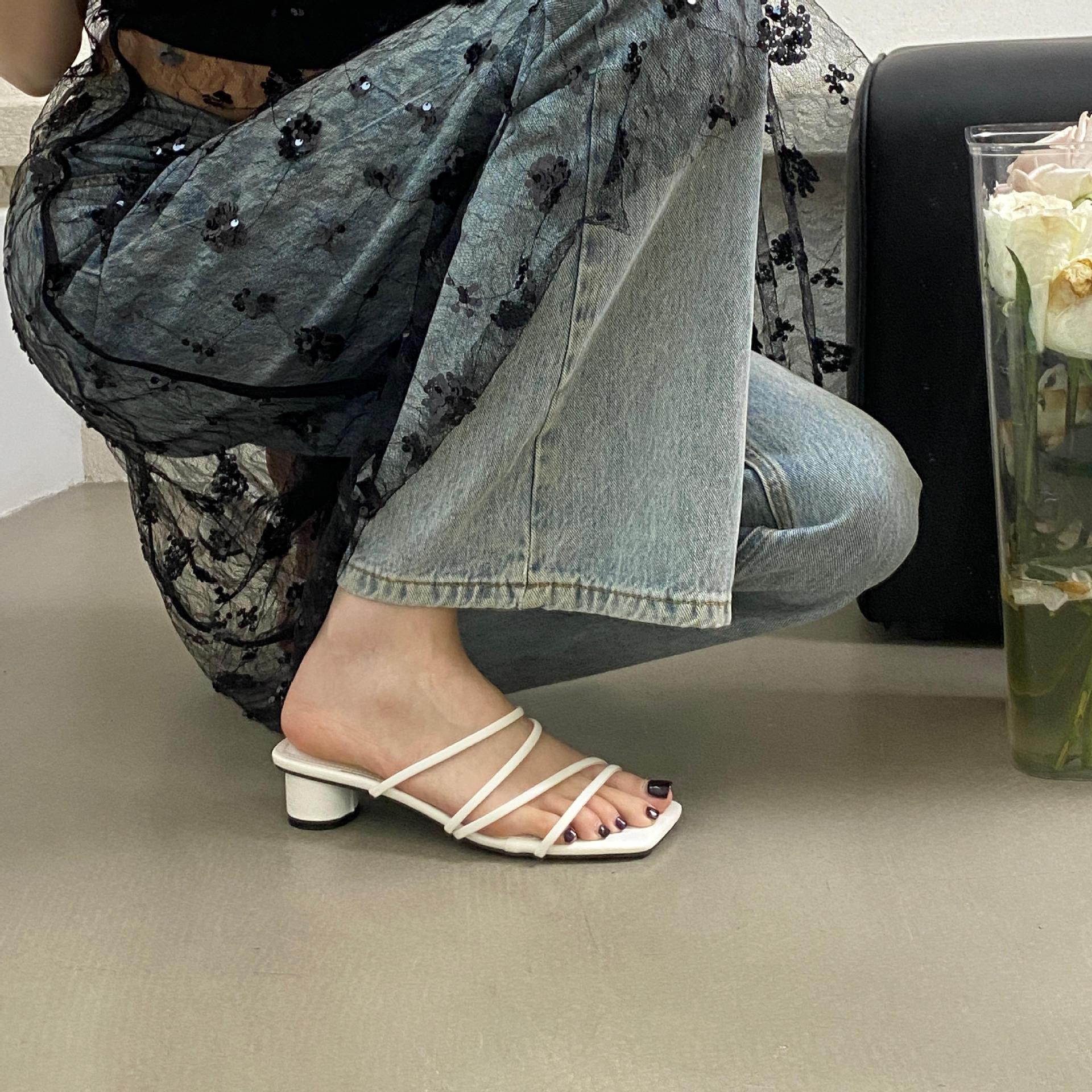 프랑스 스타일 블랙 슬라이드 슬리퍼 여성 아우터 2025 새로운 한국식 두꺼운 힐 오픈 토 스퀘어 발가락 실버 원슈 샌들