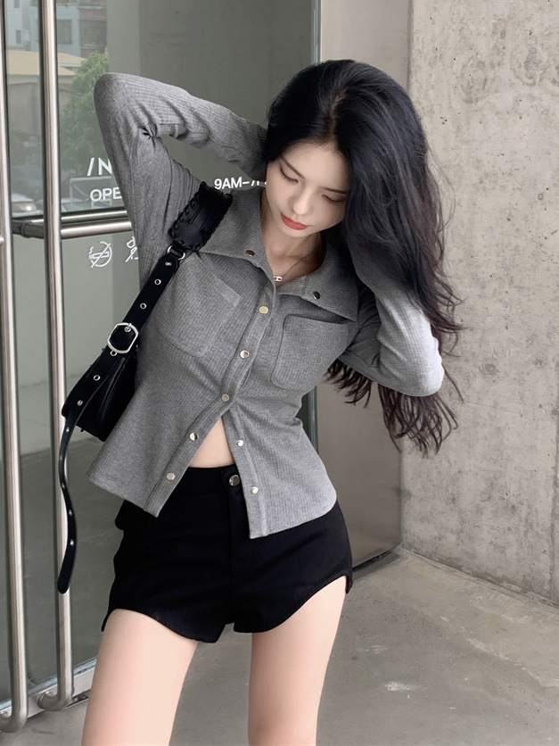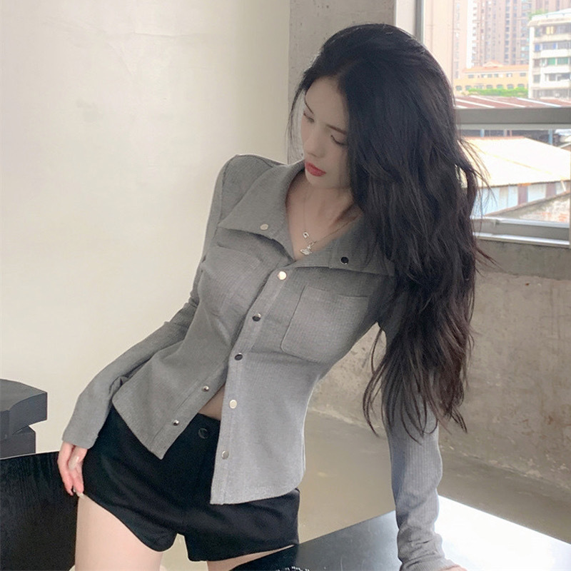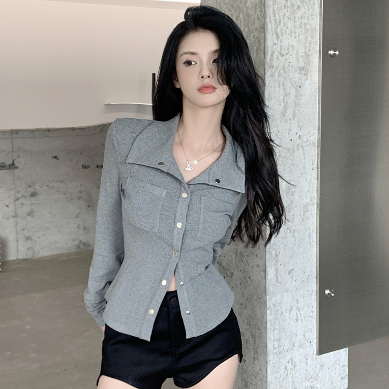봄과 가을 새로운 순수한 욕망 고급 그레이 폴로 셔츠 여성용 슬림 올 매치 슬리밍 스파이스 걸스 어깨 긴팔 탑