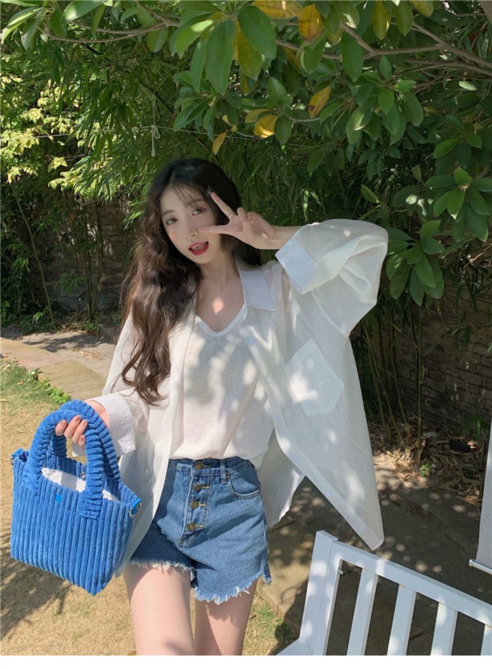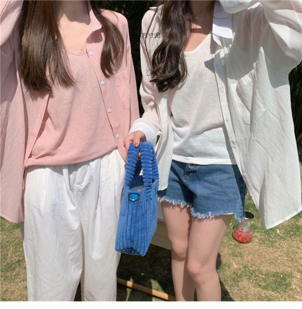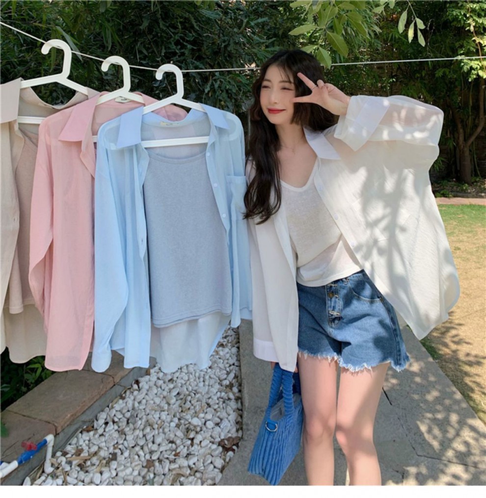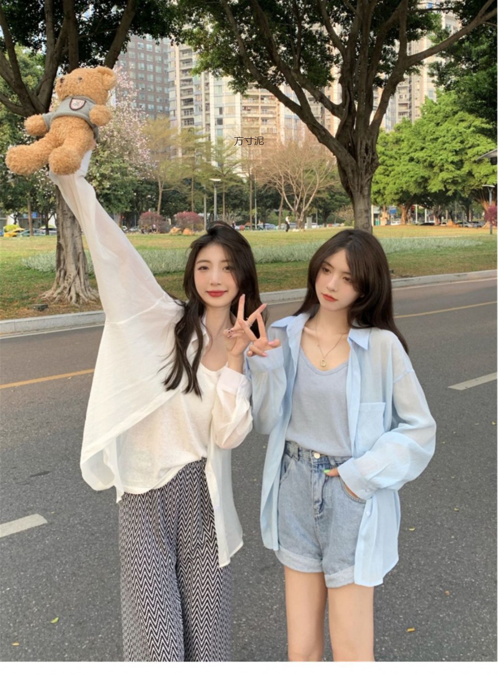 얇은 선 스크린 셔츠 입고 외부 비단면 셔츠 여성용 얇은 봄과 여름 한국식 느슨한 긴팔 탑스토어 가기