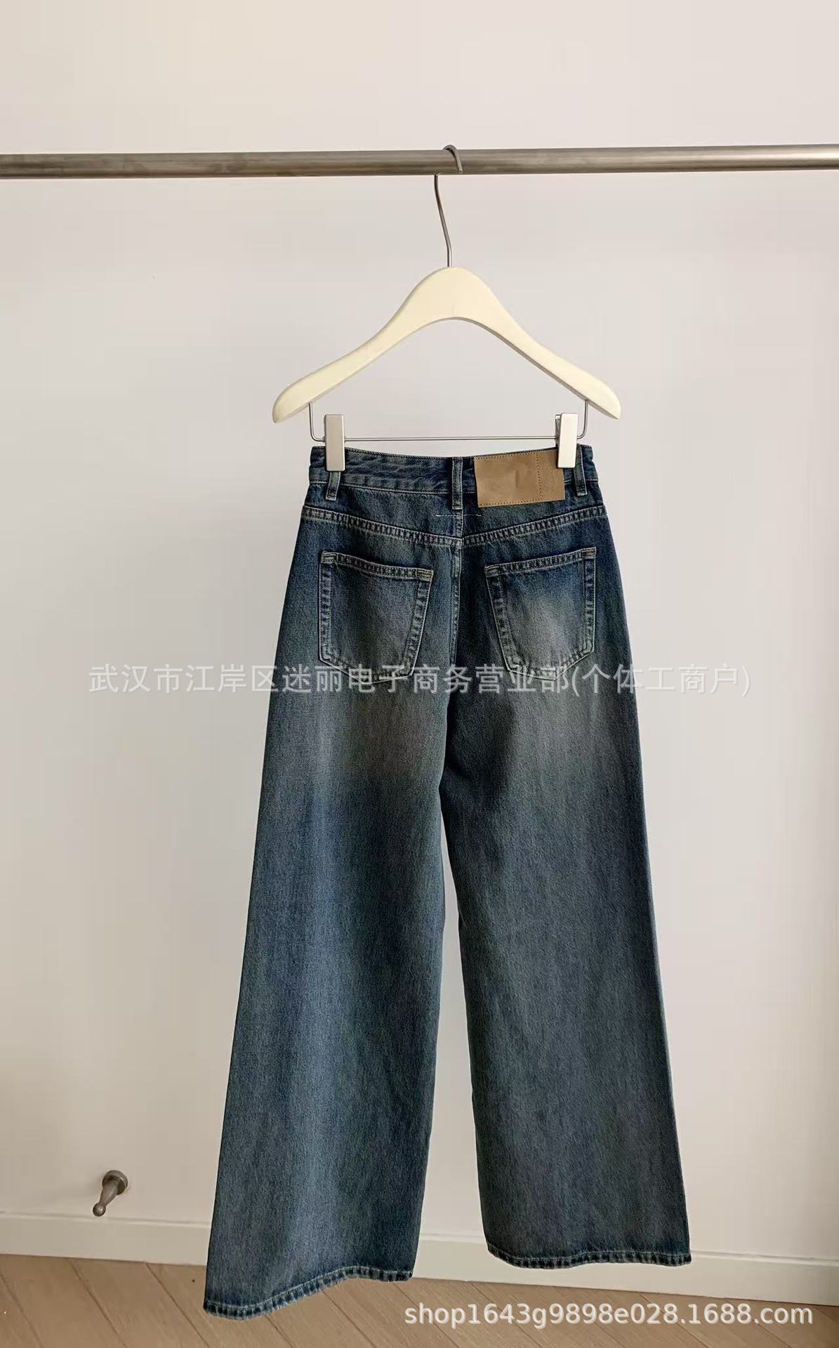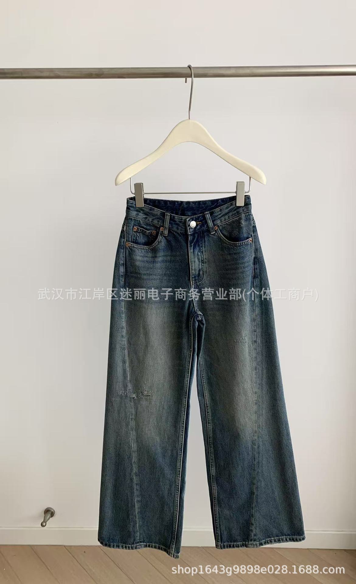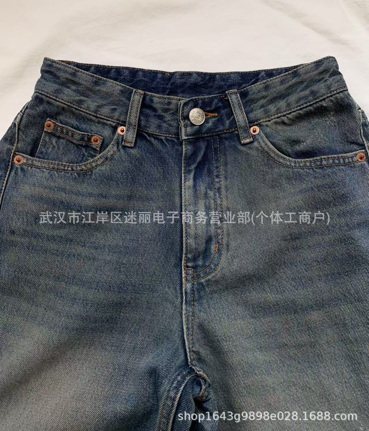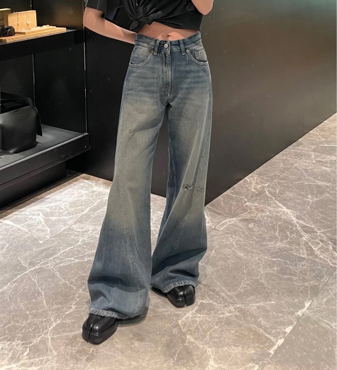 mm25 초봄 레트로 워싱 데미지 마이크로 플레어 청바지 빈티지 워싱 블루 캐주얼 롱 팬츠 여성용스토어 가기