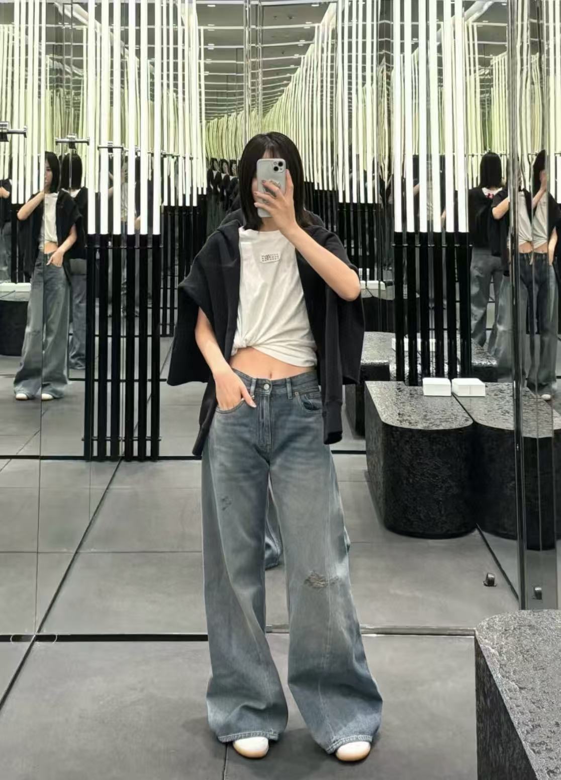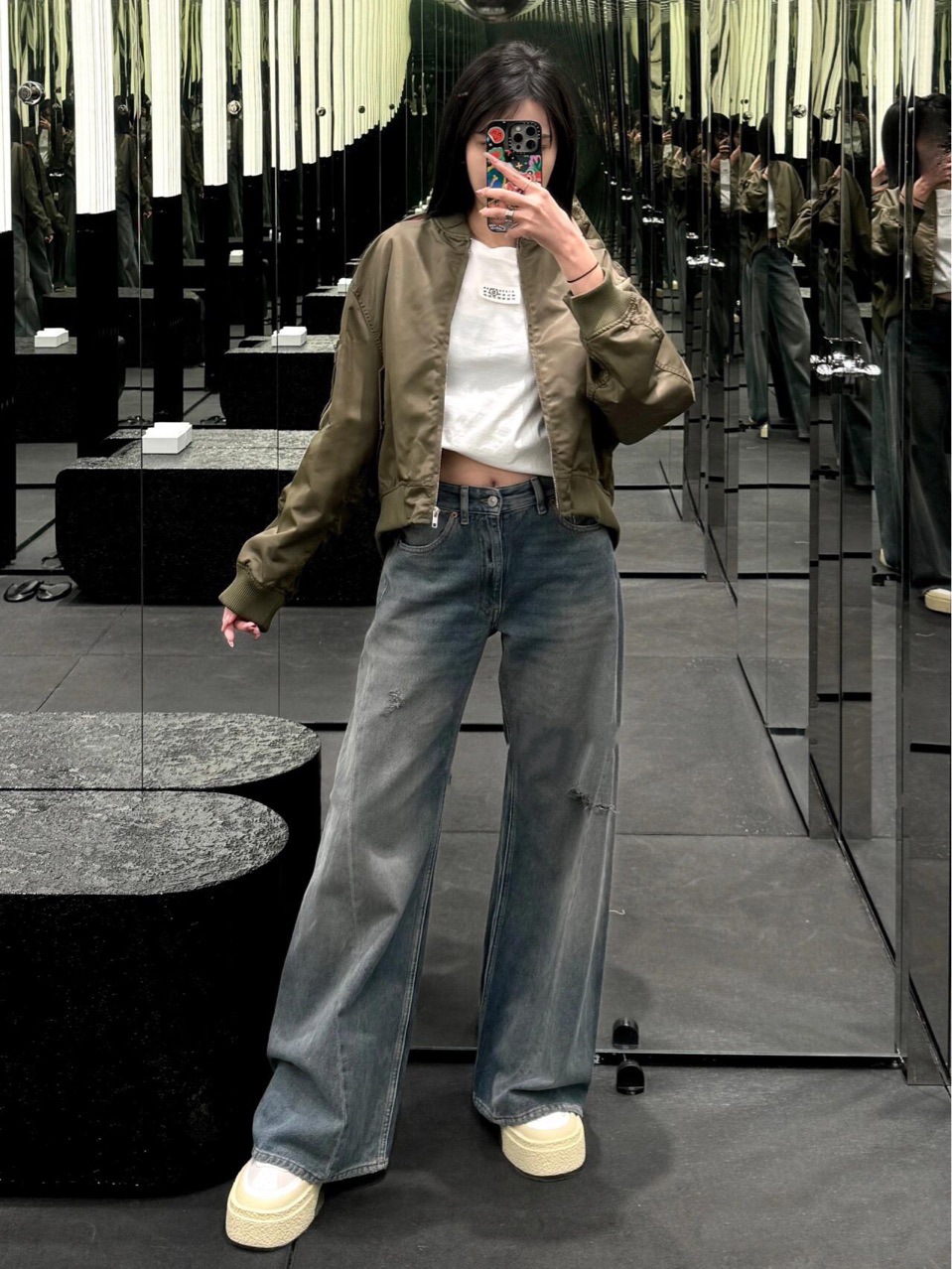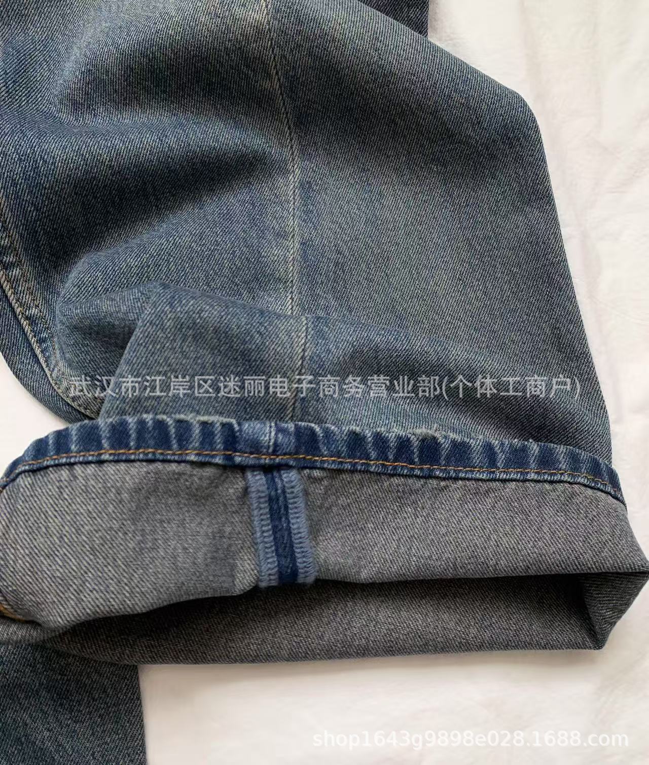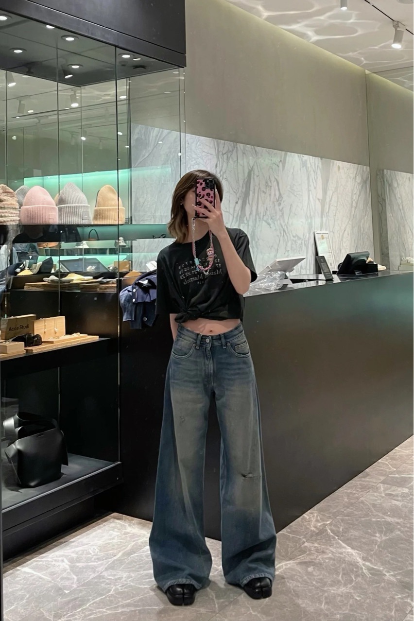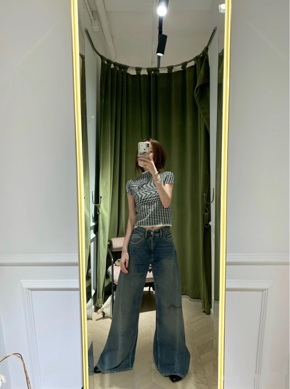 mm25 초봄 레트로 워싱 데미지 마이크로 플레어 청바지 빈티지 워싱 블루 캐주얼 롱 팬츠 여성용스토어 가기
