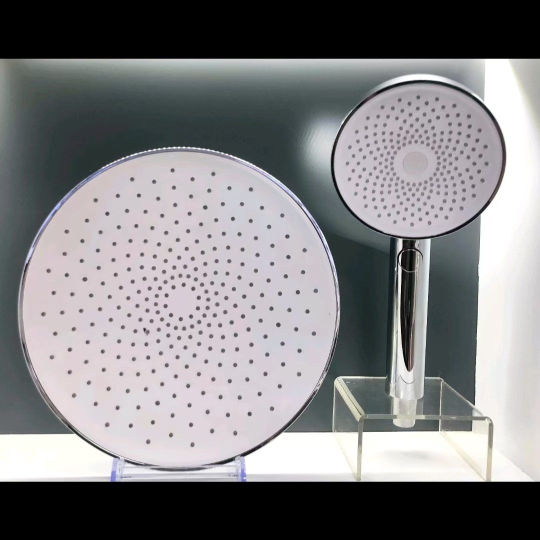 • 원형 도넛형 3가지 기능 핸드헬드 샤워기 + 10inch 탑 스프레이 세트 (도금 화이트 페이스 투명 실리콘 출수구)