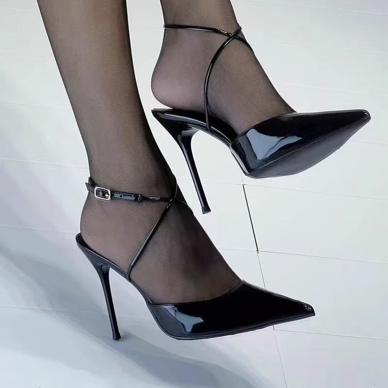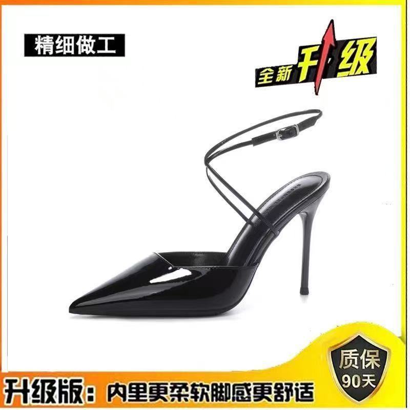 봄과 여름 플러스 사이즈 새로운 뾰족한 검은 색 특허 가죽 하이힐 여성용 스틸레토 힐 스트랩 아름다운 우아한 싱글 레이어 신발 섹시한 샌들스토어 가기
