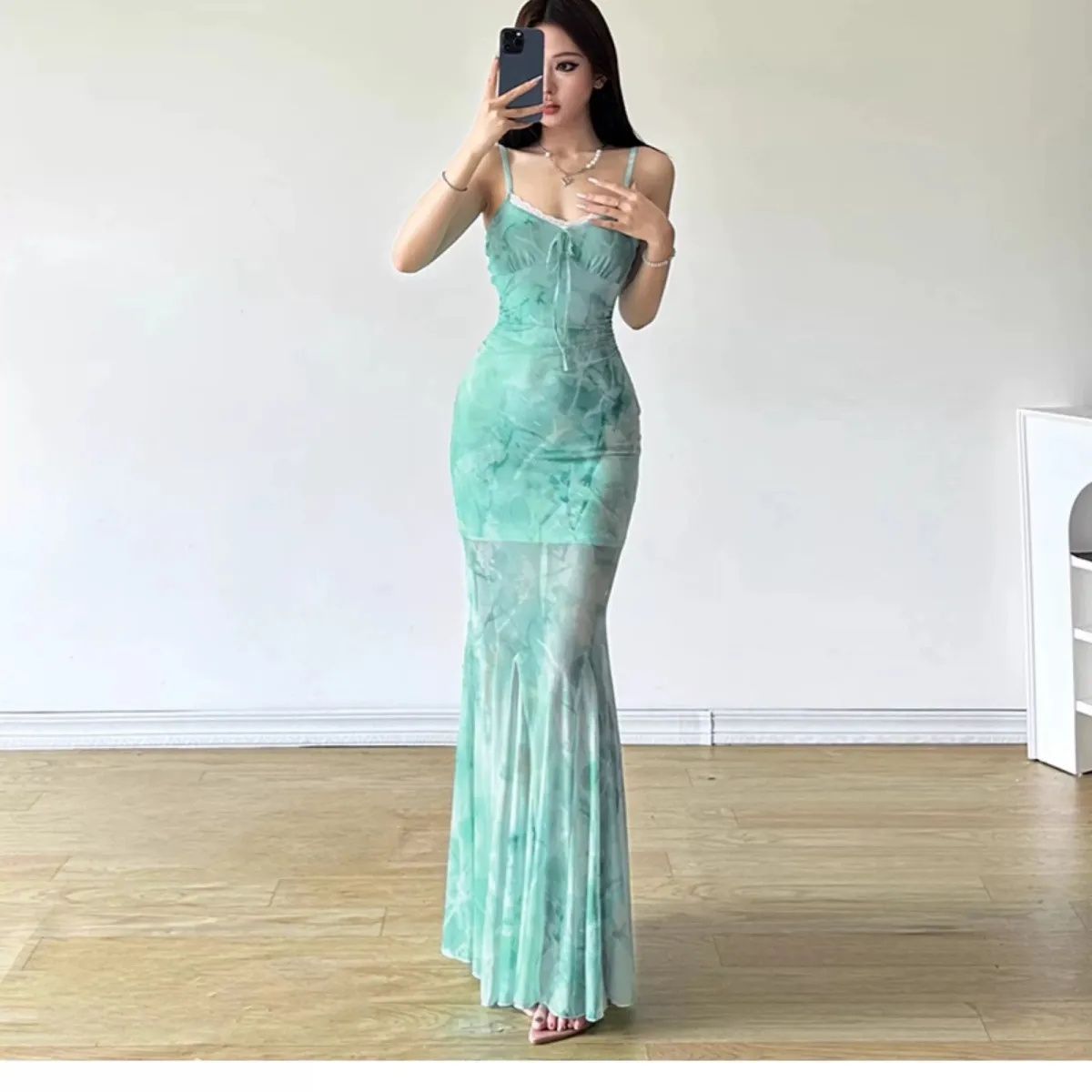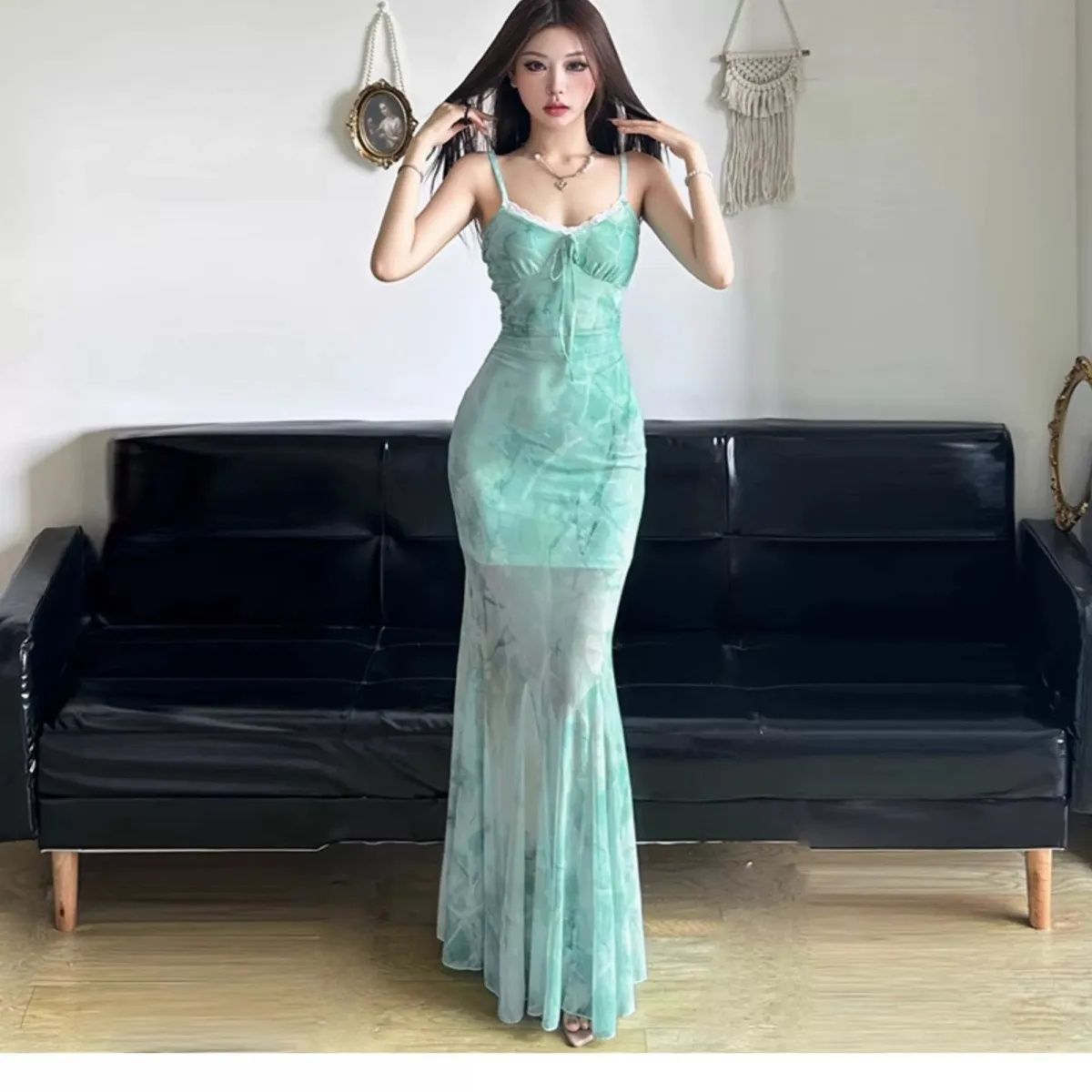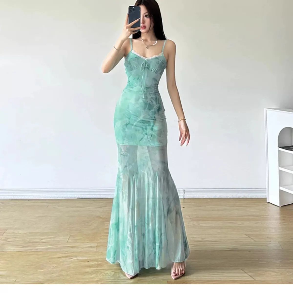 프랑스 스타일 라이트 그린 인쇄 메쉬 슬링 원피스 여성 여름 해변 휴가 순수 섹시한 생선 엉덩이 원피스
