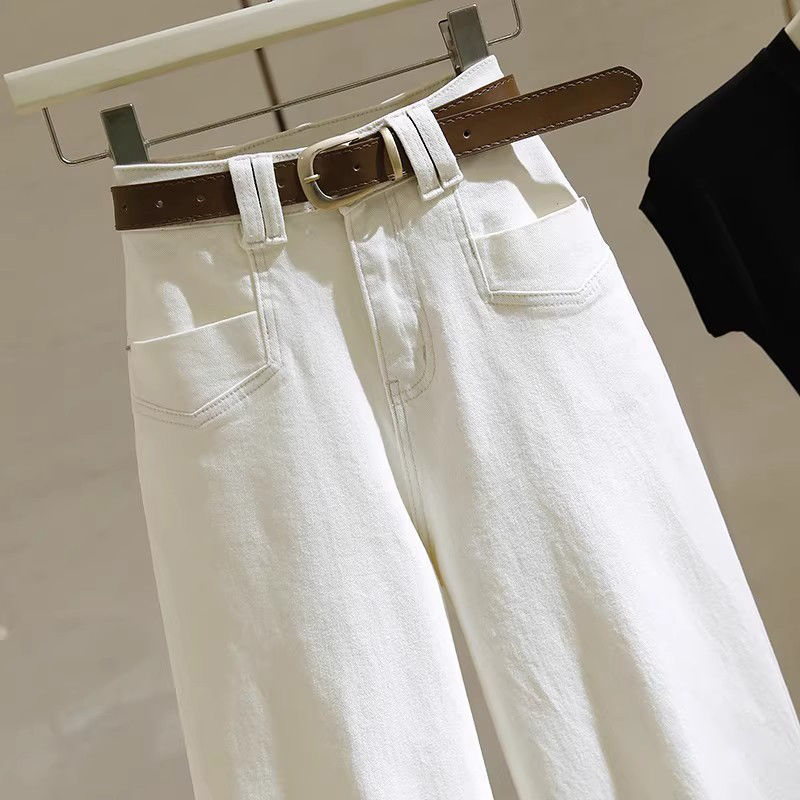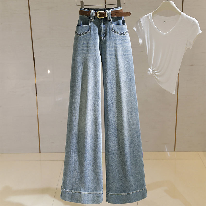 Shanli Dadi 살구색 높은 허리 넓은 다리 청바지 여성용 봄 새로운 느슨한 스트레이트 통통녀 마이크로 혼 걸레 바지