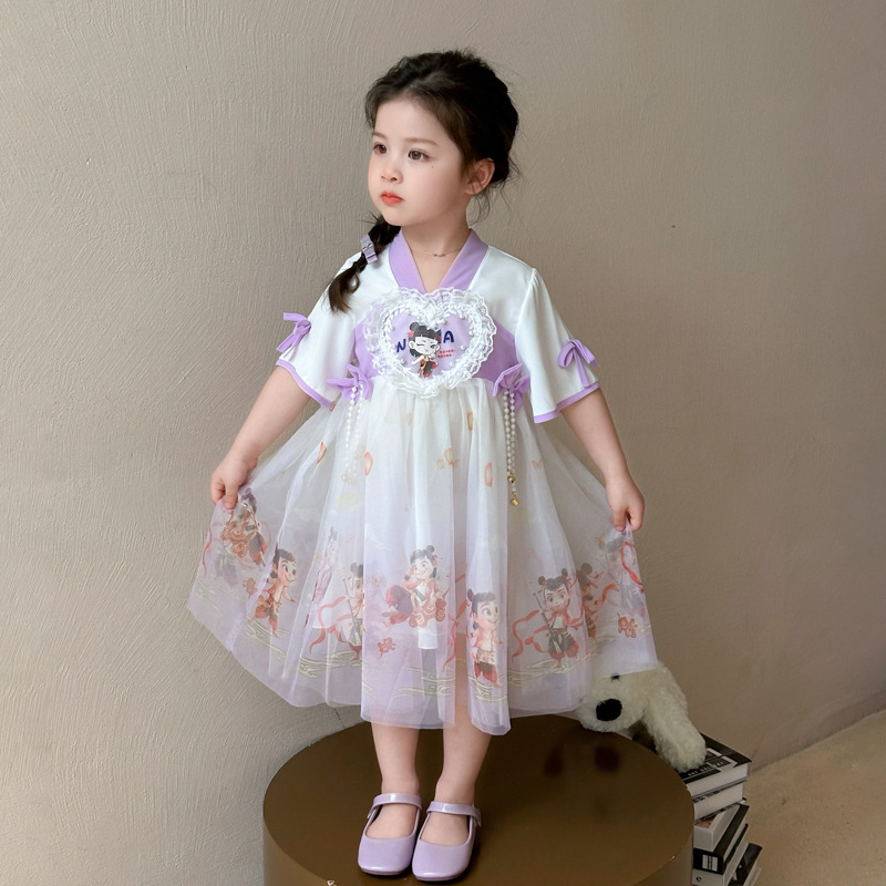 2025 원피스 새로운 어린 소녀 만화 귀여운 슈퍼 요정 공주 원피스 한푸 아기 소녀 여름 원피스