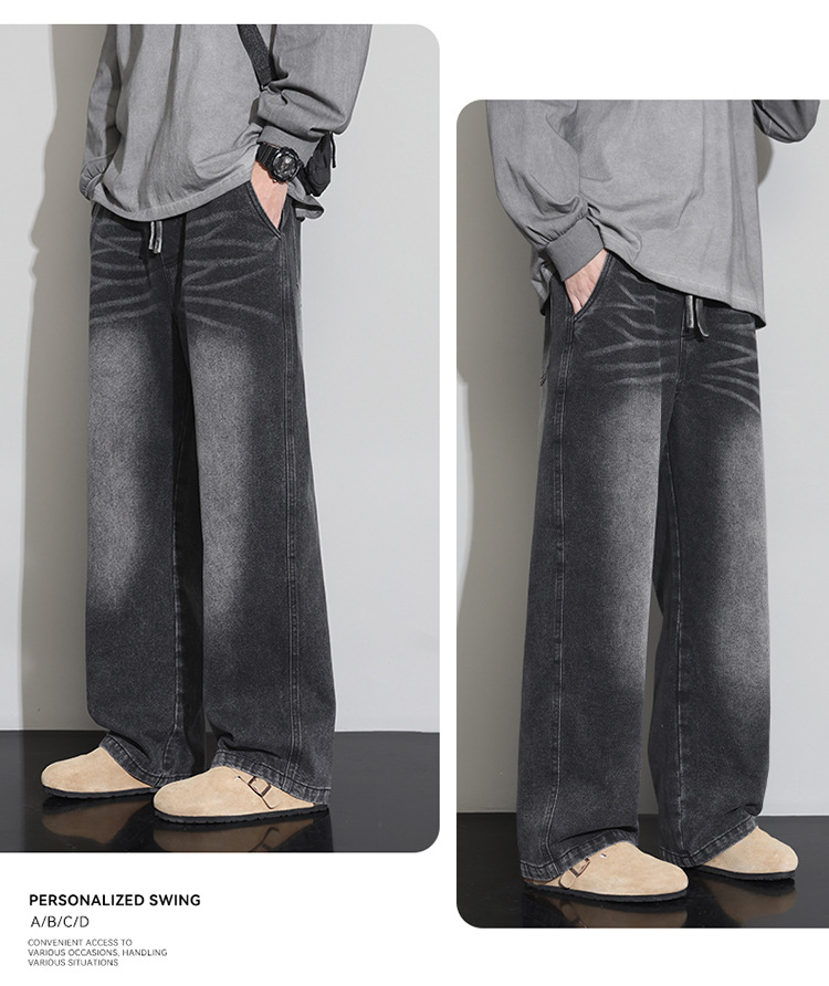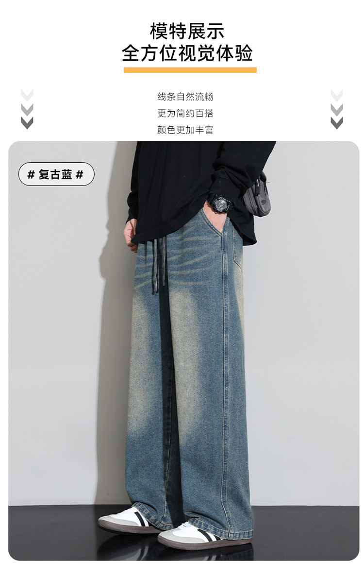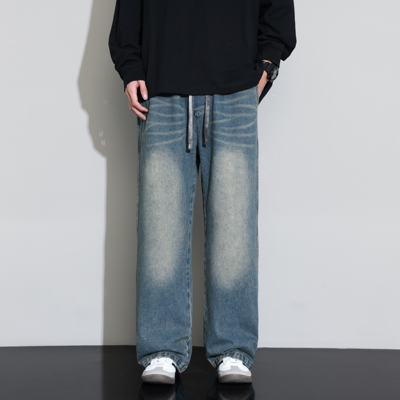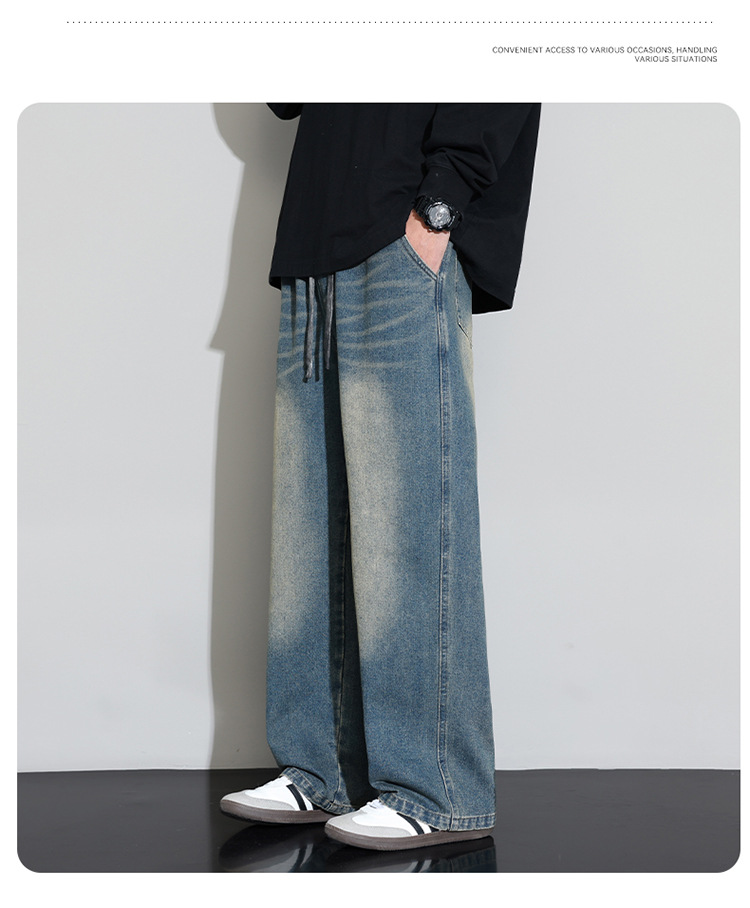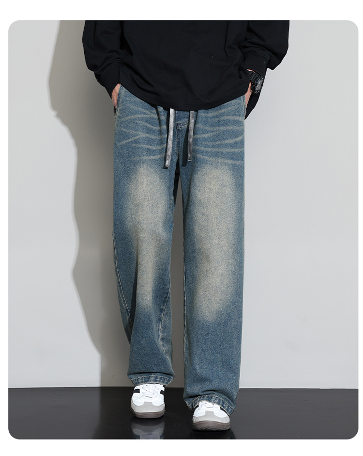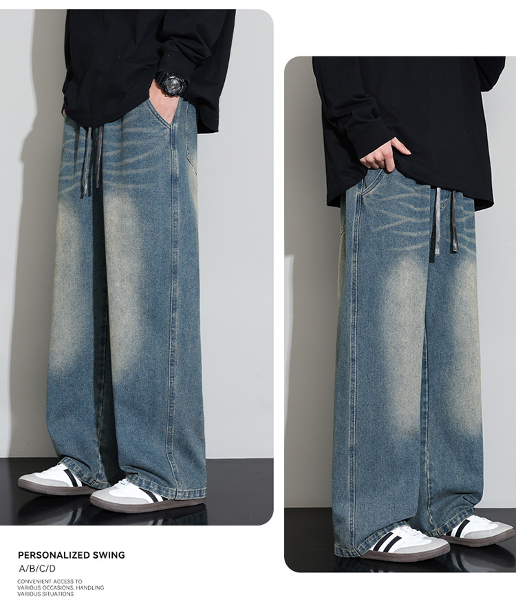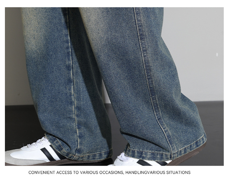 플러스 사이즈 아메리칸 스타일 레트로 하이 스트리트 오래 된 넓은 다리 솔리드 컬러 고양이 청바지 뚱뚱한 남자의 느슨한 스트레이트 트렌디 브랜드스토어 가기