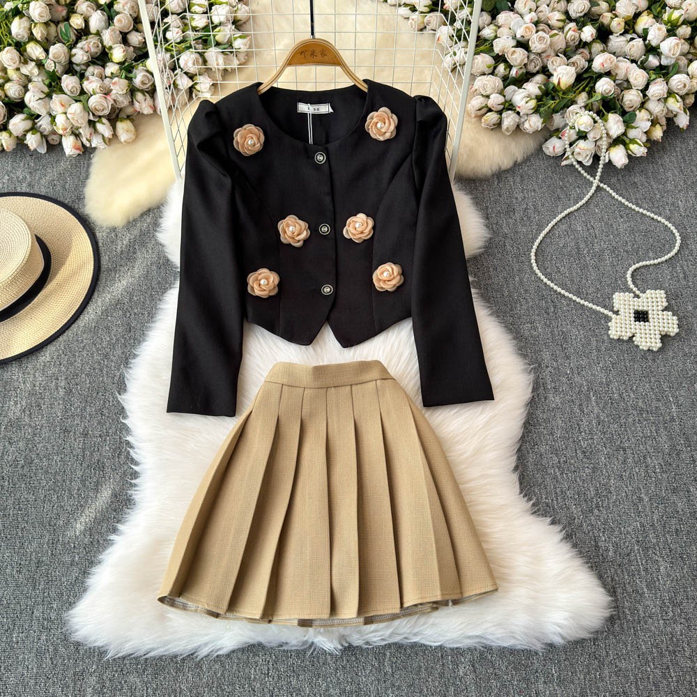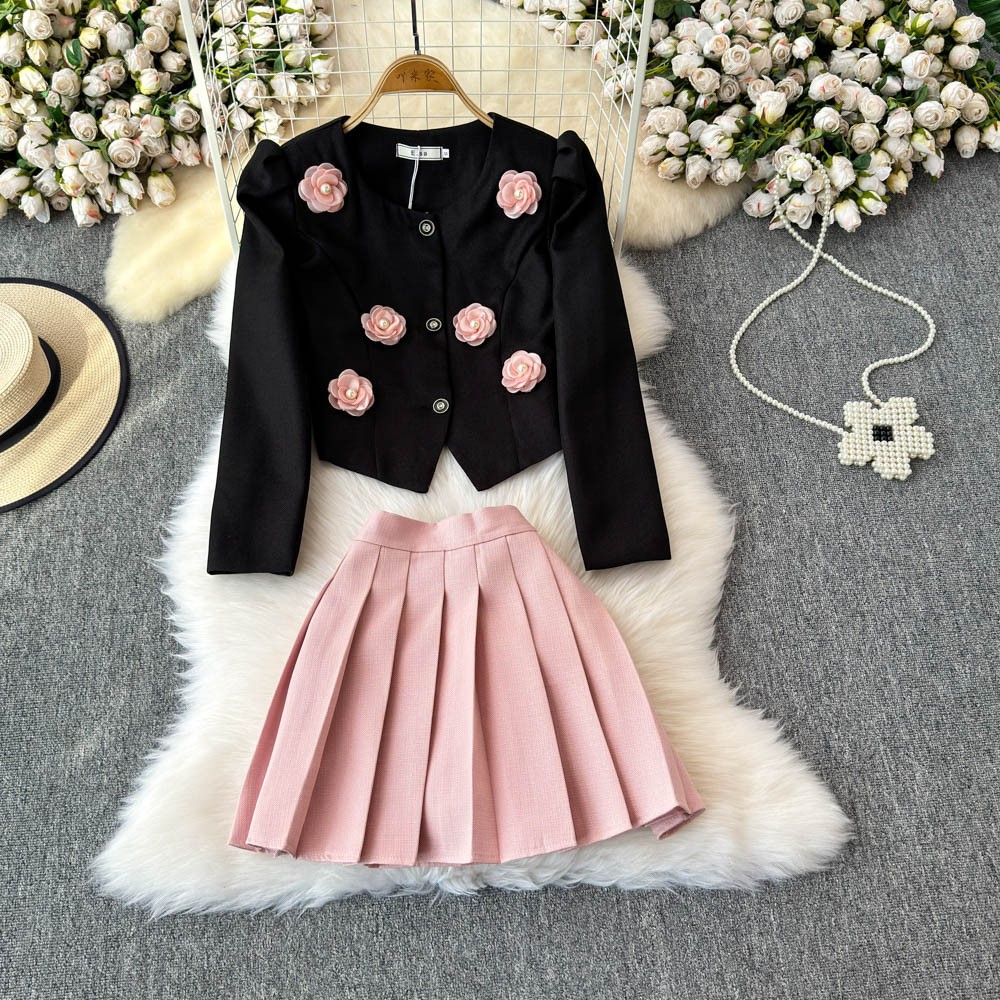봄 2025 새로운 3 차원 장미 디자인 최고 높은 허리 슬리밍 주름 치마 투피스 세트 여성