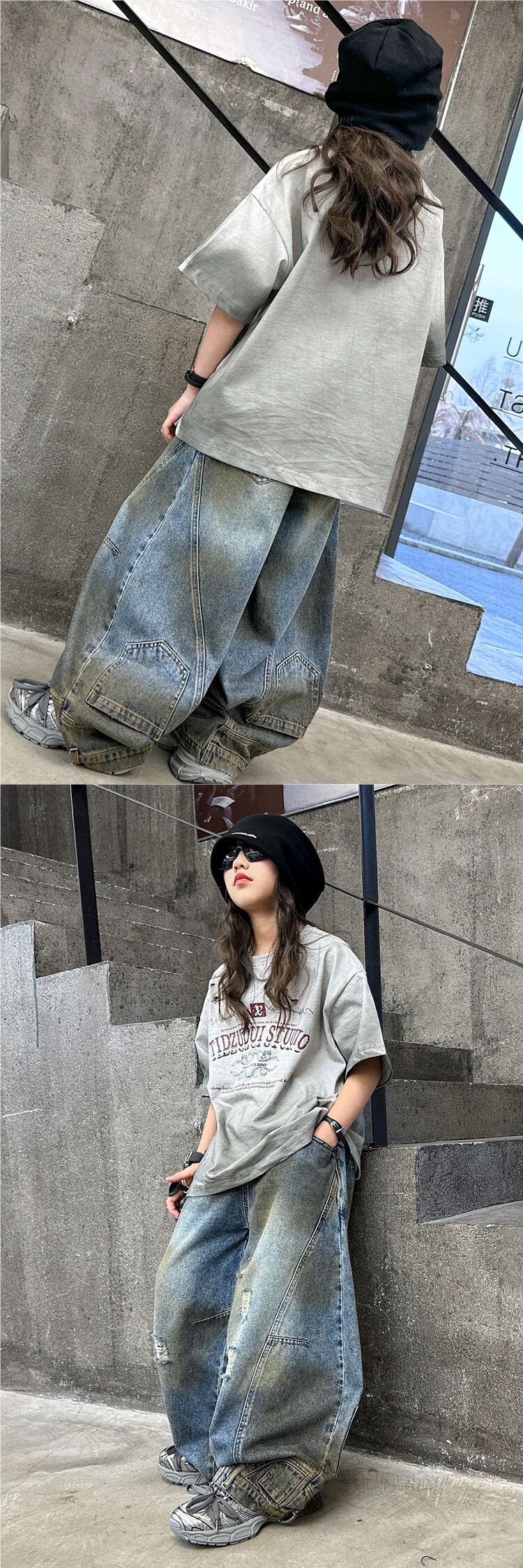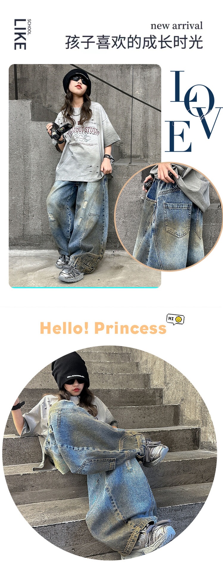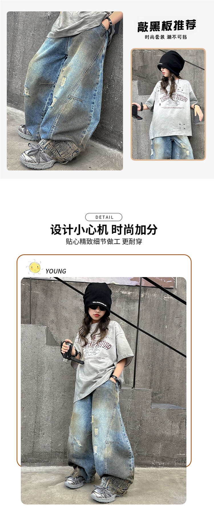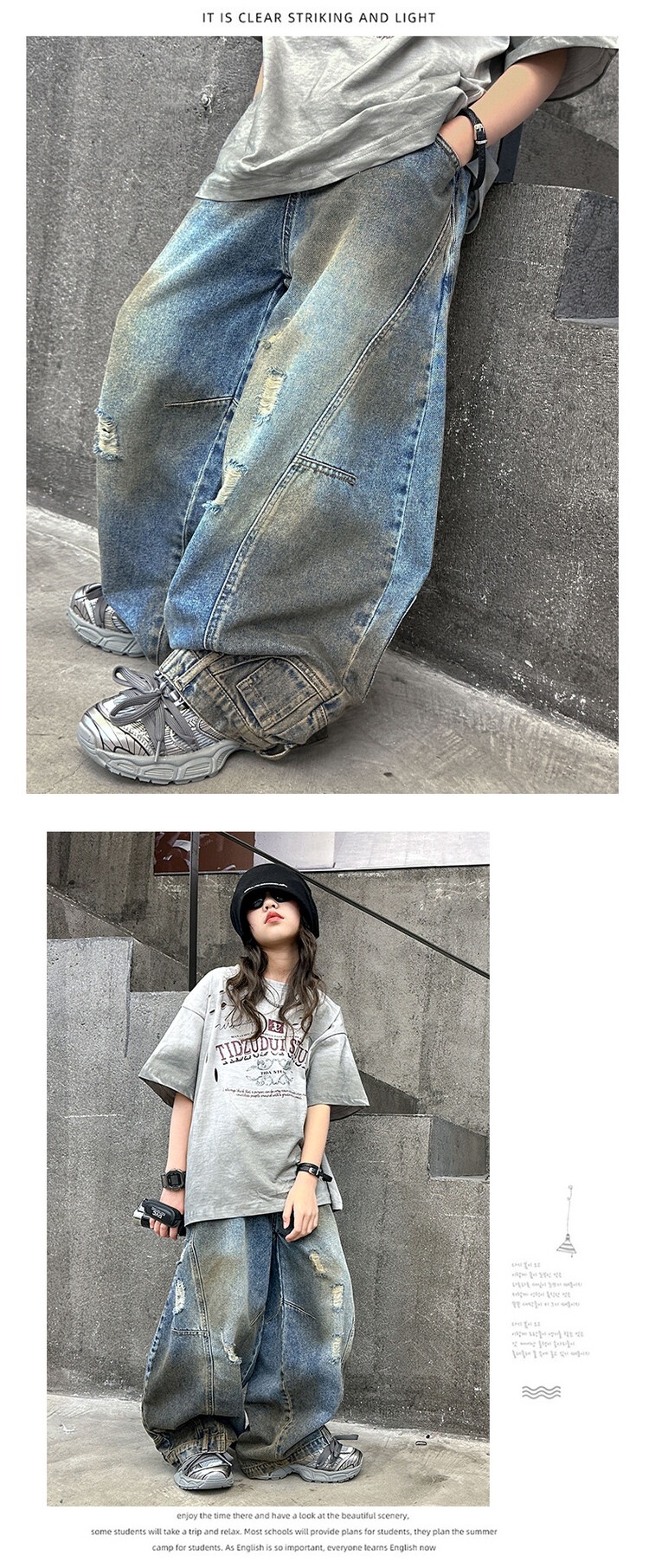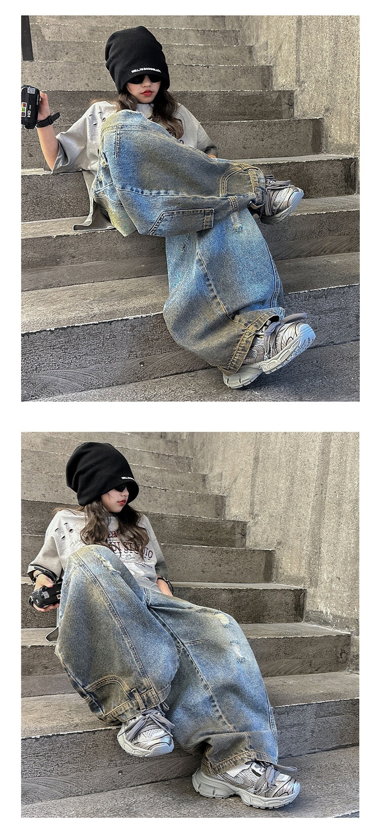 Zhili 한국 아동복 소녀 쿨 핸섬 청바지 느슨한 미국 복고풍 프로필 더러운 찢어진 넓은 다리 바지스토어 가기