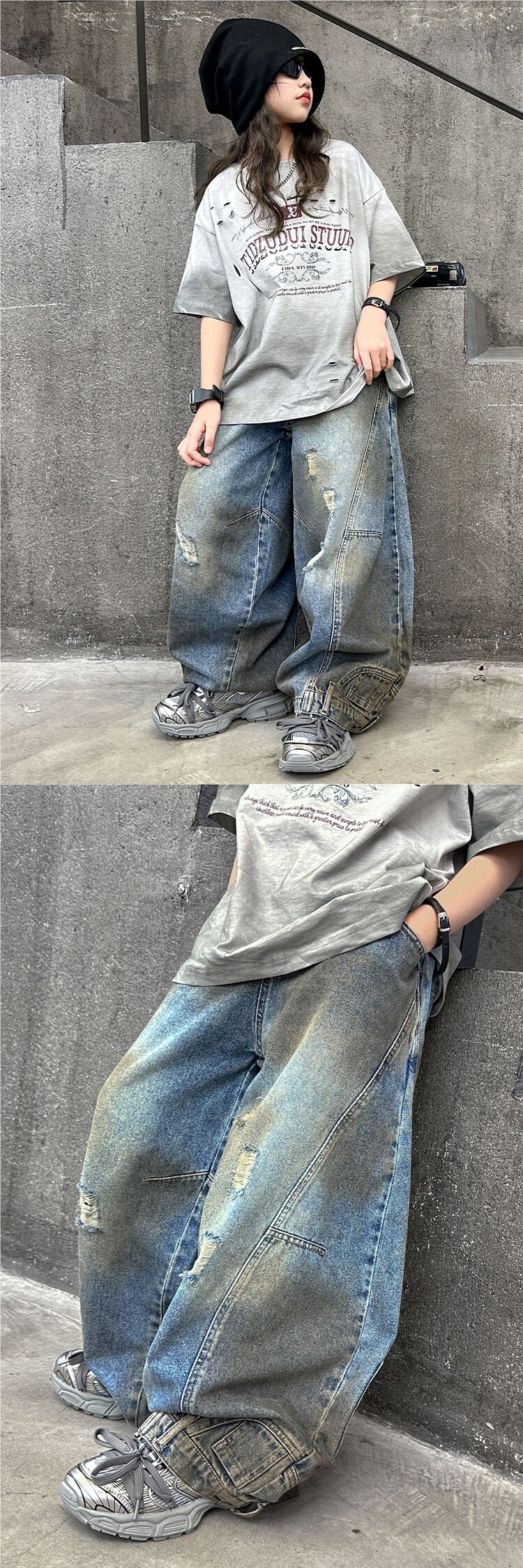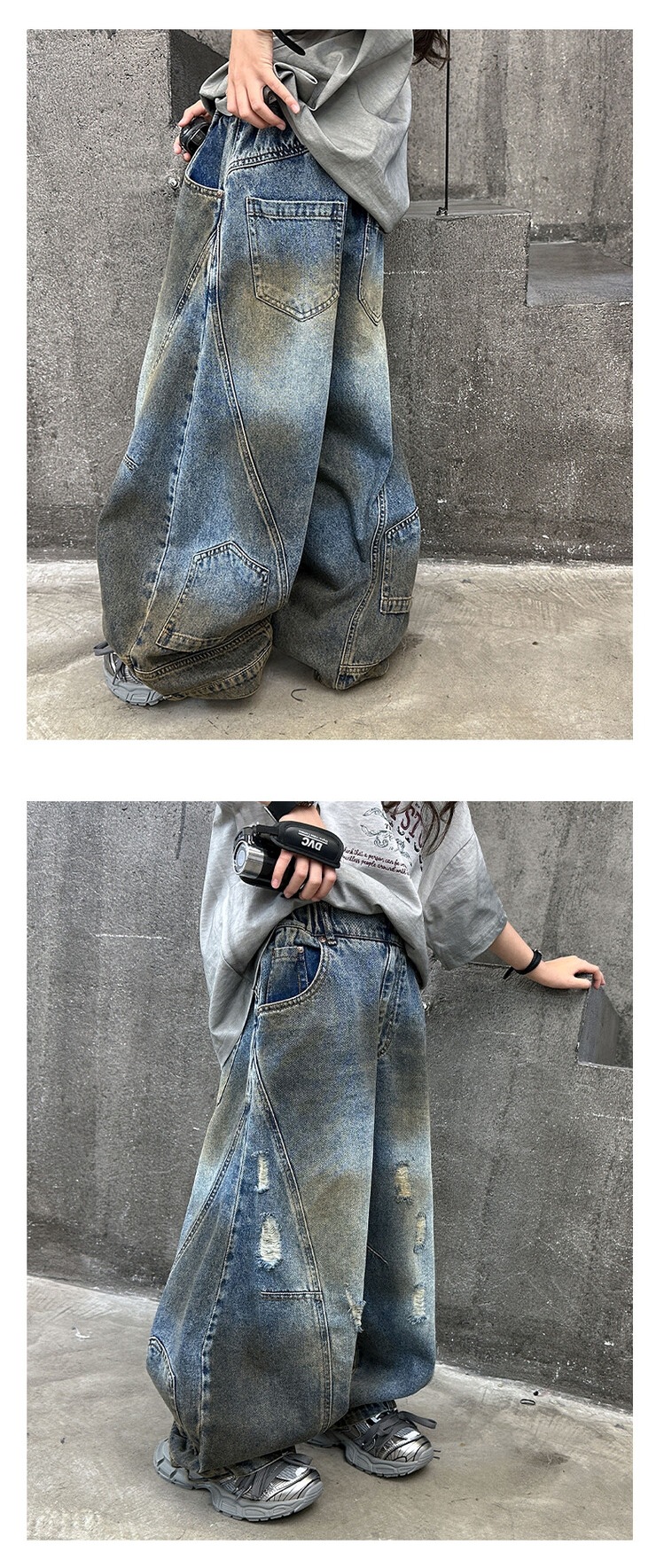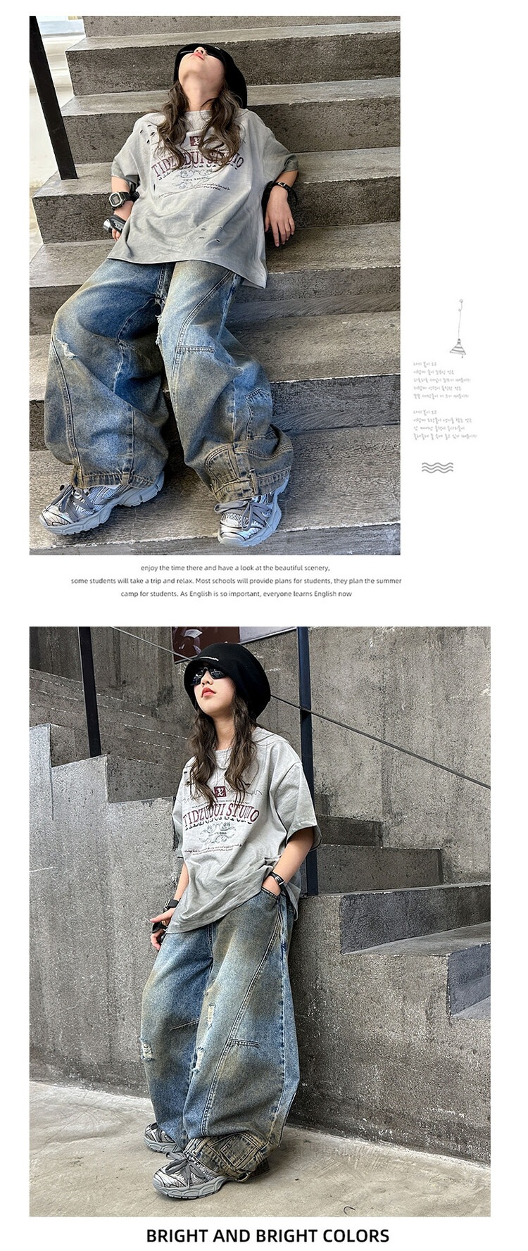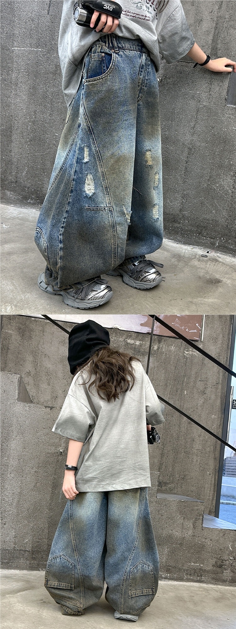 Zhili 한국 아동복 소녀 쿨 핸섬 청바지 느슨한 미국 복고풍 프로필 더러운 찢어진 넓은 다리 바지스토어 가기