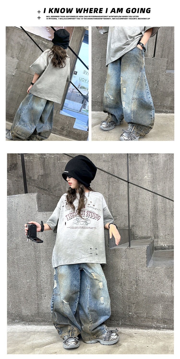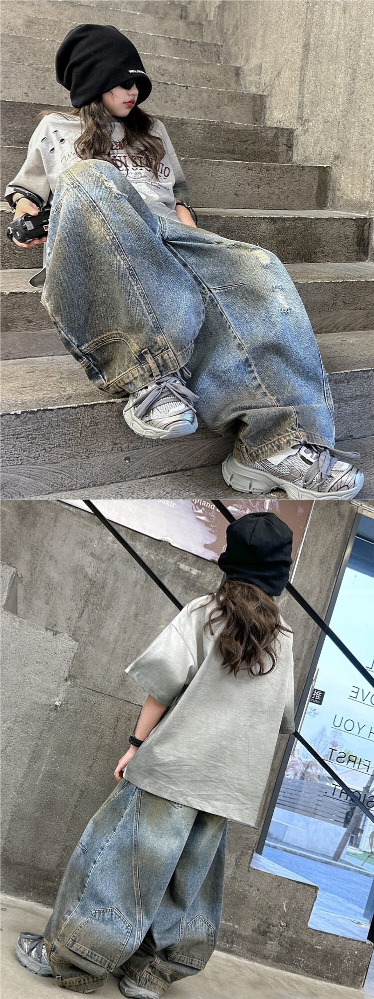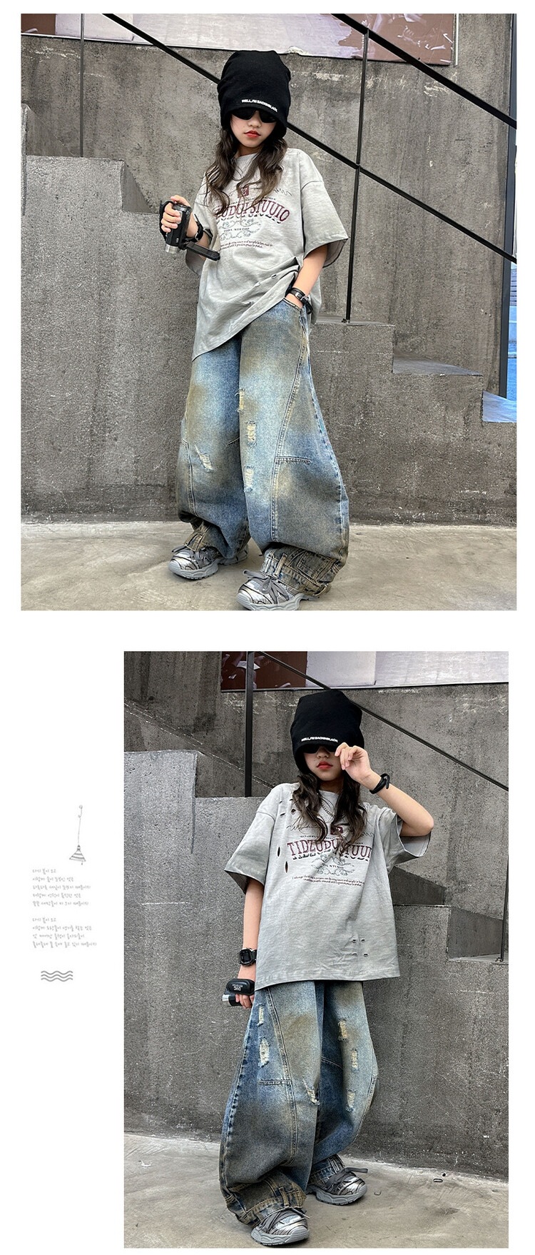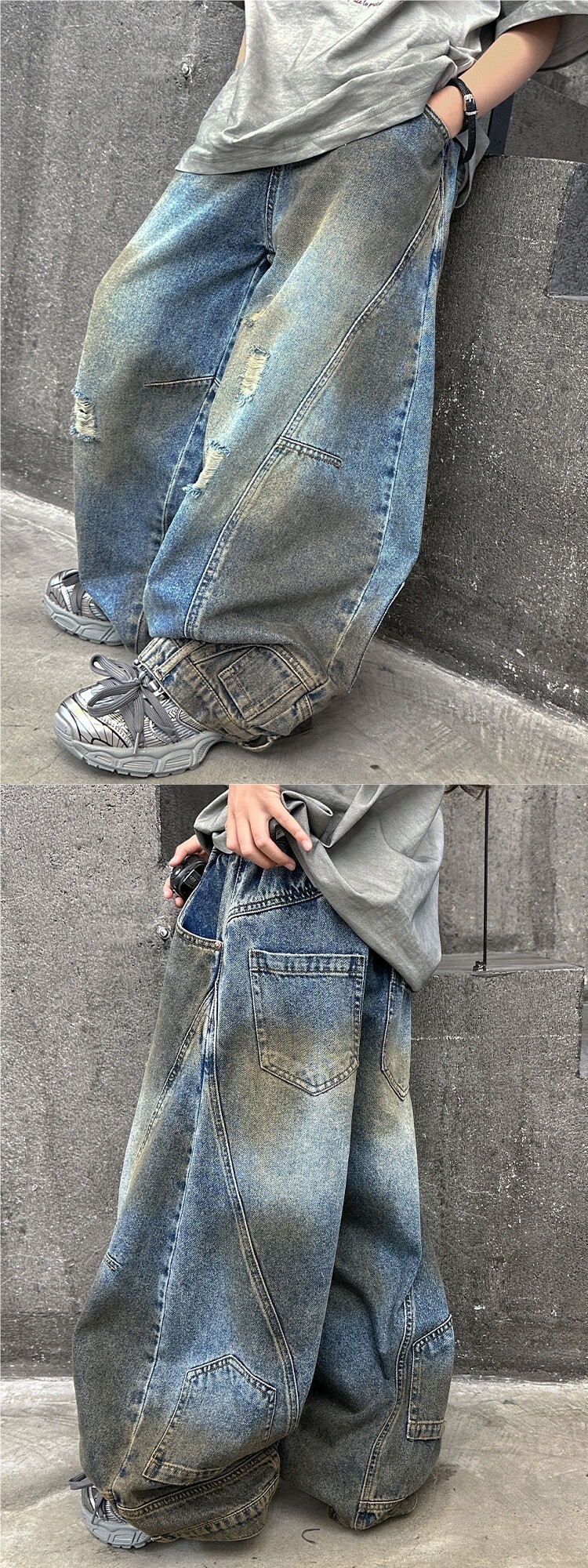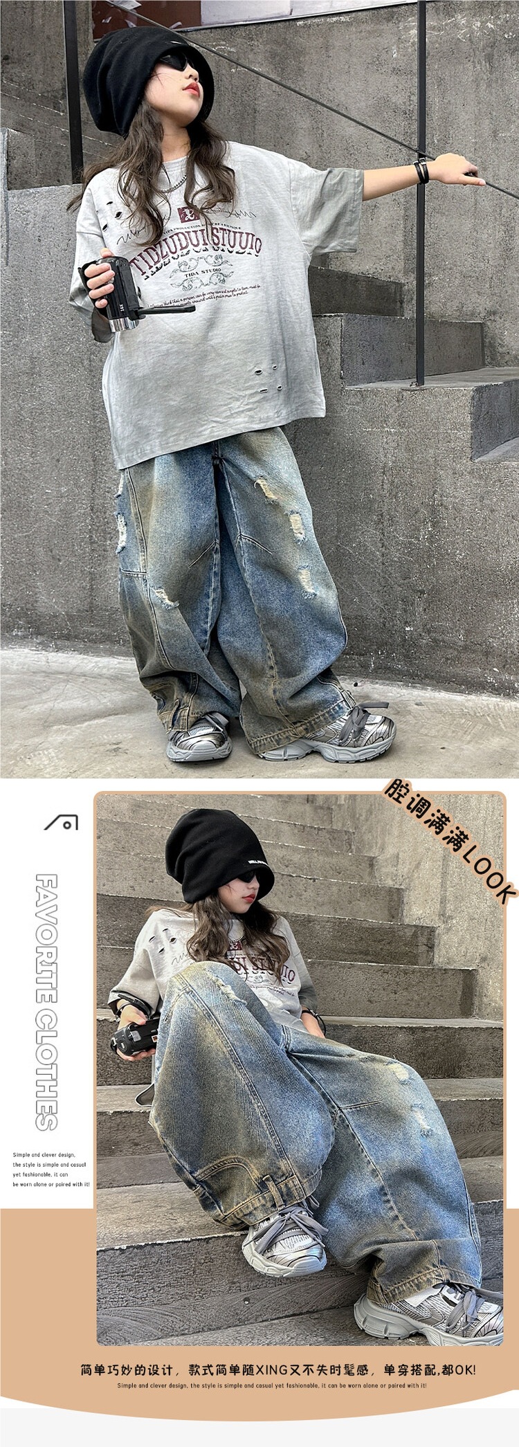 Zhili 한국 아동복 소녀 쿨 핸섬 청바지 느슨한 미국 복고풍 프로필 더러운 찢어진 넓은 다리 바지스토어 가기