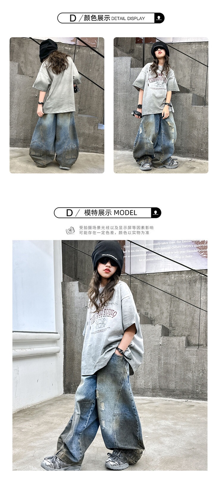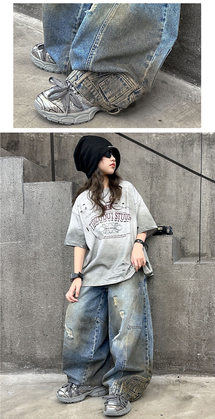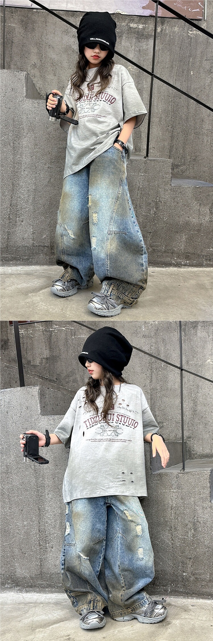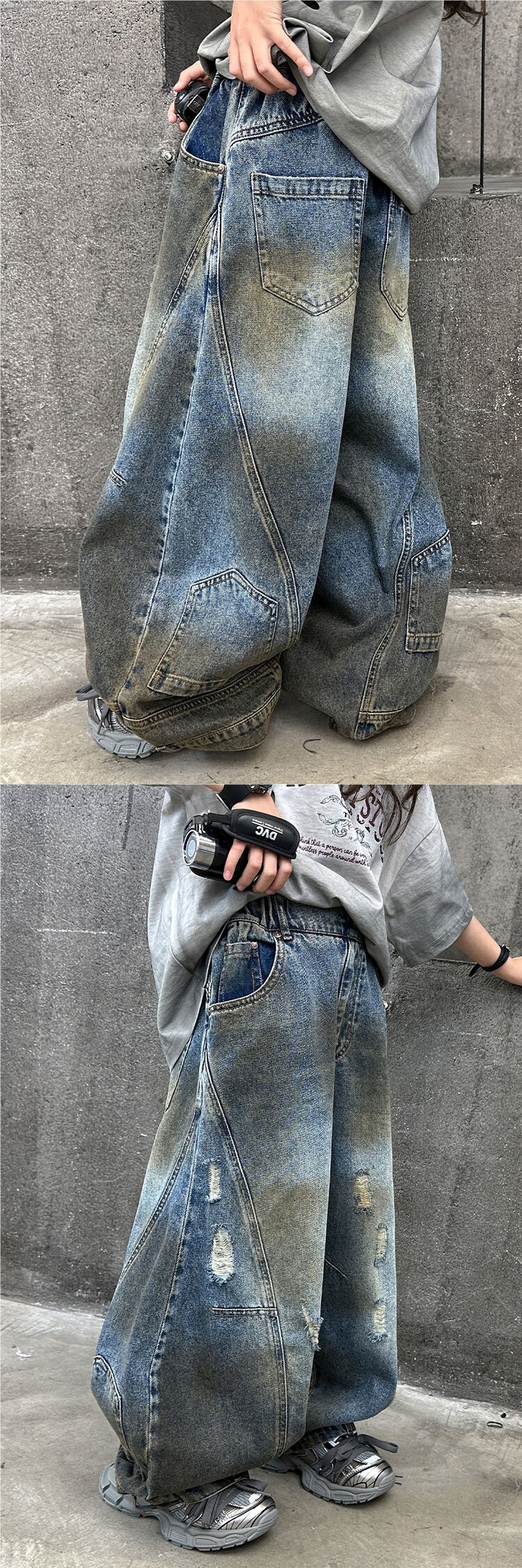 Zhili 한국 아동복 소녀 쿨 핸섬 청바지 느슨한 미국 복고풍 프로필 더러운 찢어진 넓은 다리 바지스토어 가기