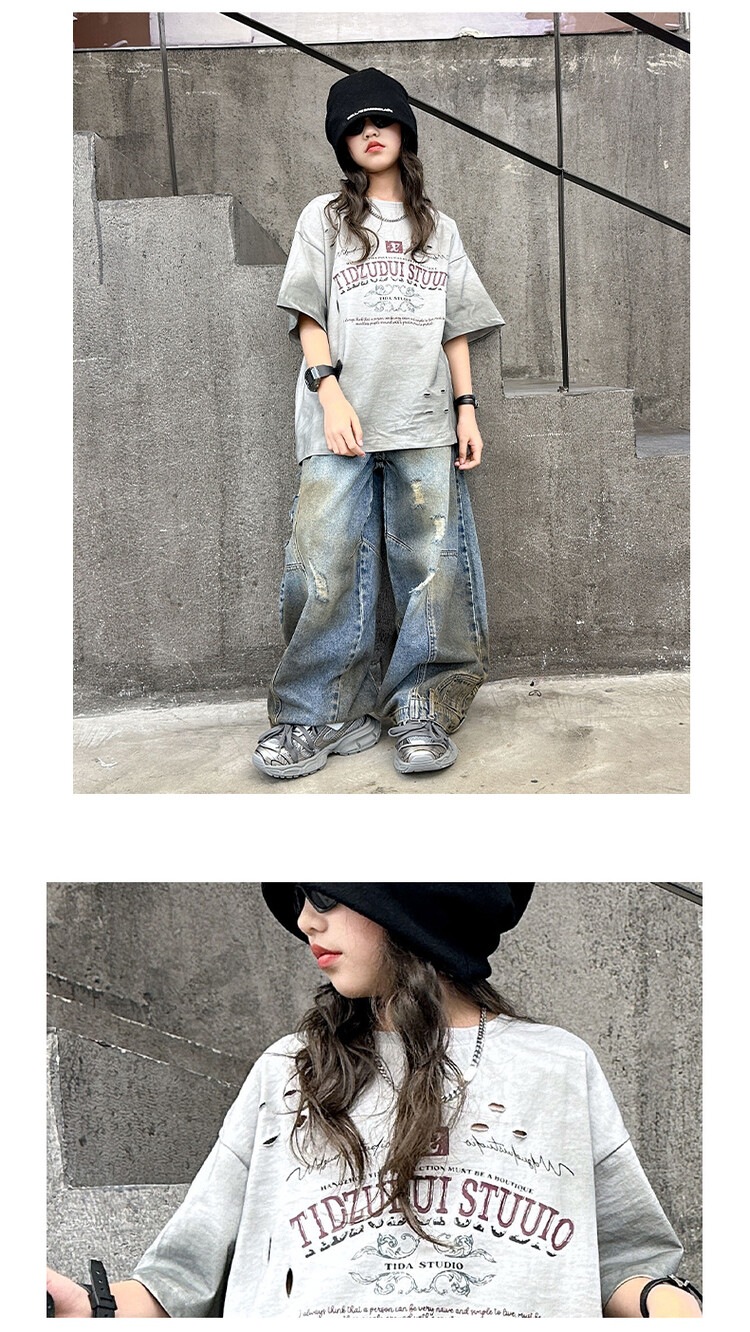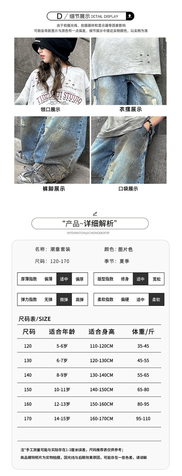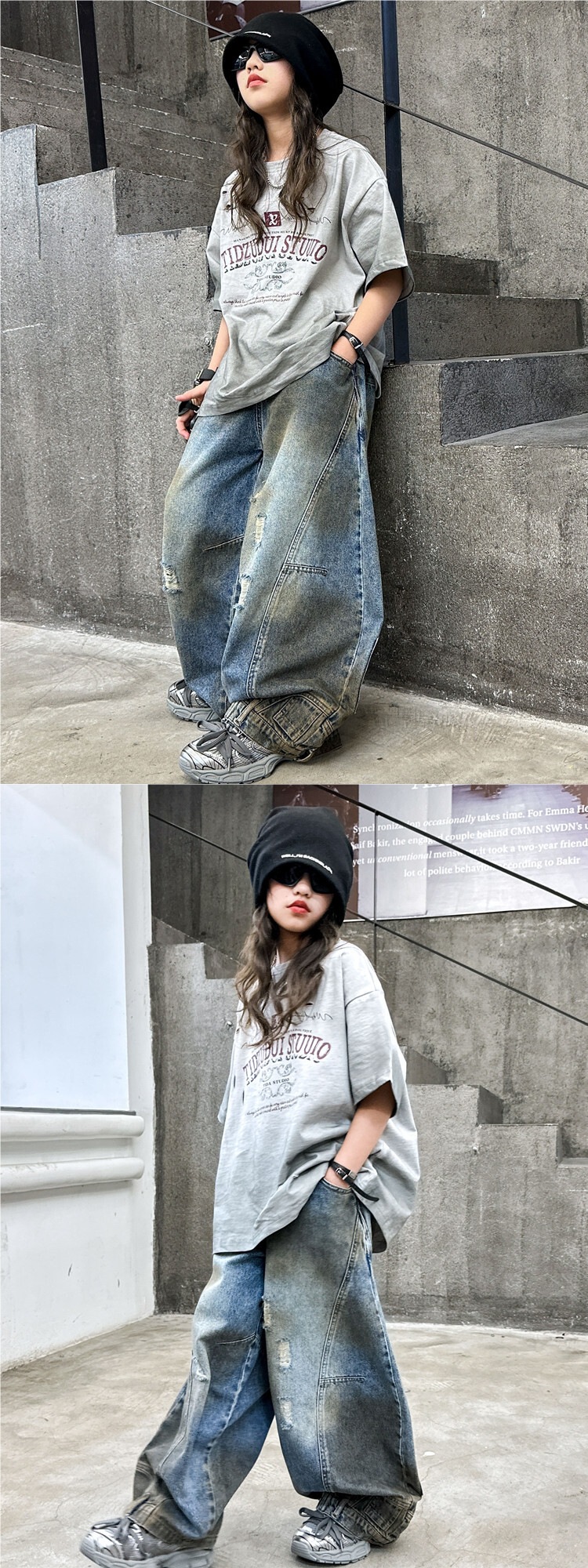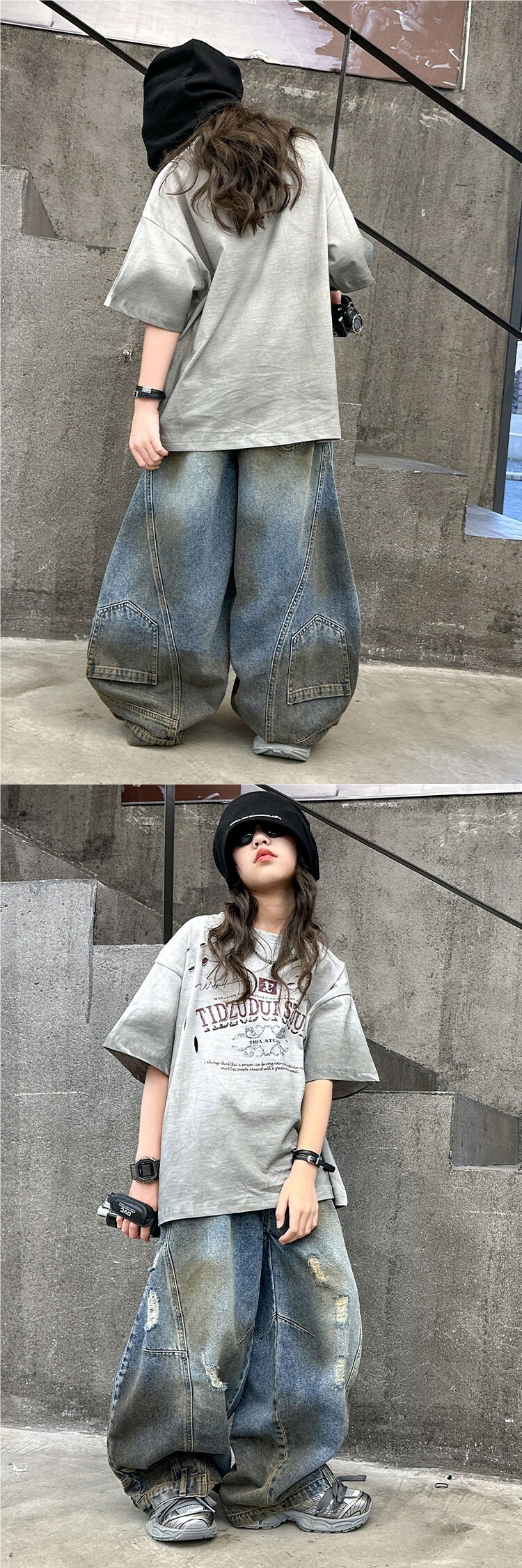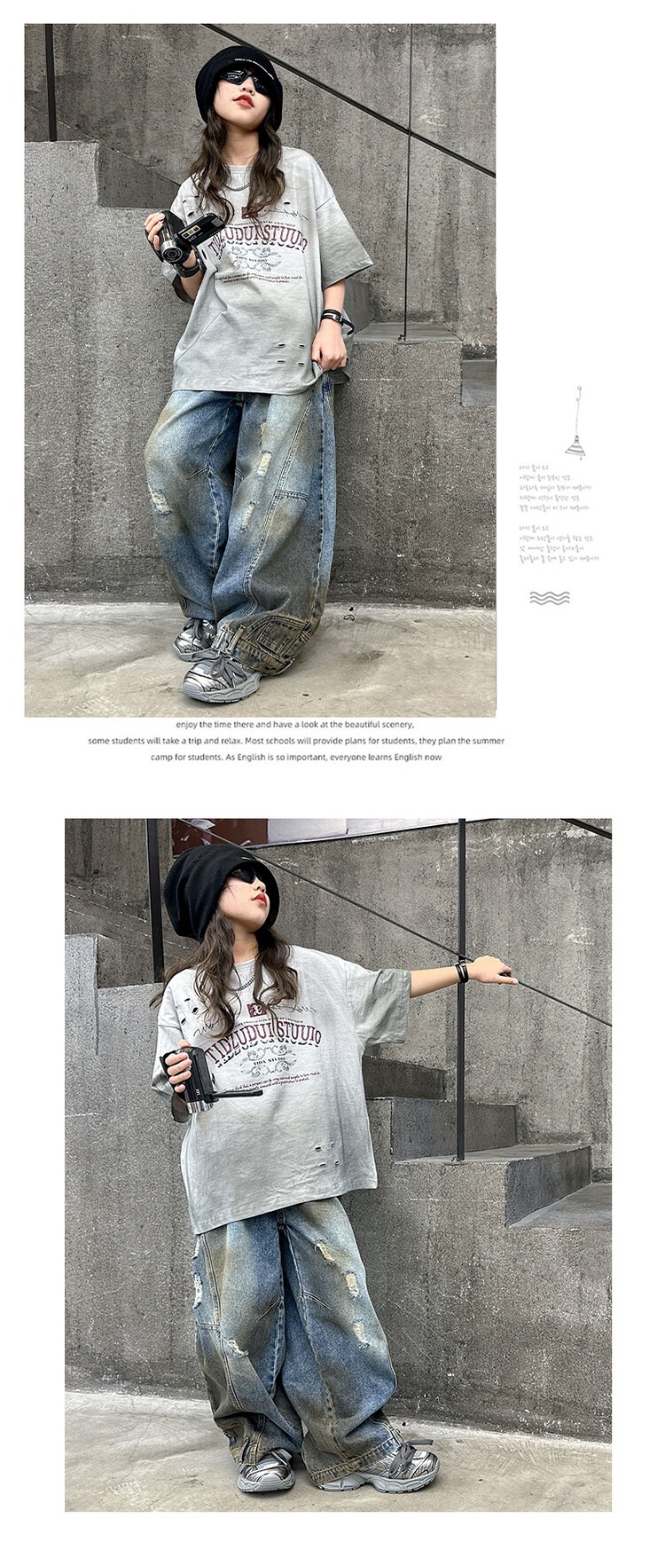 Zhili 한국 아동복 소녀 쿨 핸섬 청바지 느슨한 미국 복고풍 프로필 더러운 찢어진 넓은 다리 바지스토어 가기