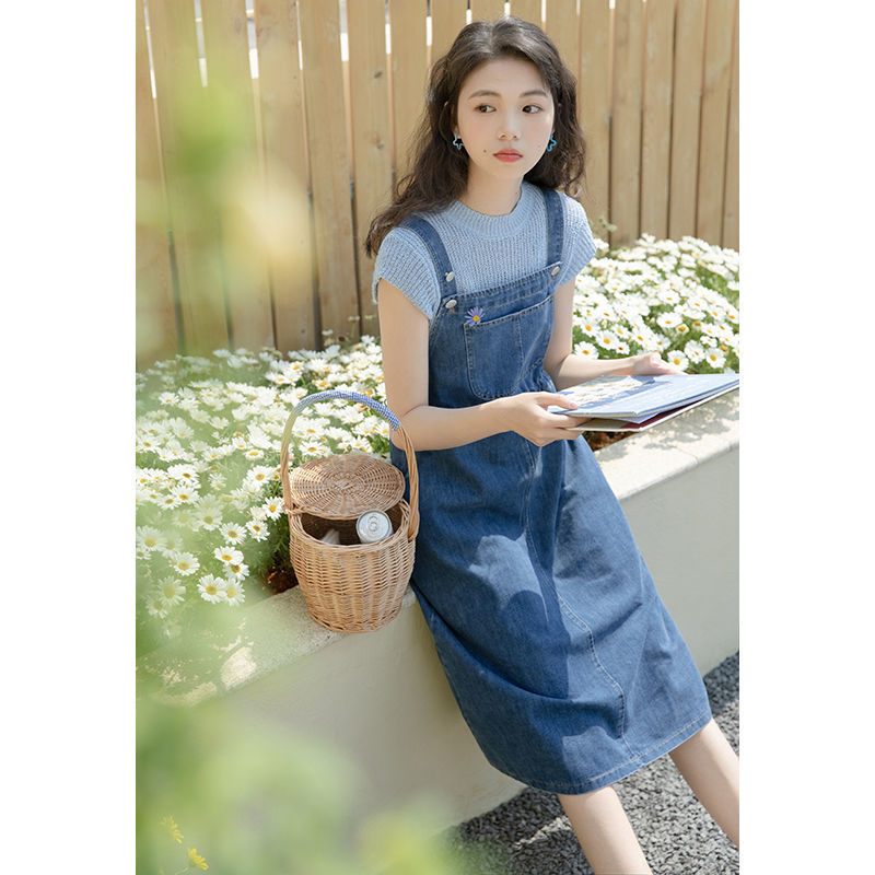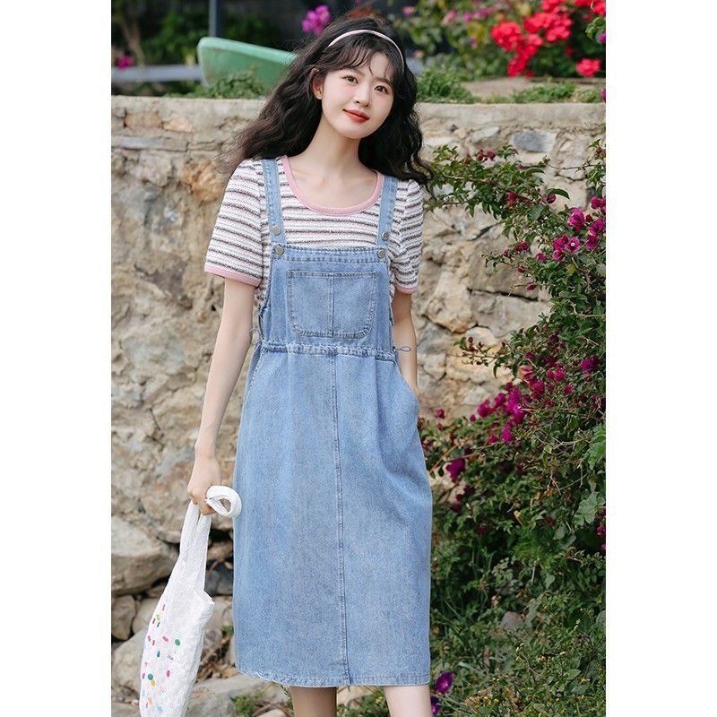 다크 블루 작은 여성용 스트랩 스커트 여름 2025 새로운 허리 우아한 패션 데님 원피스 긴 치마스토어 가기
