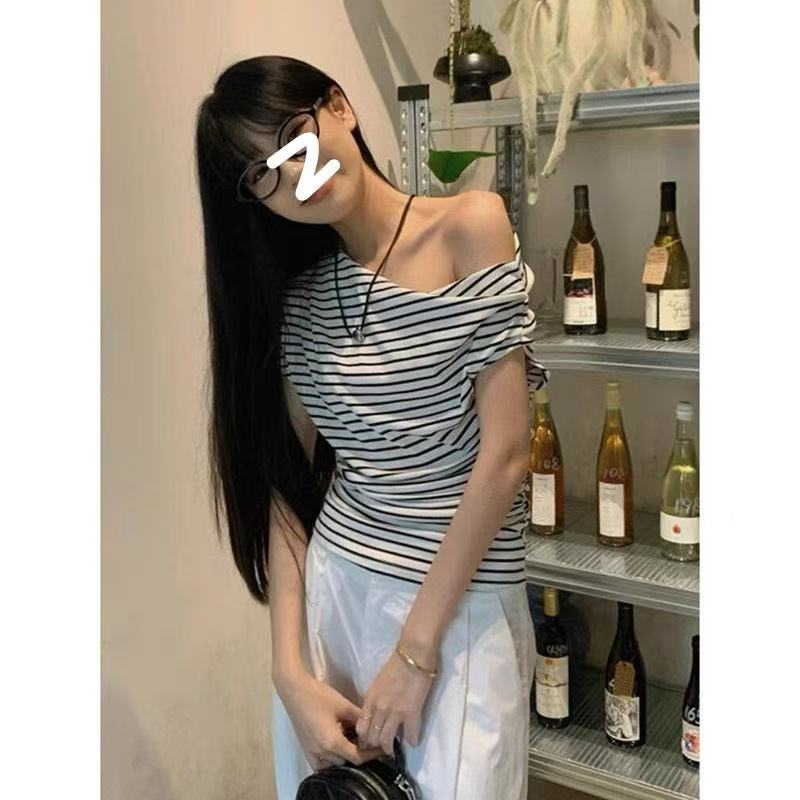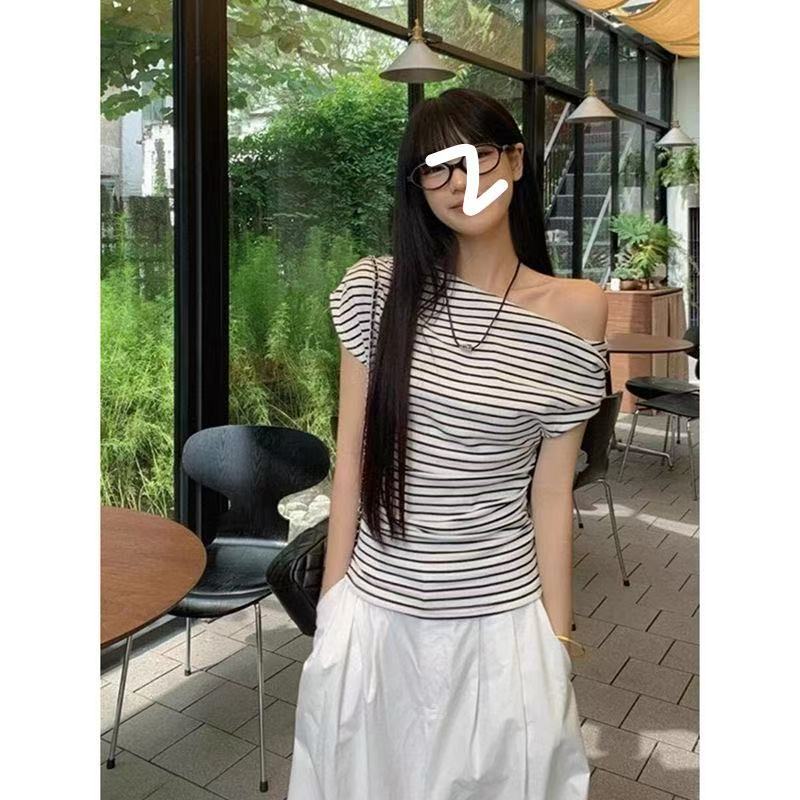 디자인 센스 슬란트 어깨 반팔 티셔츠 여성 2025 년 여름 새 스파이스 걸스 슬림핏 슬리밍 숄더 스트라이프 학생 탑스토어 가기