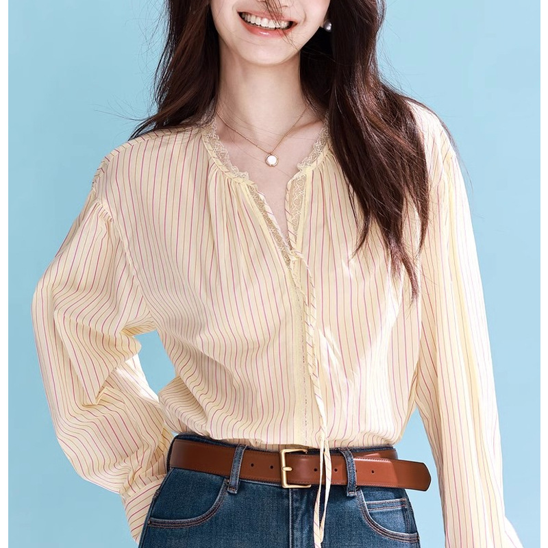 노란색 줄무늬 스티칭 레이스 업 셔츠 여성의 2025 봄 새로운 디자인 센스 탑스토어 가기