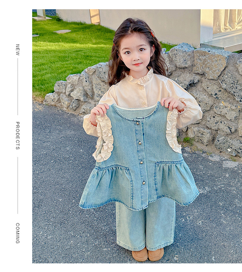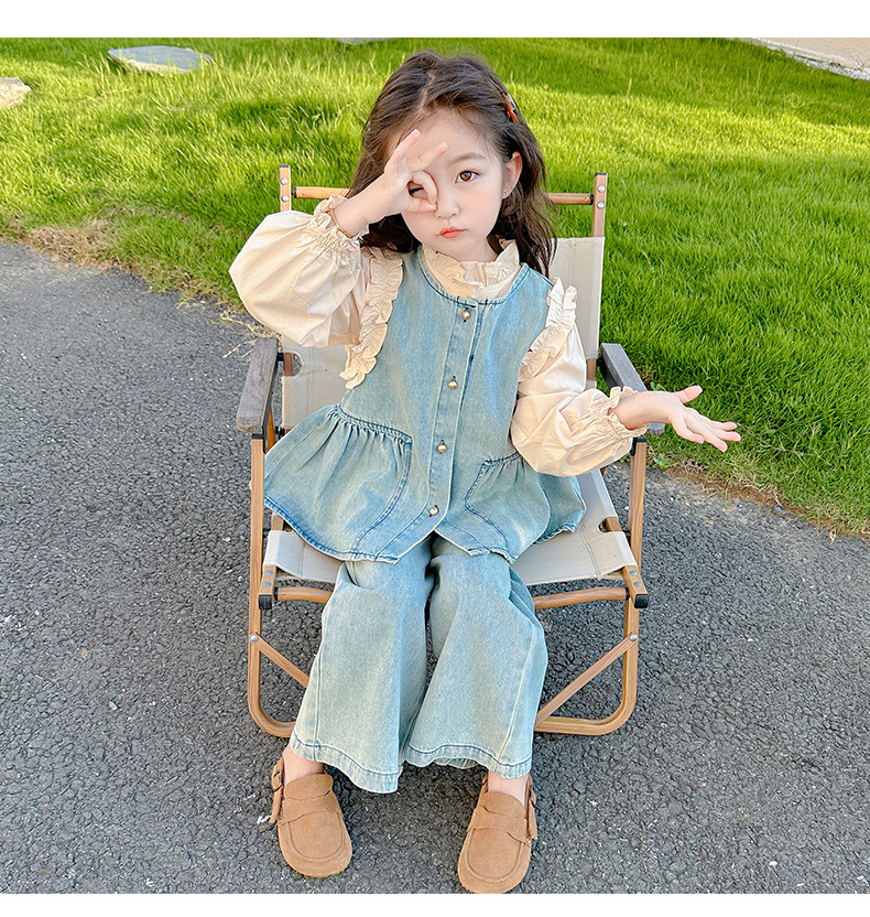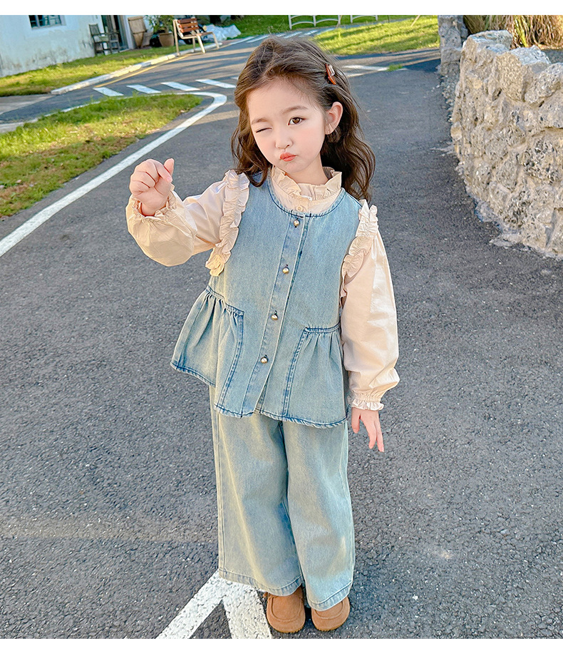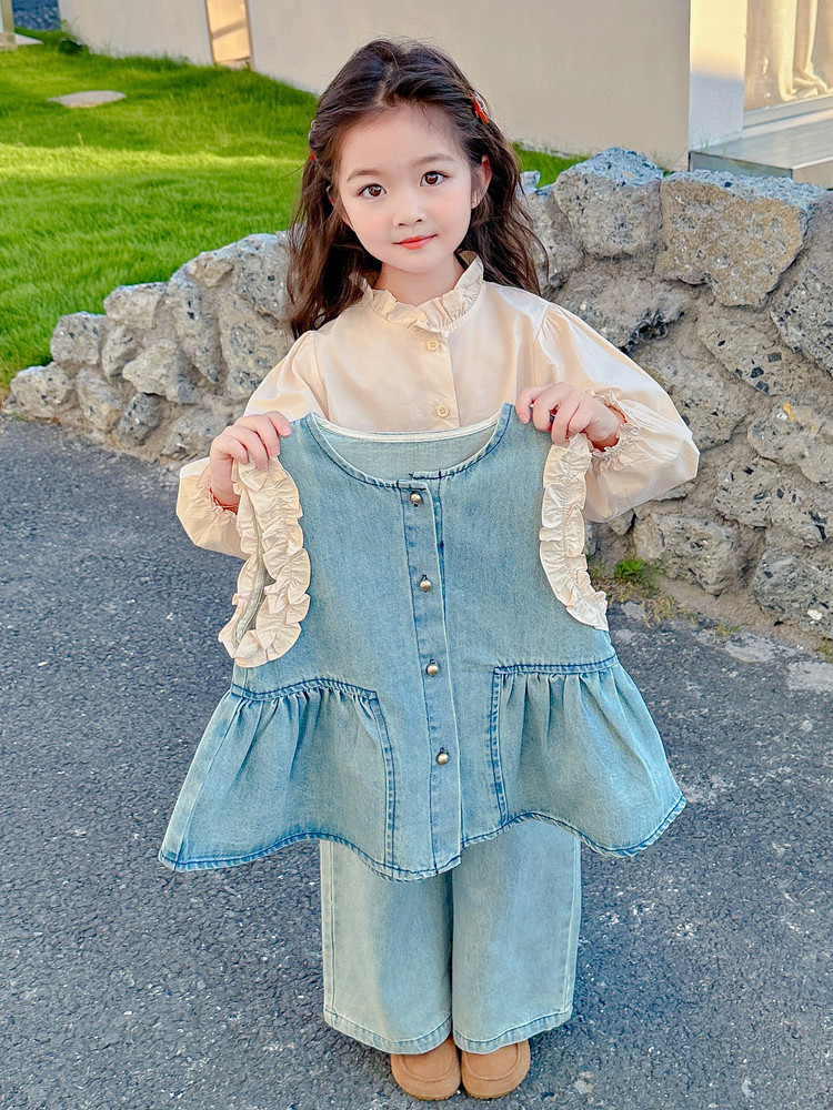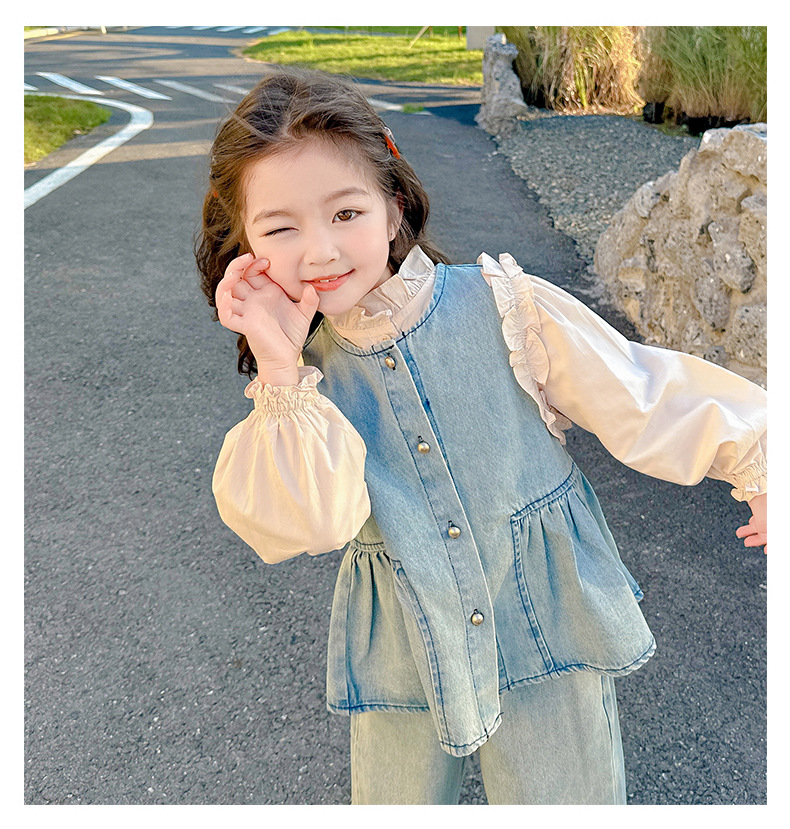 소녀 세트 봄과 가을 2025 새로운 스타일 어린이 데님 조끼 인터넷 축하 어린 소녀의 레이스 셔츠 3 피스 세트