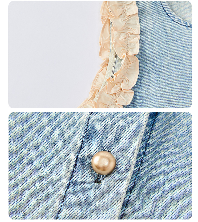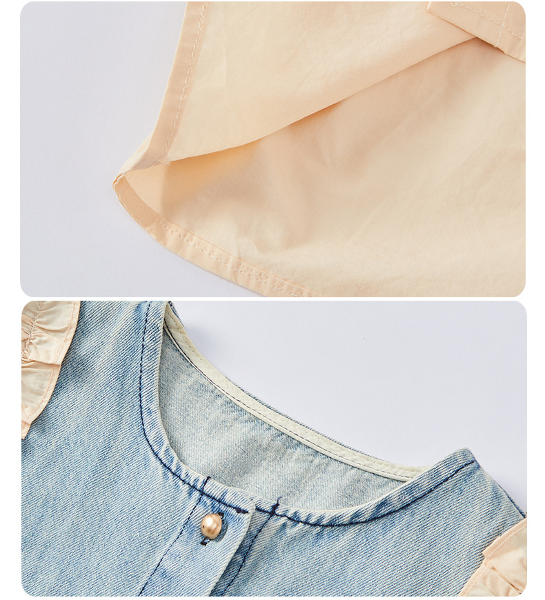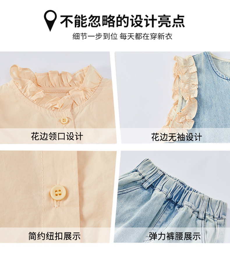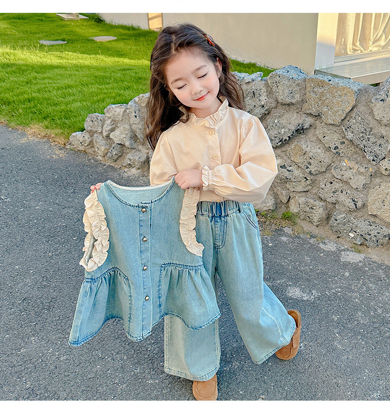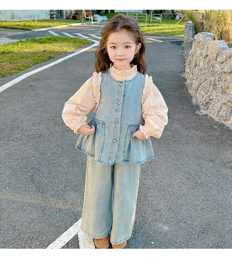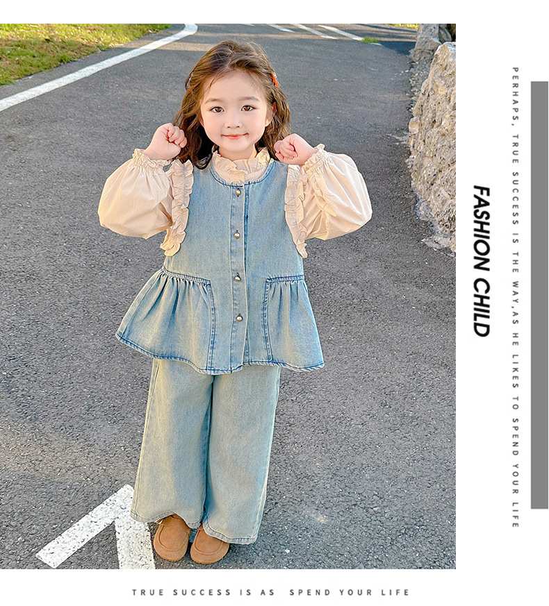 소녀 세트 봄과 가을 2025 새로운 스타일 어린이 데님 조끼 인터넷 축하 어린 소녀의 레이스 셔츠 3 피스 세트
