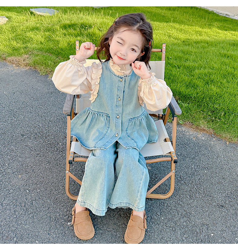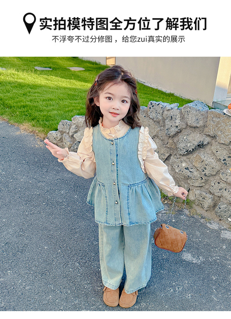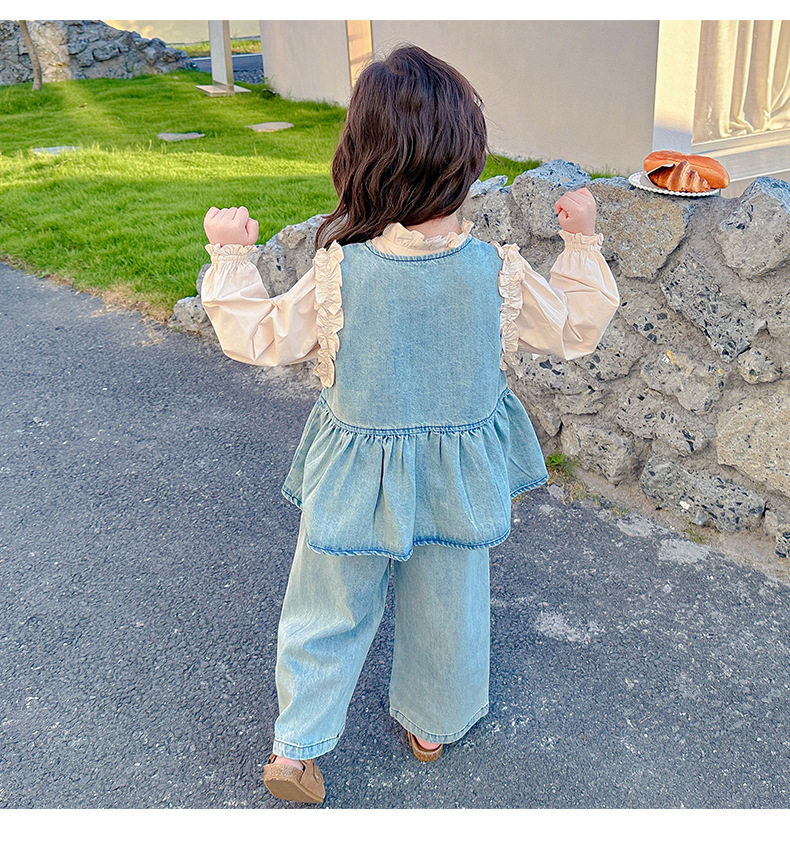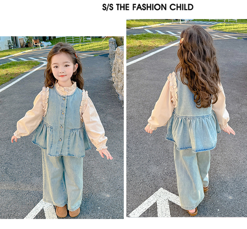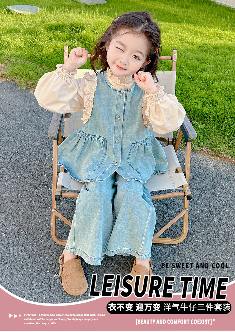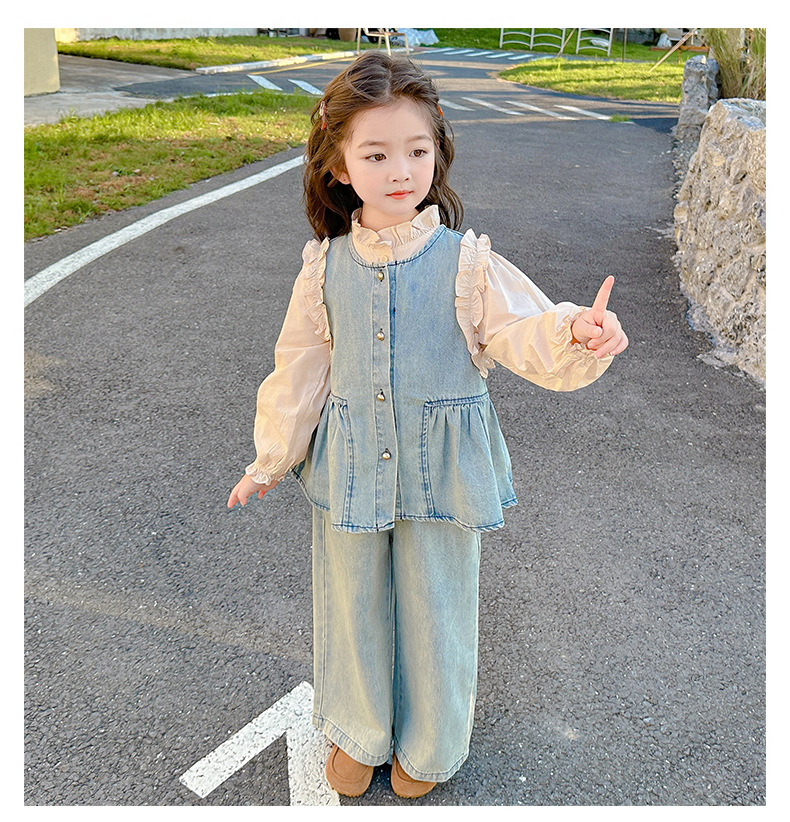 소녀 세트 봄과 가을 2025 새로운 스타일 어린이 데님 조끼 인터넷 축하 어린 소녀의 레이스 셔츠 3 피스 세트스토어 가기