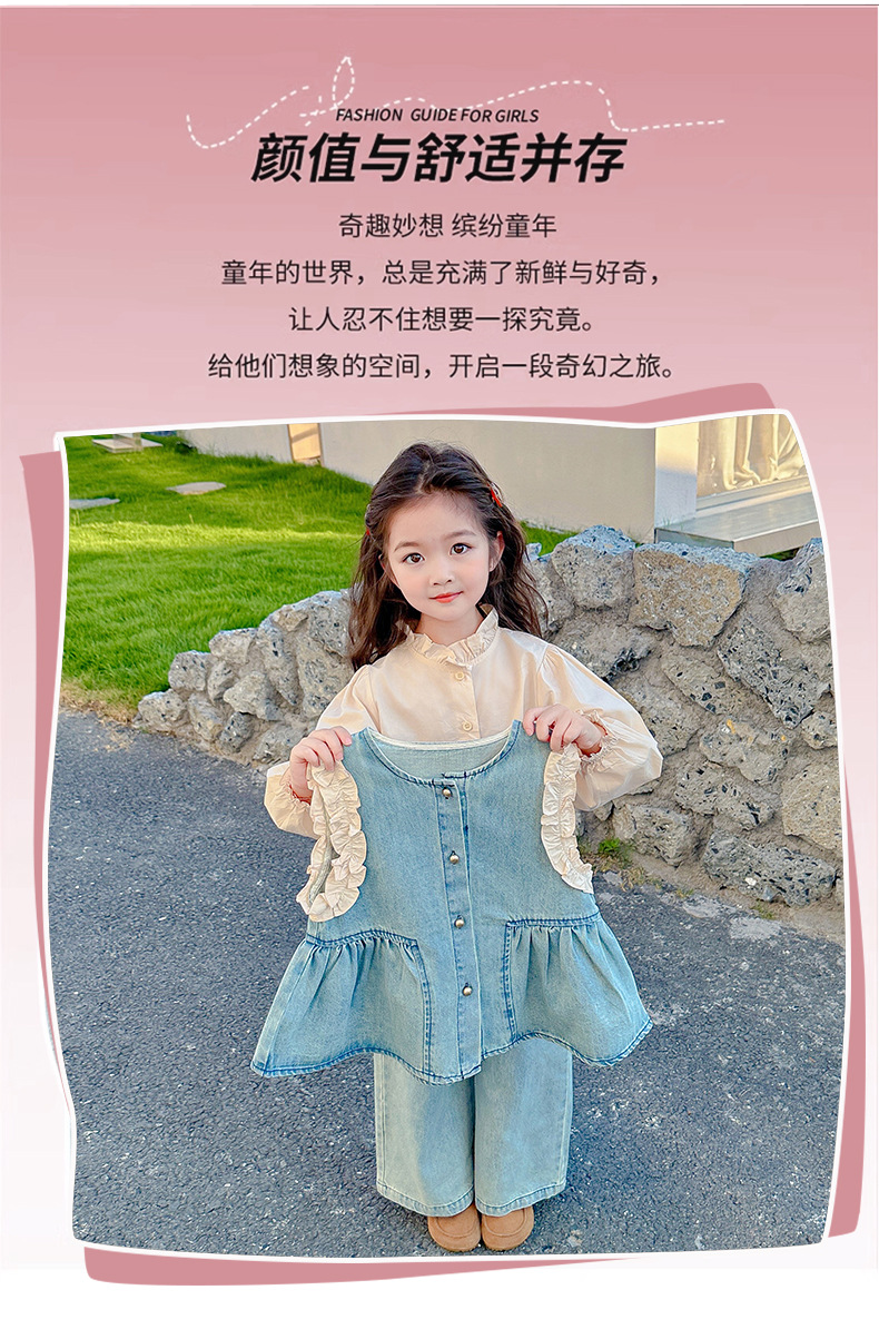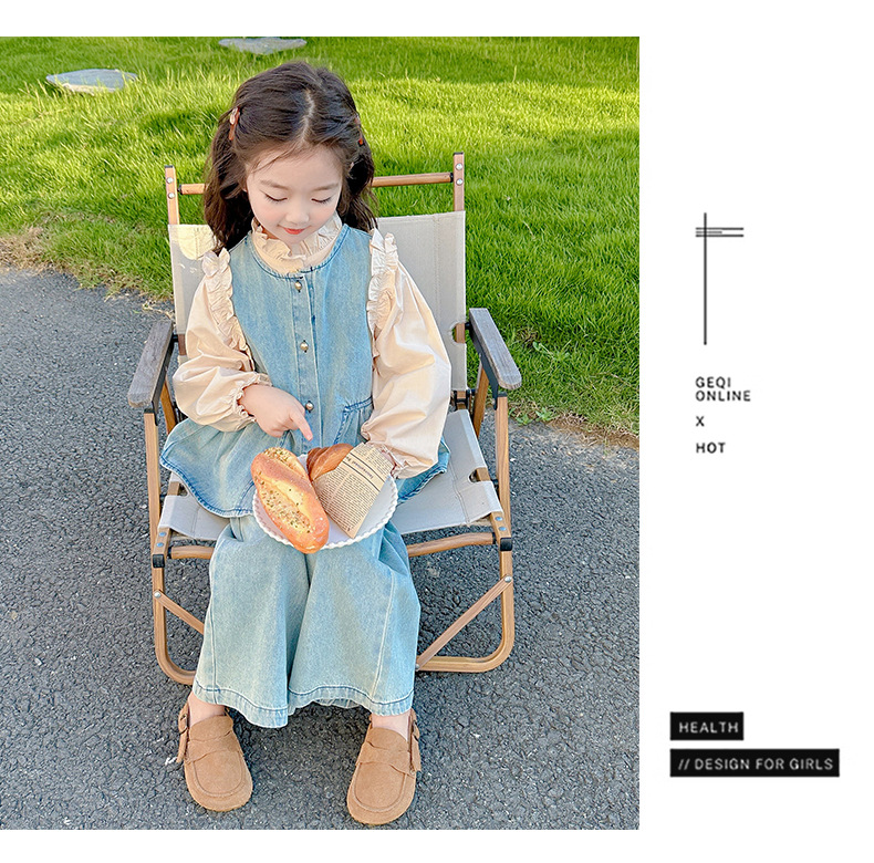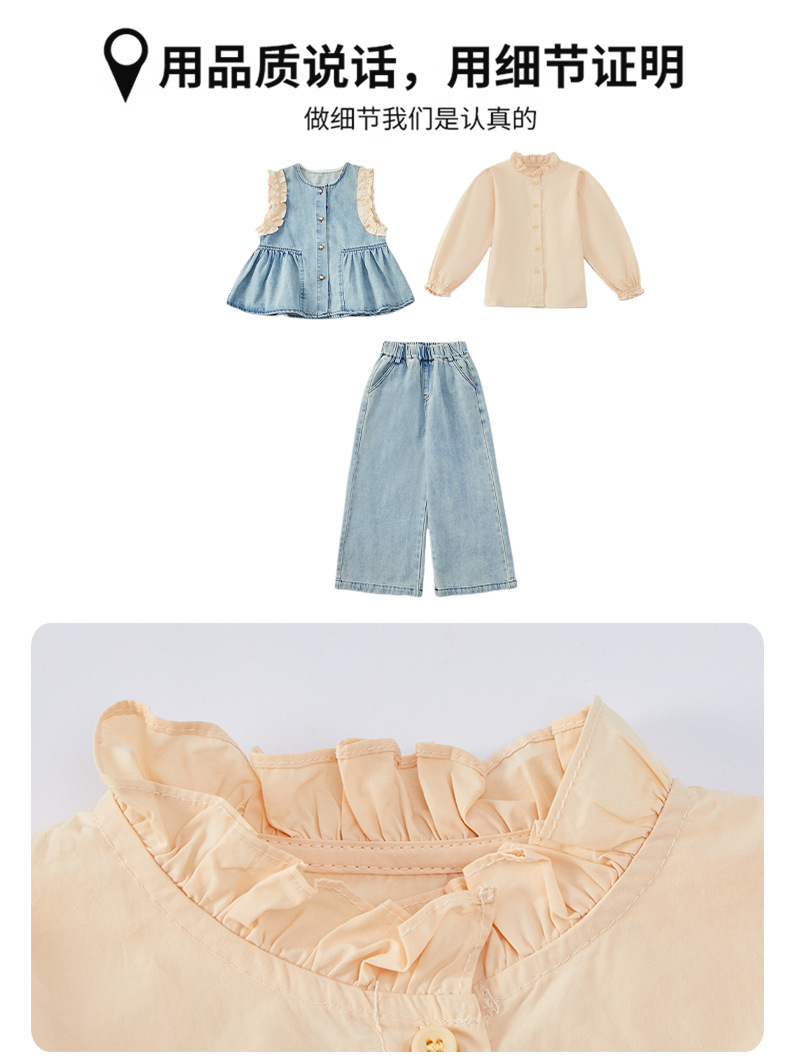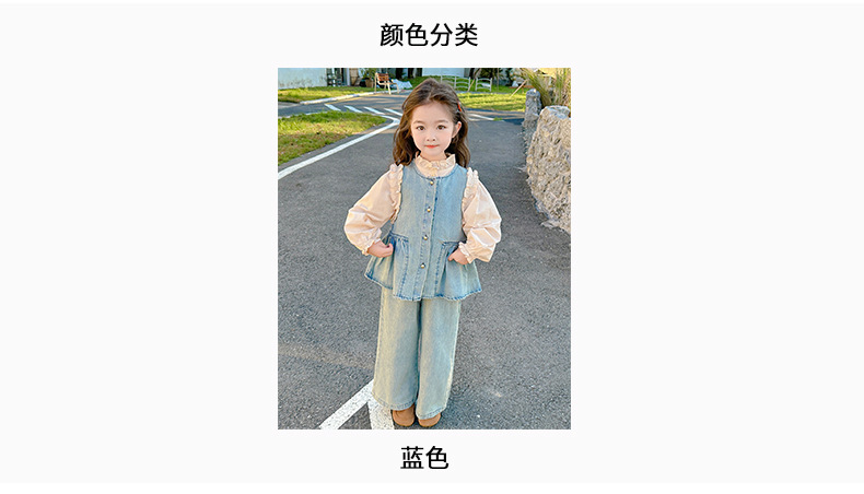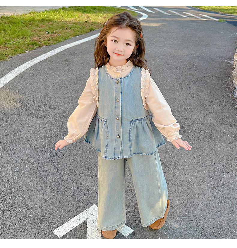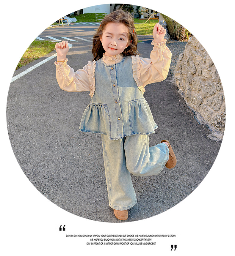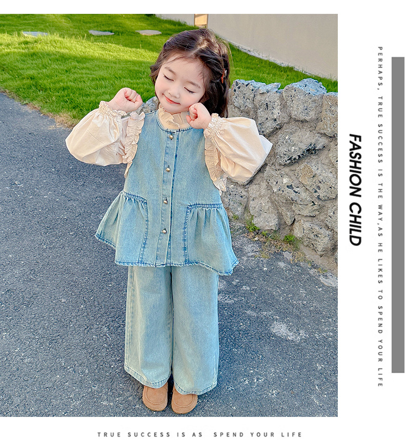 소녀 세트 봄과 가을 2025 새로운 스타일 어린이 데님 조끼 인터넷 축하 어린 소녀의 레이스 셔츠 3 피스 세트스토어 가기