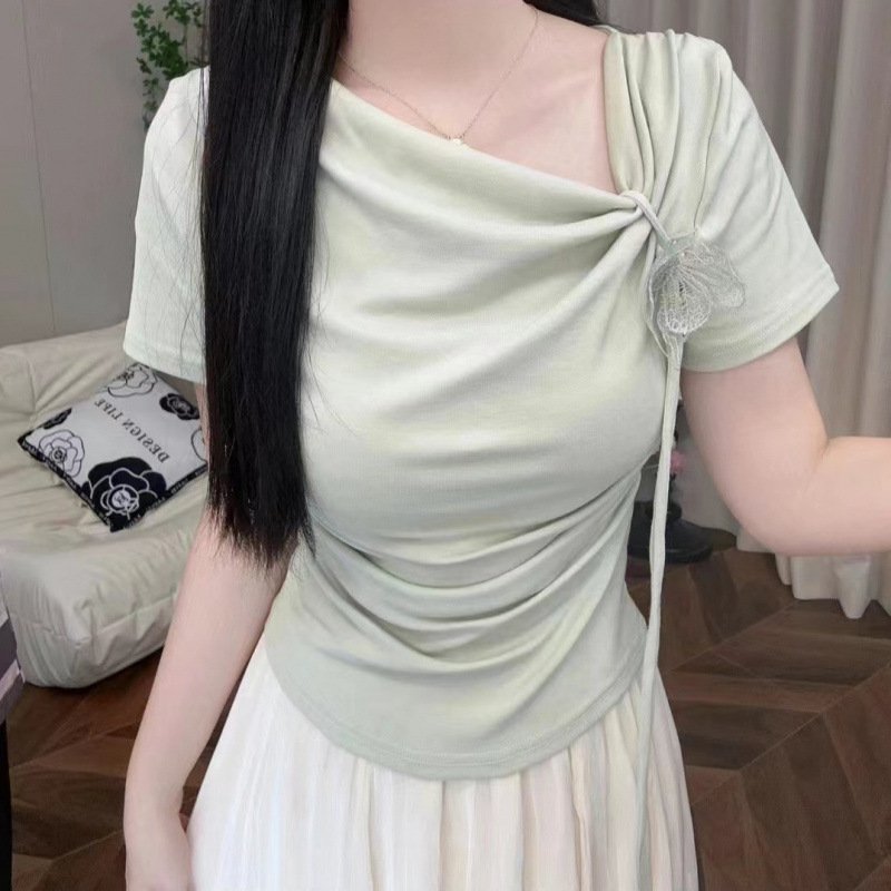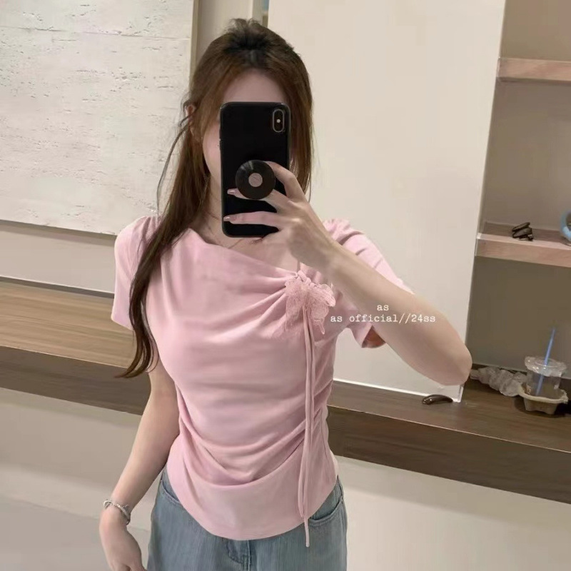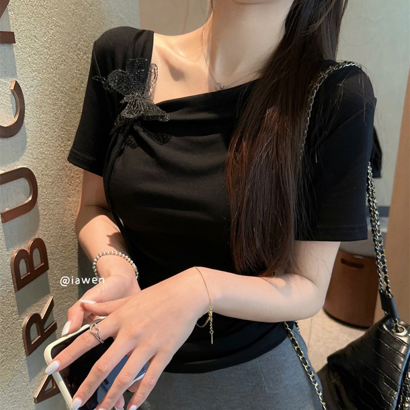 3 차원 나비 비스듬한 칼라 어깨 반팔 티셔츠 여성 2025 년 여름 디자인 센스 스파이스 걸스 순수한 욕망 불규칙한 탑스토어 가기