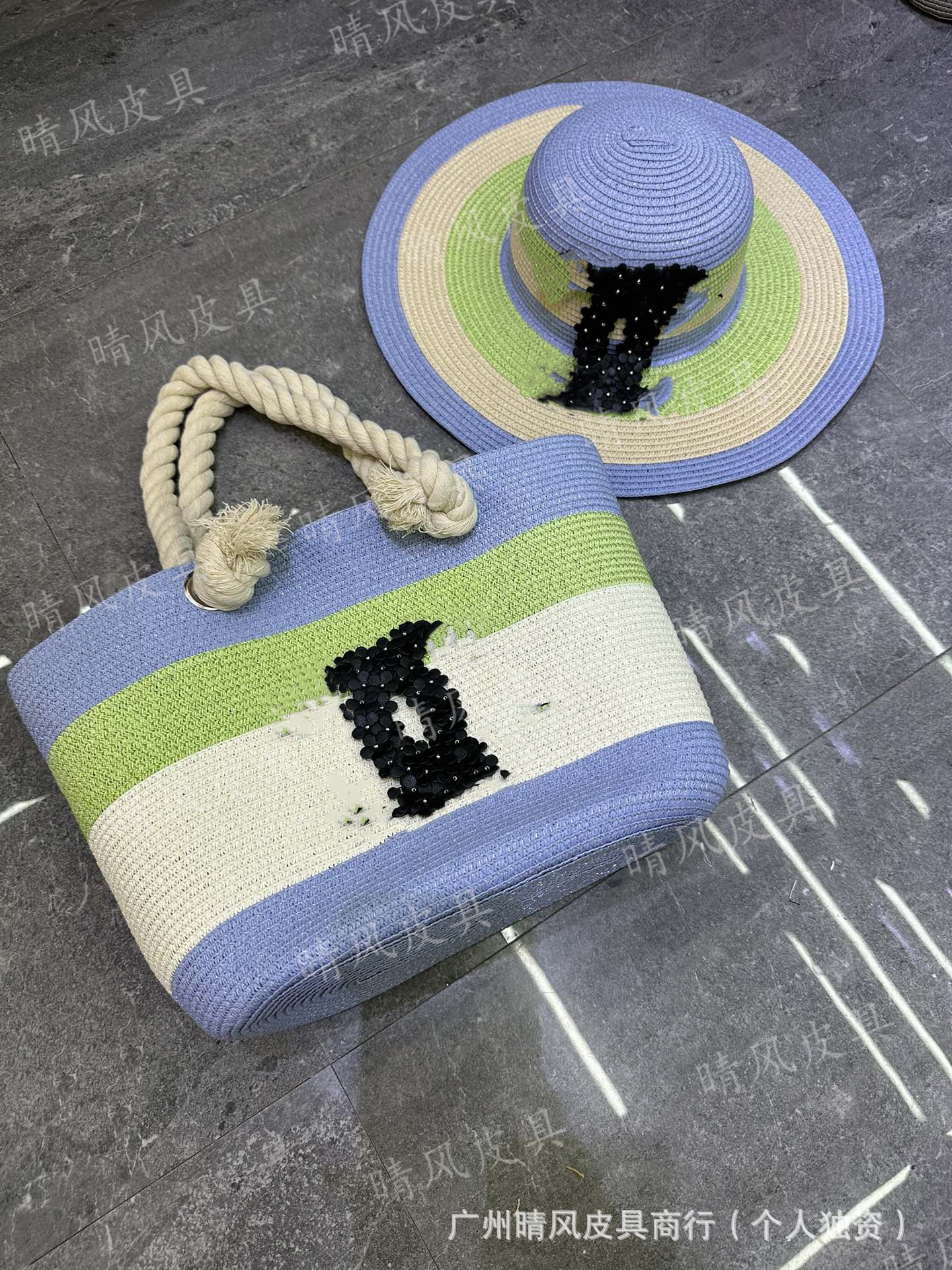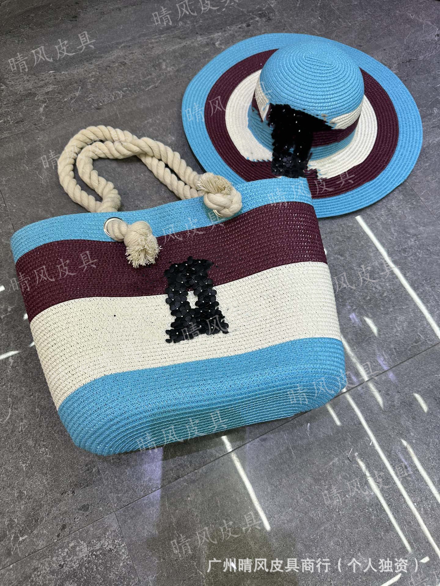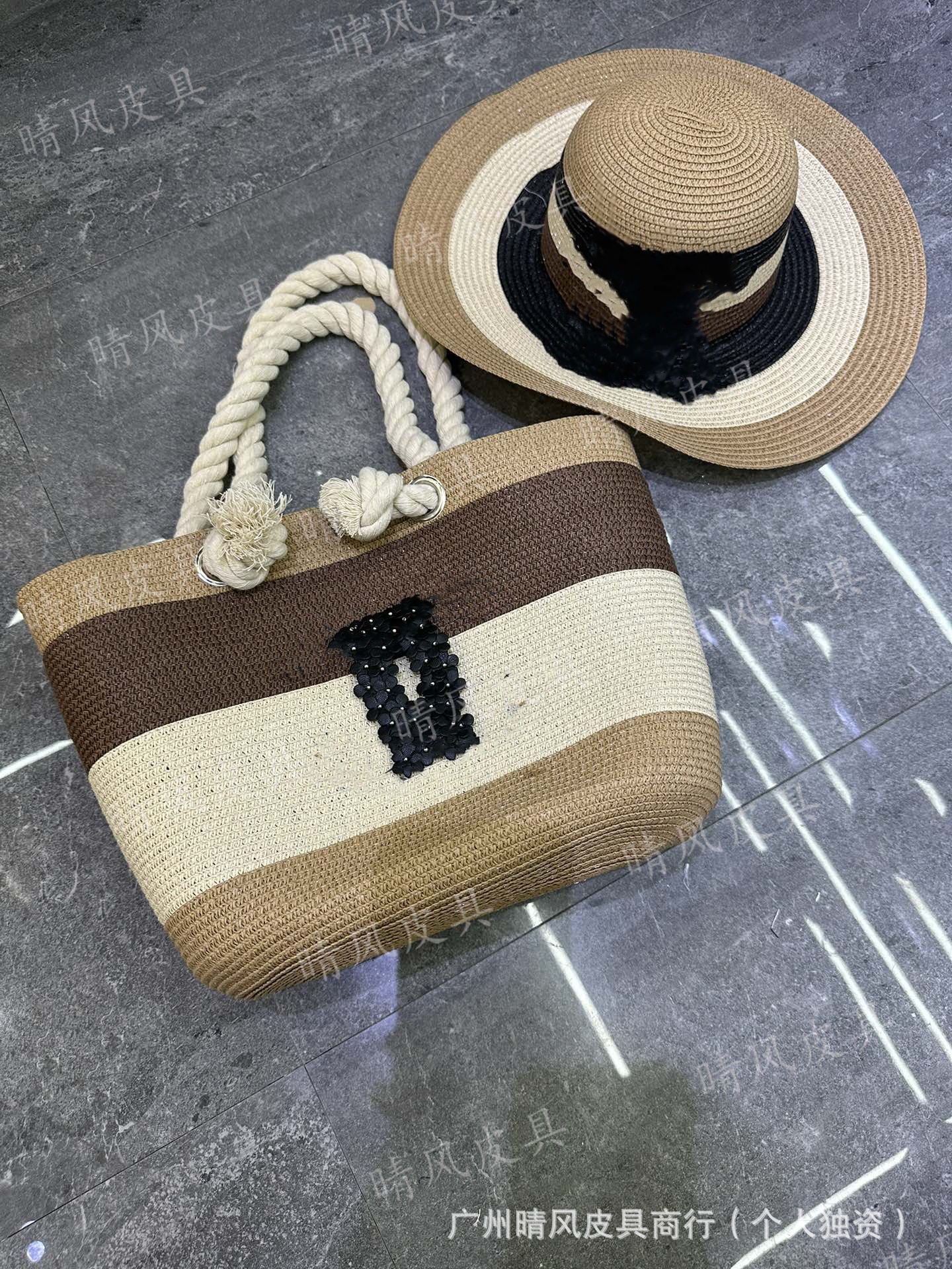 도매 유럽과 미국의 2025 새로운 세트 비치 백 캡 대용량 휴가 해변 짠 스트라이프 가방 레저 여행스토어 가기