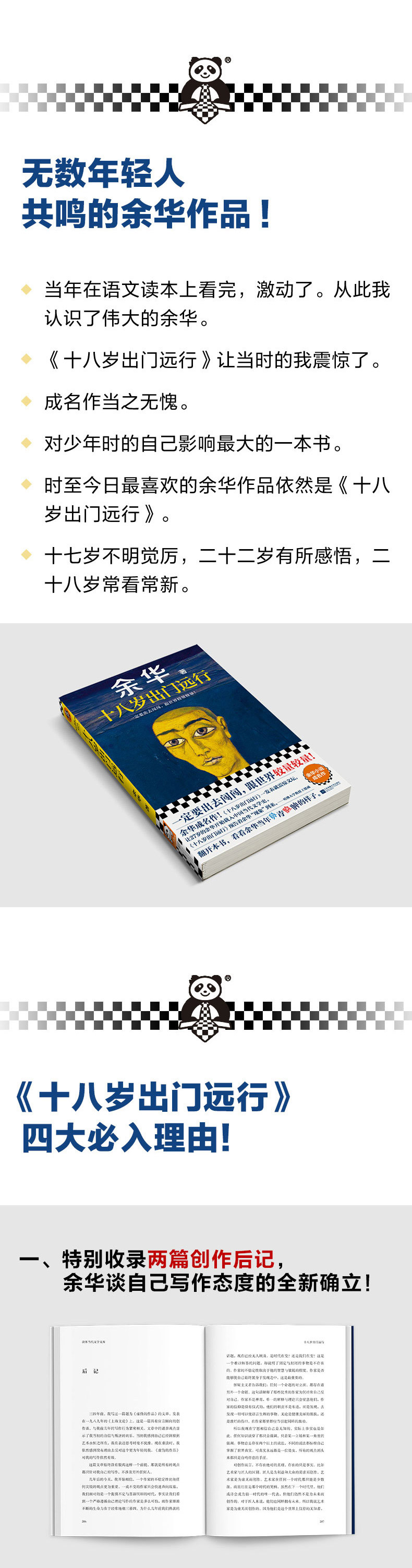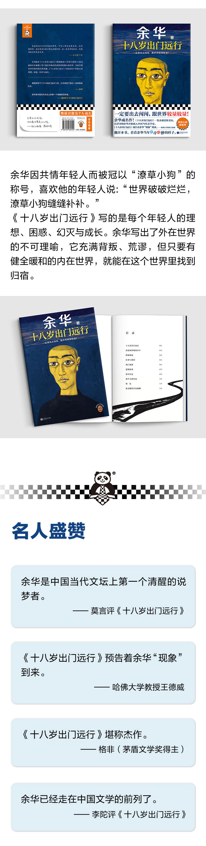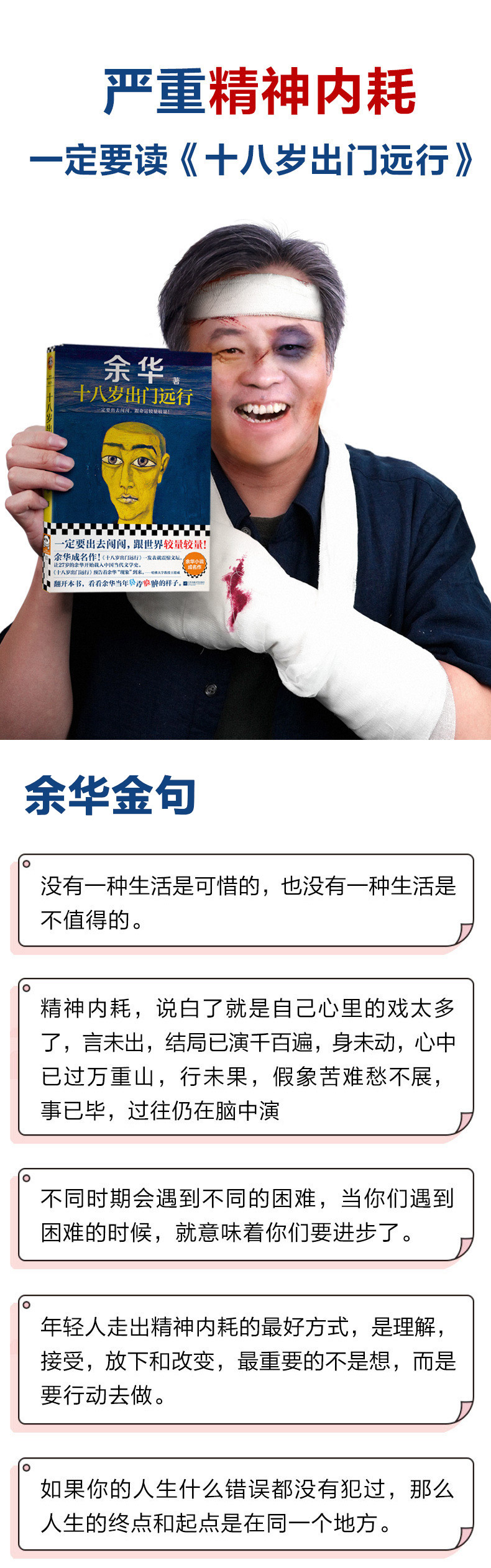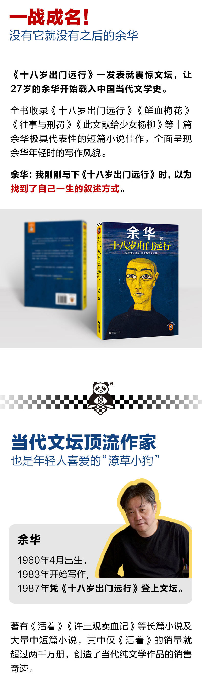 《十八岁出门远行》是余华的成名作,这篇小说被认为是余华整个创作生涯的原点。小说以一个精巧的寓言呈现了年轻人初入社会的普遍状态。余华写出了外在世界的不可理喻,它充满背叛、荒谬和残酷,但只要有健全暖和的内在世界,就能在这个世界里找到归宿,给年轻人以积极的力量。
