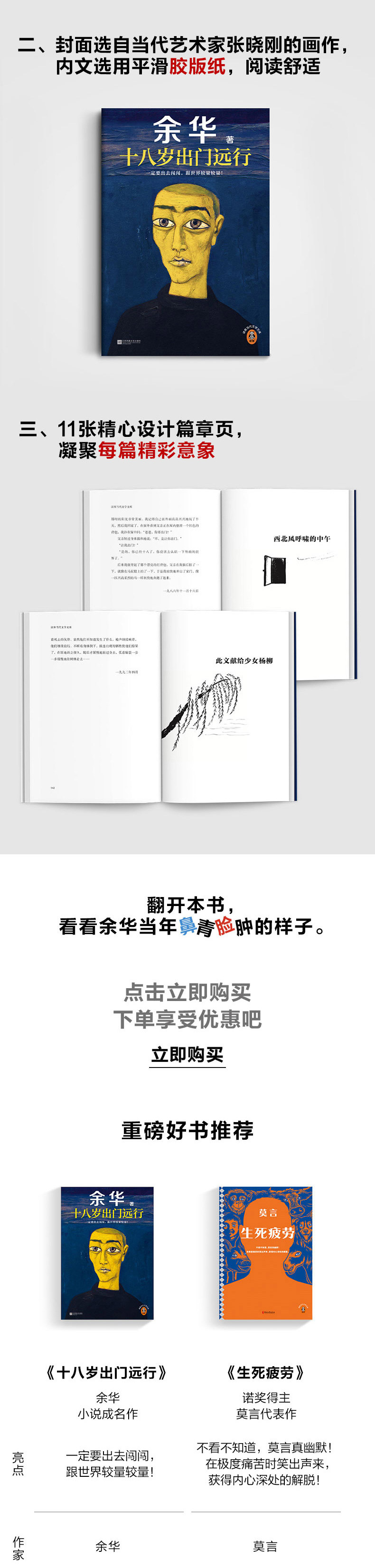 全书收录《十八岁出门远行》《鲜血梅花》《往事与刑罚》《此文献给少女杨柳》等十篇余华极具代表性的短篇小说佳作,全面呈现余华年轻时的写作风貌。《十八岁出门远行》写的是每个年轻人的理想、困惑、幻灭与成长。