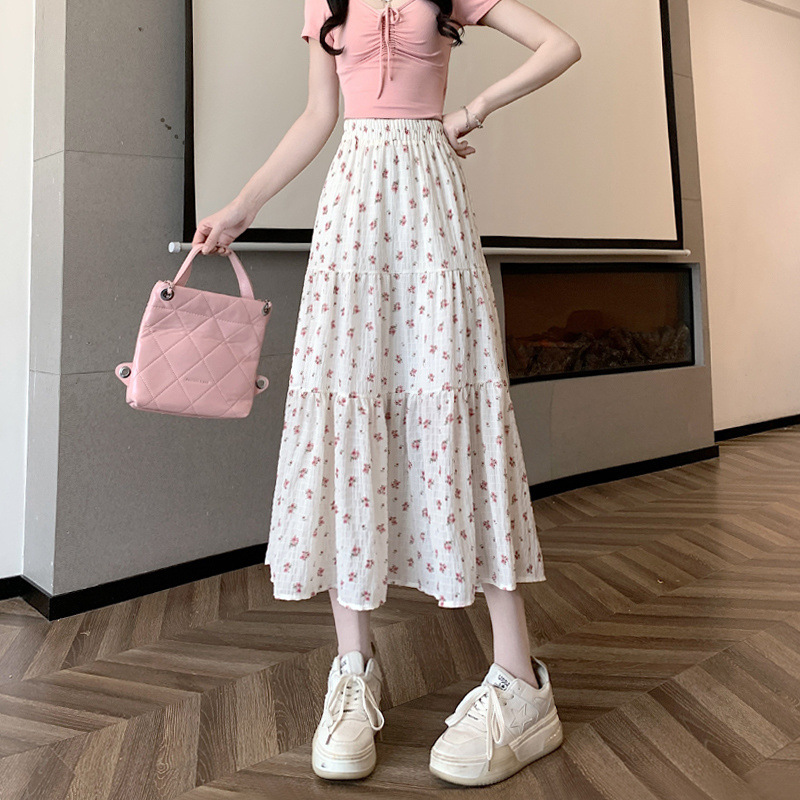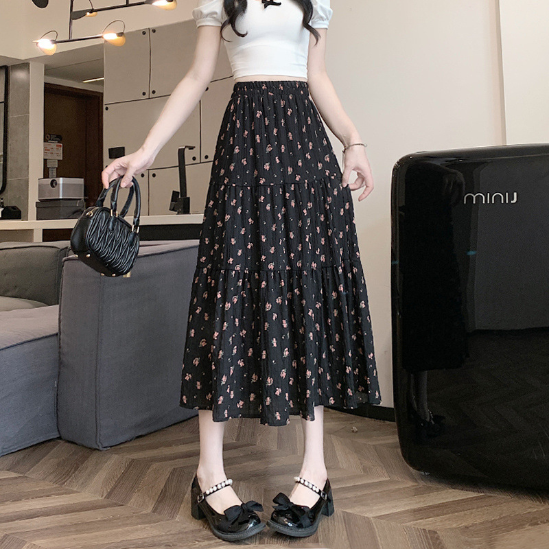 신선한 스타일 높은 허리 꽃 A-라인 쉬폰 스커트 여성의 봄과 여름 새로운 도착 대형 엉덩이 커버 대형 A-라인 중간 길이 스커트 케이크 스커트