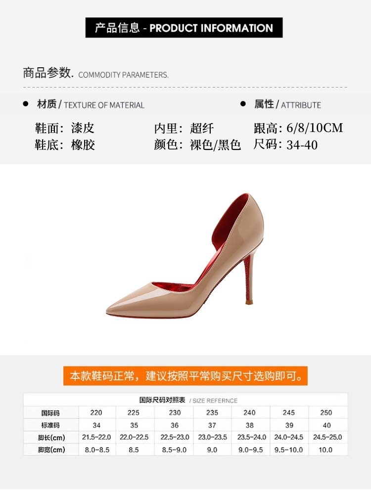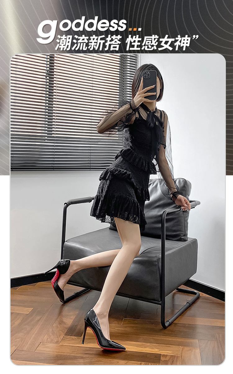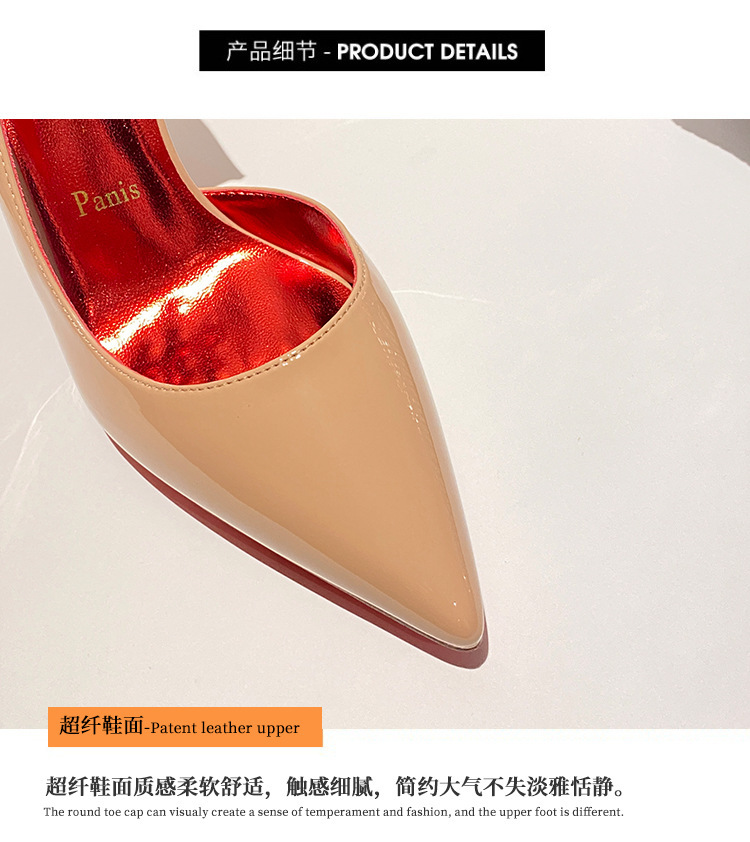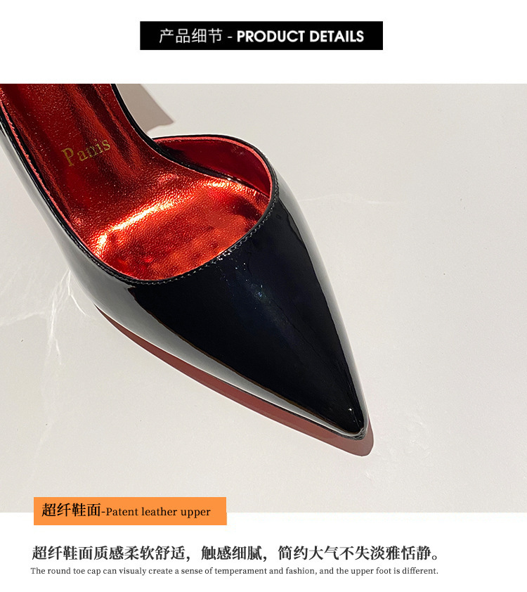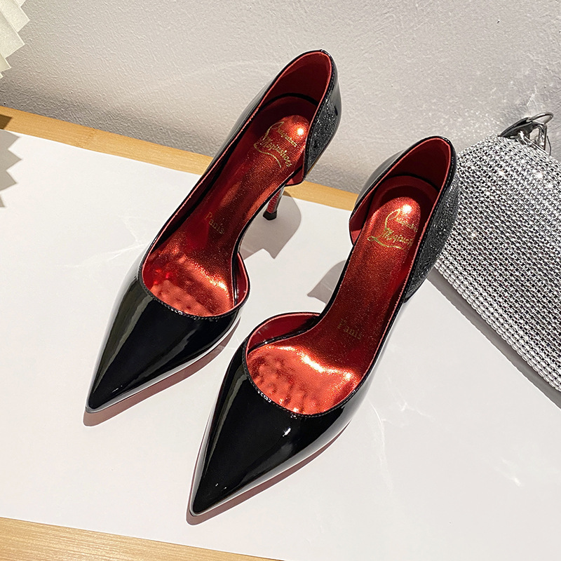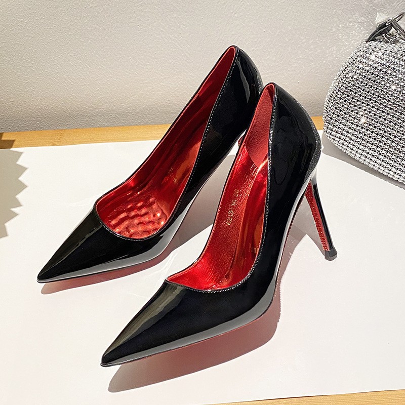 블랙 하이힐 여성 스틸레토 2025 새로운 레드 솔 신발 뾰족한 머리 라인석 얕은 입 특허 가죽 전문 사이드 빈 싱글 신발스토어 가기
