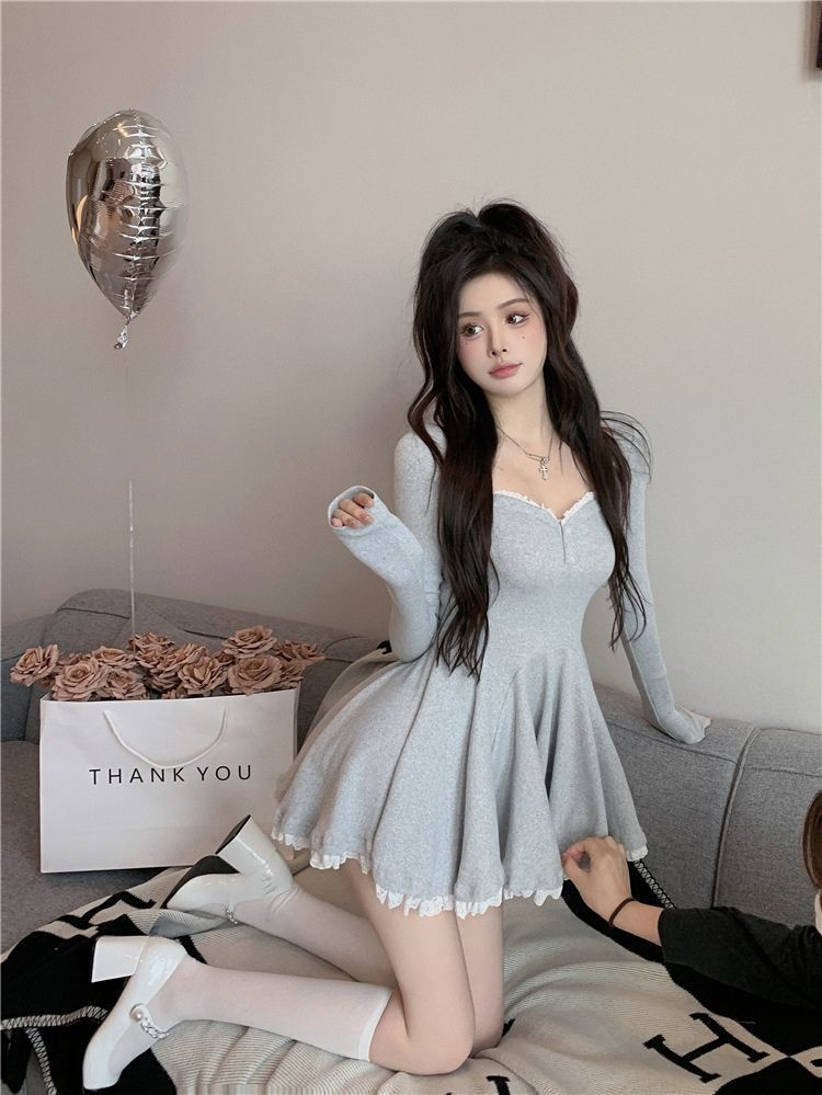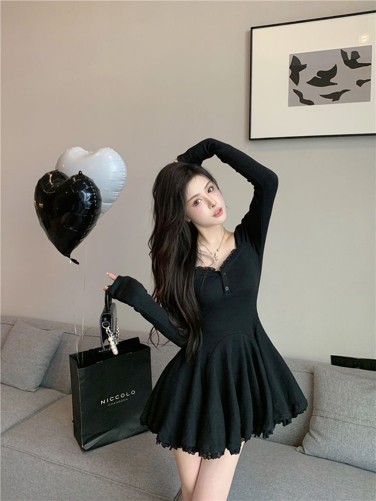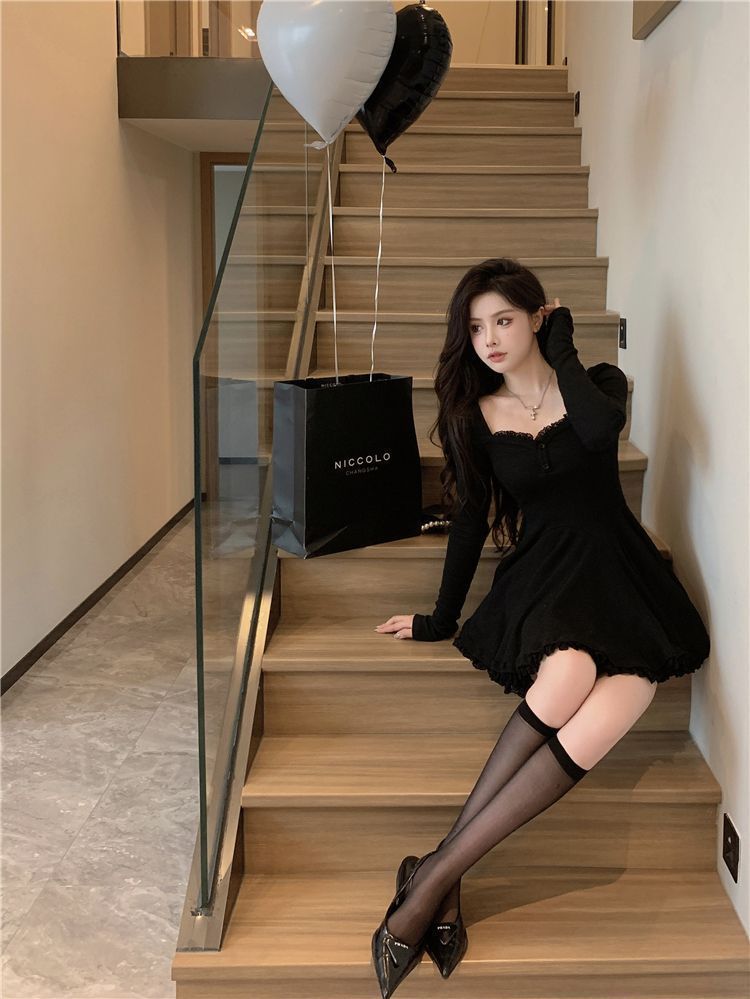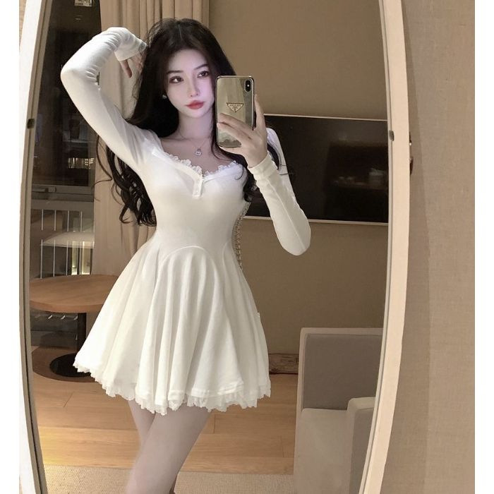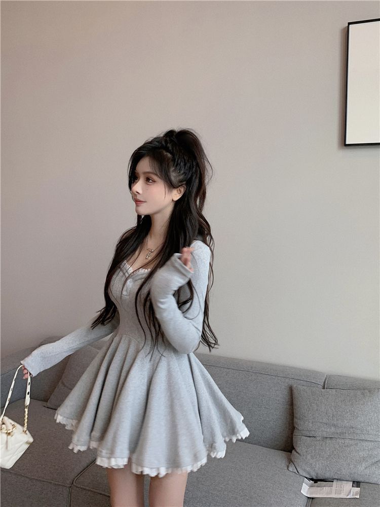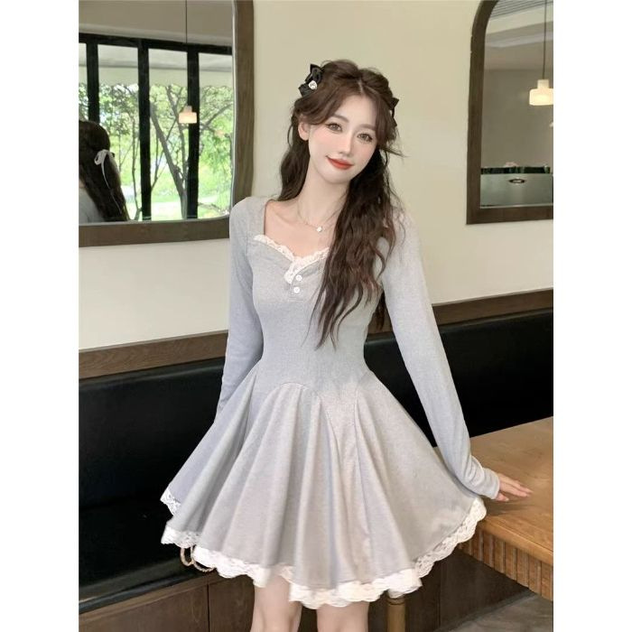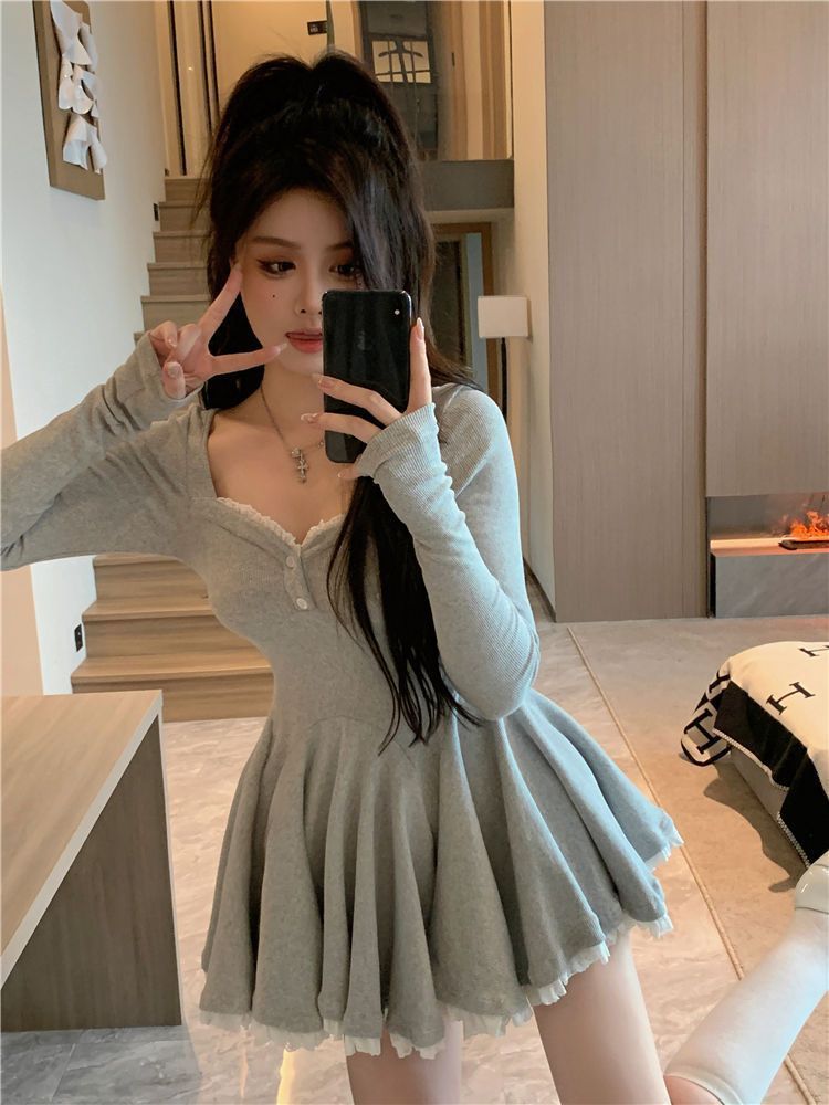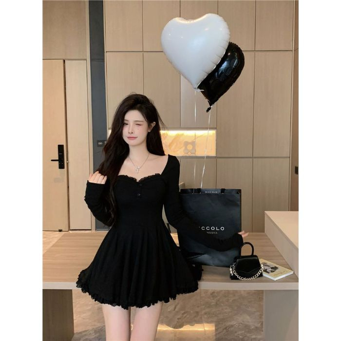 하이 퀄리티 뜨거운 뜨거운 소녀 원피스 봄과 가을 새로운 허리 우아한 주름 순수한 욕망 A 라인 엉덩이 긴 소매 치마스토어 가기