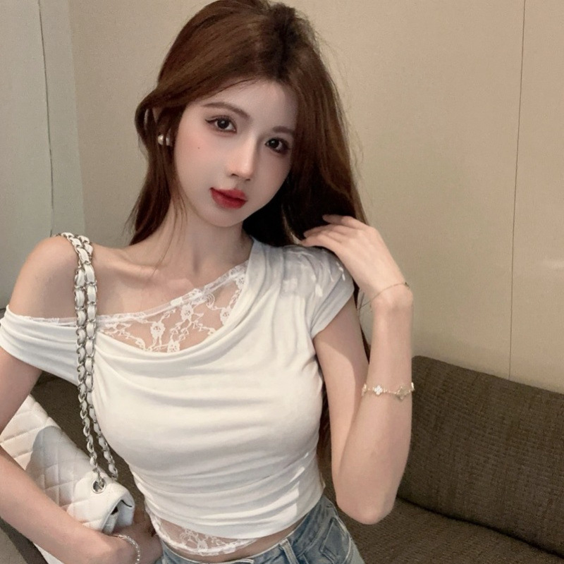 스파이스 걸 레이스 바느질 가짜 투피스 쇼트 탑 여름 새로운 스타일 세련된 스윙 칼라 비대칭 슬랜트 숄더 반팔 티셔츠스토어 가기