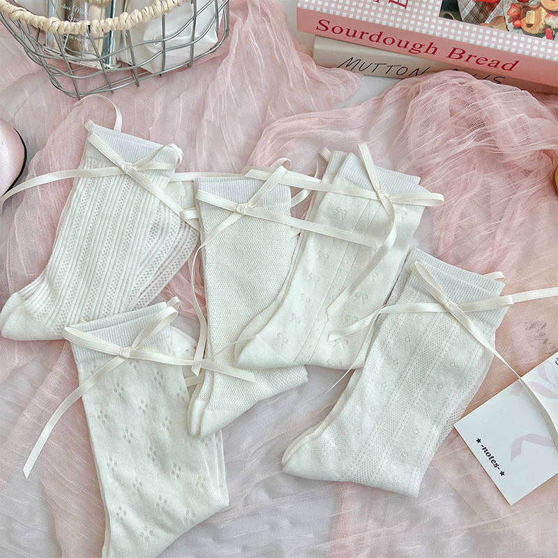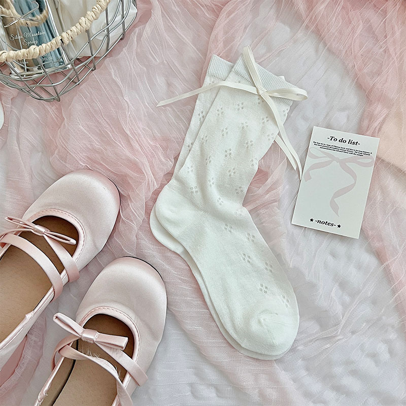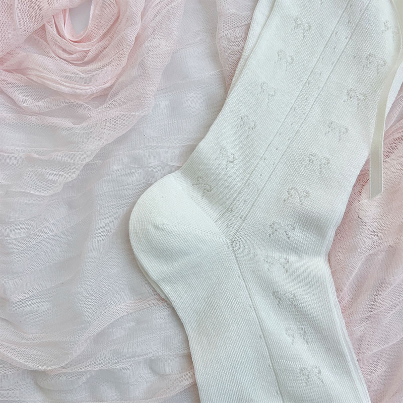 한국 스타일 소녀 화이트 리본 활 양말 여자 봄과 여름 올매치 얇은 일본식 여성 할로우 스타킹스토어 가기