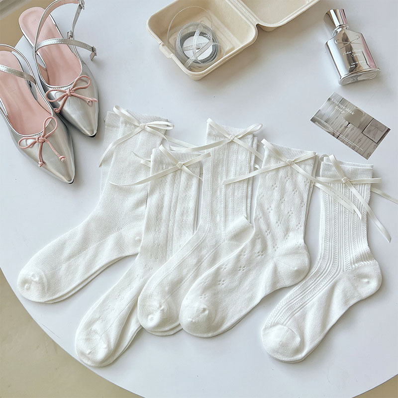 한국 스타일 소녀 화이트 리본 활 양말 여자 봄과 여름 올매치 얇은 일본식 여성 할로우 스타킹