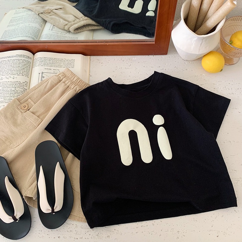 남자들의 여름 반소매 티셔츠 블랙 2025 어린이 여름 서양식 느슨한 반소매 티셔츠 소년 편지 탑
