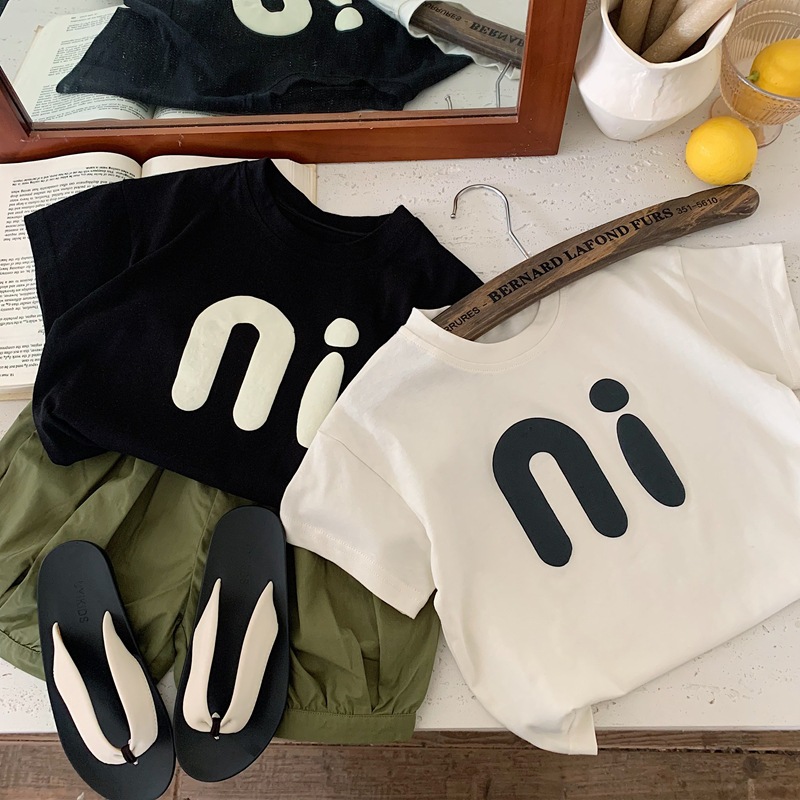 남자들의 여름 반소매 티셔츠 블랙 2025 어린이 여름 서양식 느슨한 반소매 티셔츠 소년 편지 탑스토어 가기