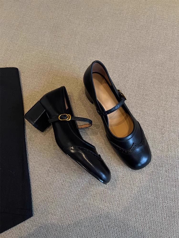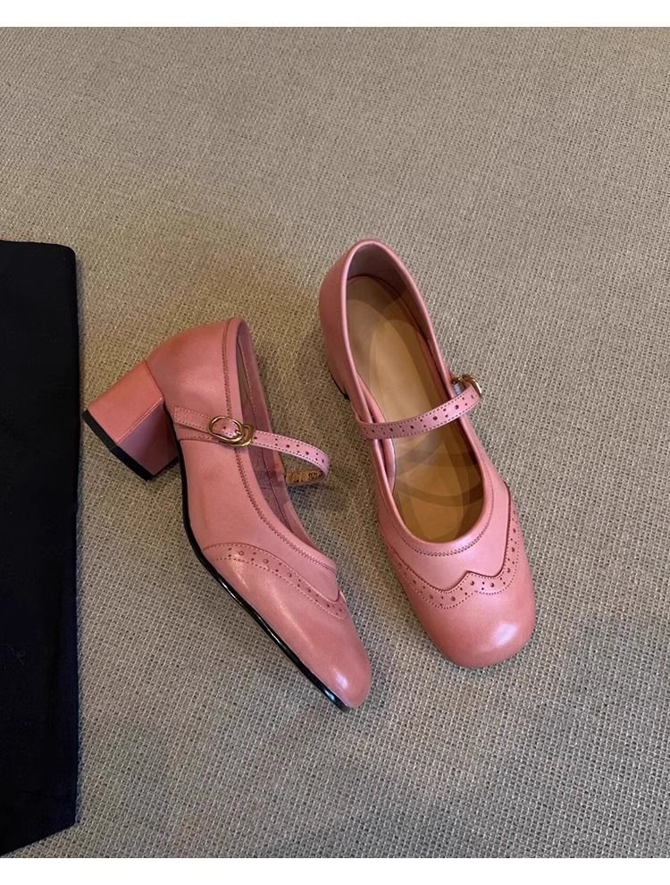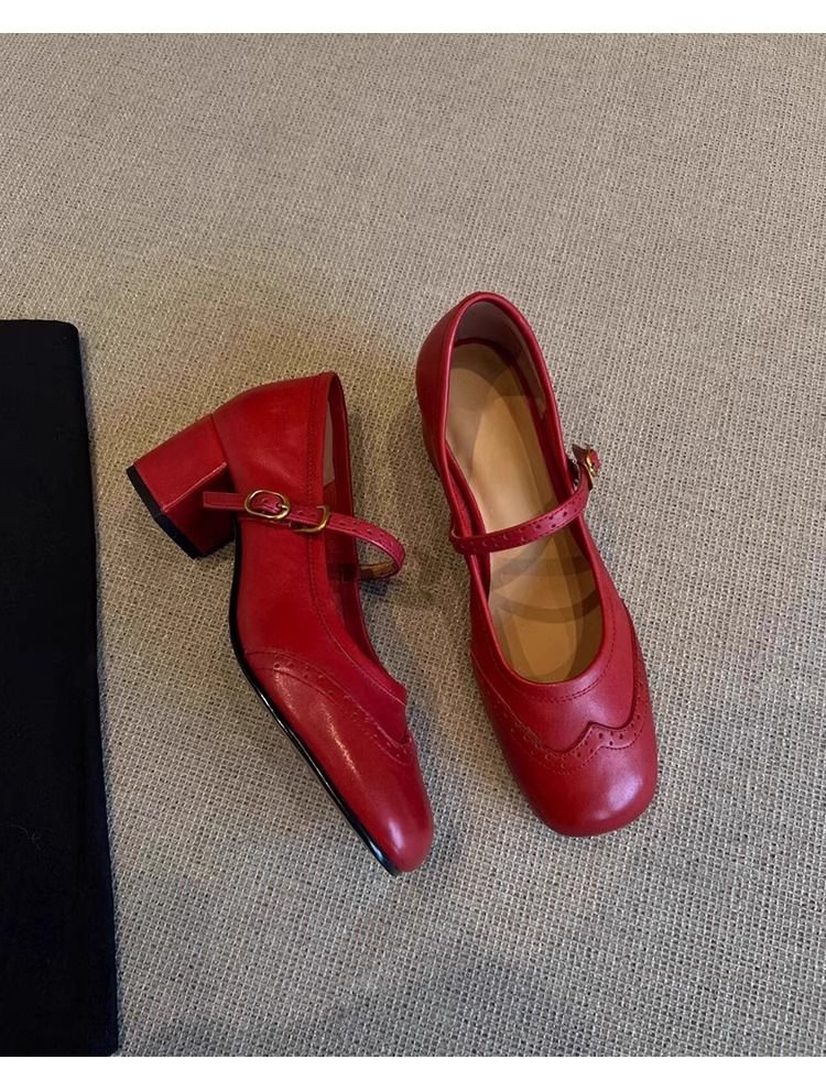 여성용 봄 발레 신발 레드 하이힐 2025 한 단어 얕은 입 벨트 새로운 두꺼운 힐 조각 프랑스 빈티지스토어 가기