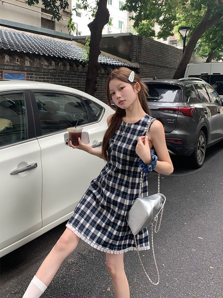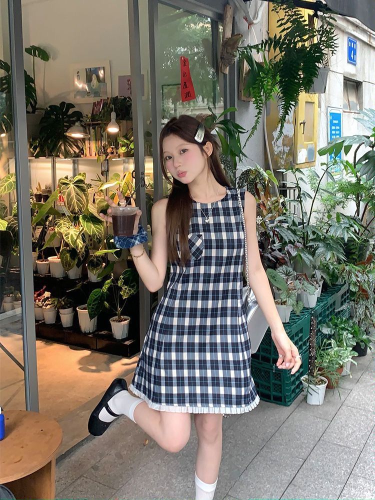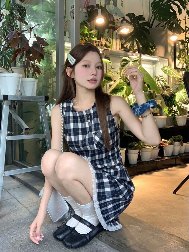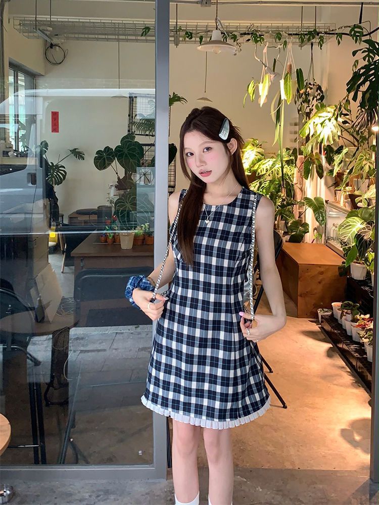 달콤한 쿨 스타일 레이스 바느질 격자 무늬 조끼 원피스 여성 여름 새로운 디자인 센스 세련된 슬리밍 니쉬 스커트스토어 가기