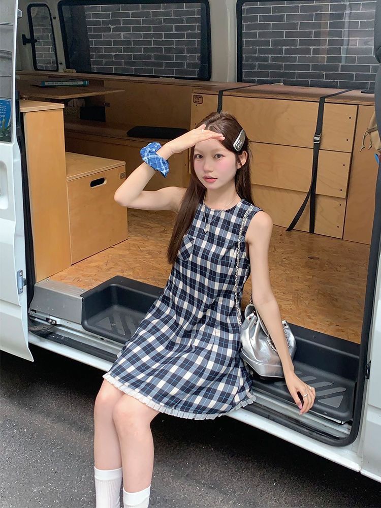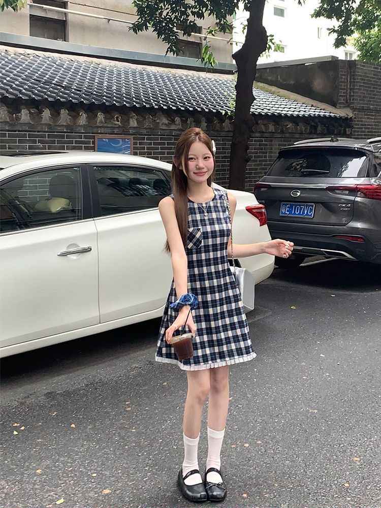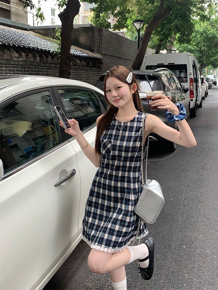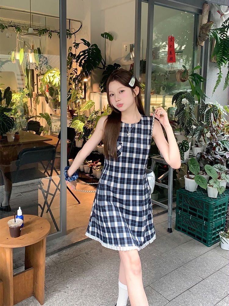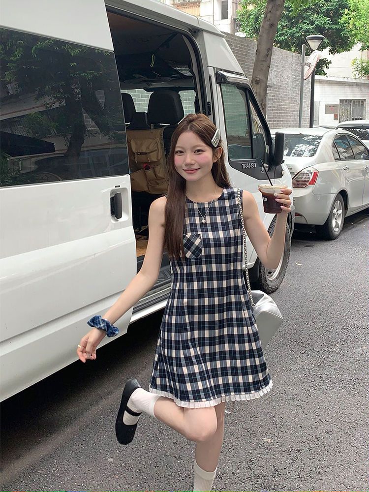 달콤한 쿨 스타일 레이스 바느질 격자 무늬 조끼 원피스 여성 여름 새로운 디자인 센스 세련된 슬리밍 니쉬 스커트스토어 가기