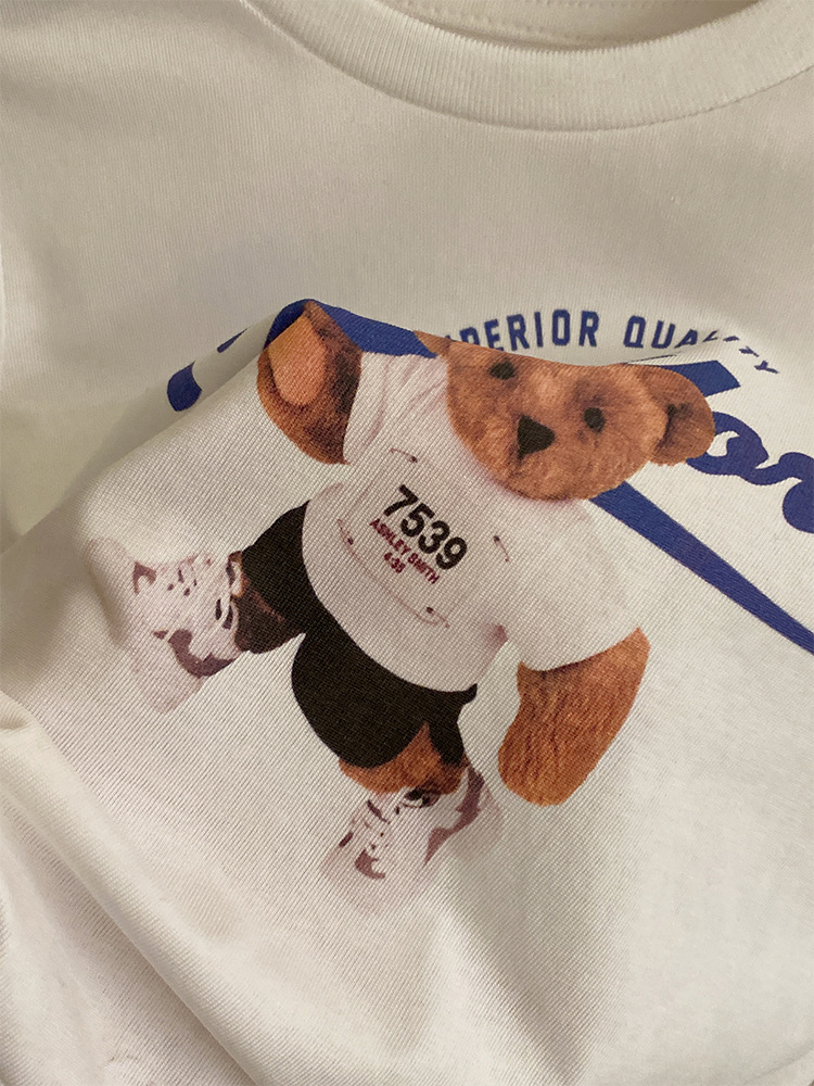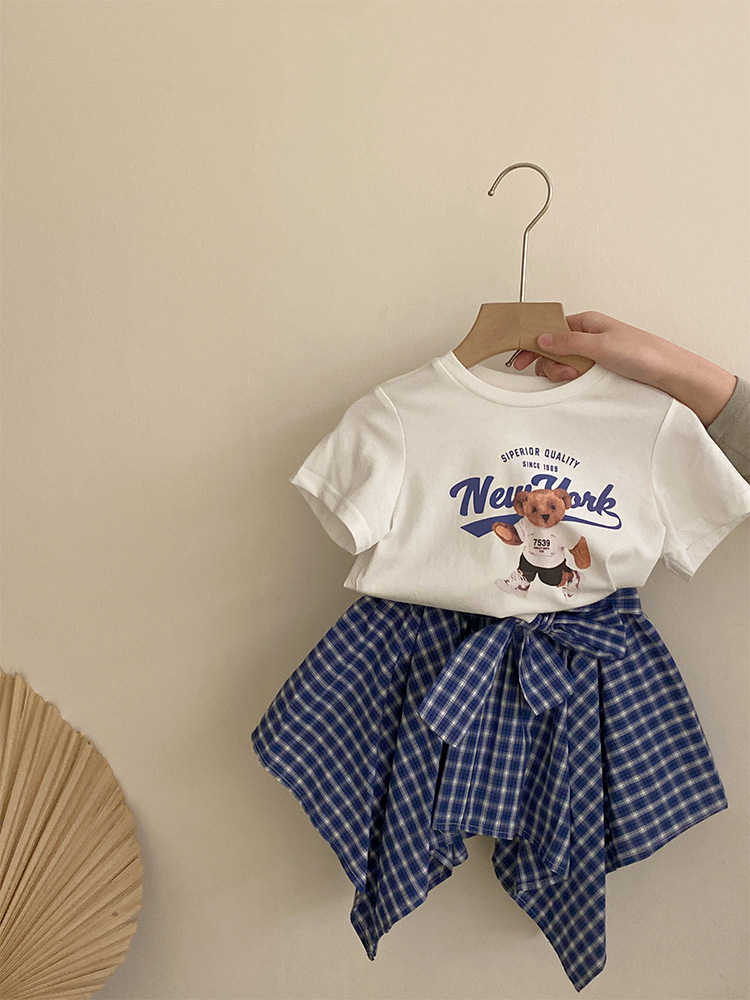 여자 한국식 2025 여름 새 곰 무늬 반팔 탑, 격자 무늬 활로 올매치 불규칙한 치마