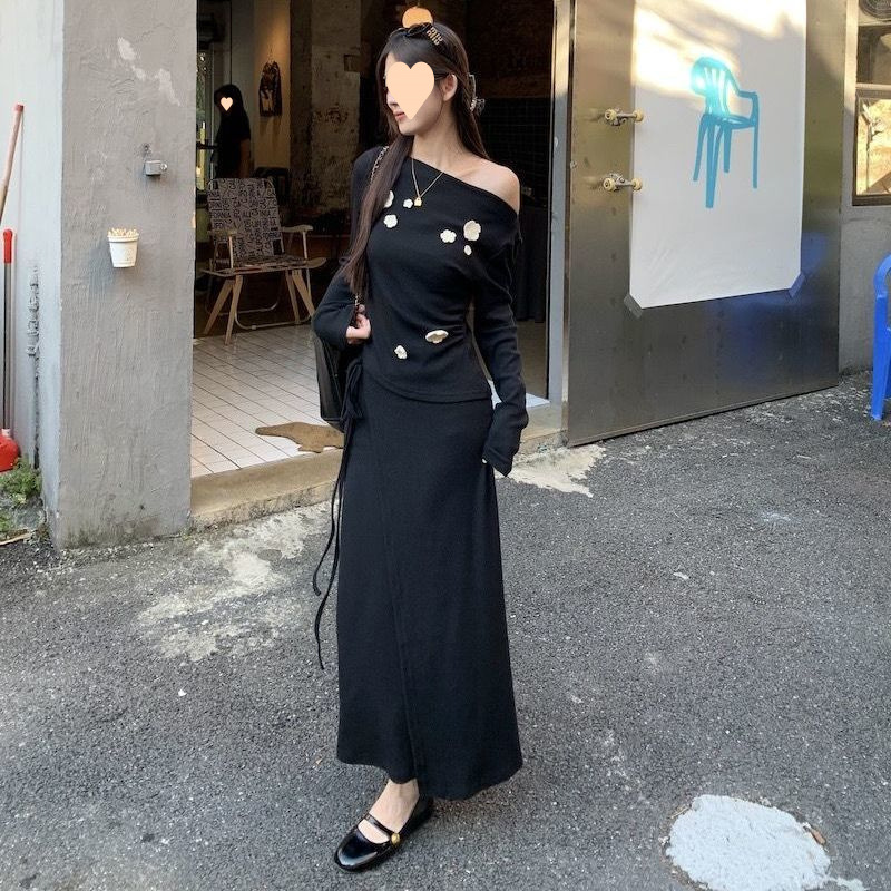우아한 하이 엔드 패션 세트 여성의 가을과 겨울 새로운 3 차원 꽃 슬란 숄더 탑 스트랩 스커트 투피스 세트스토어 가기